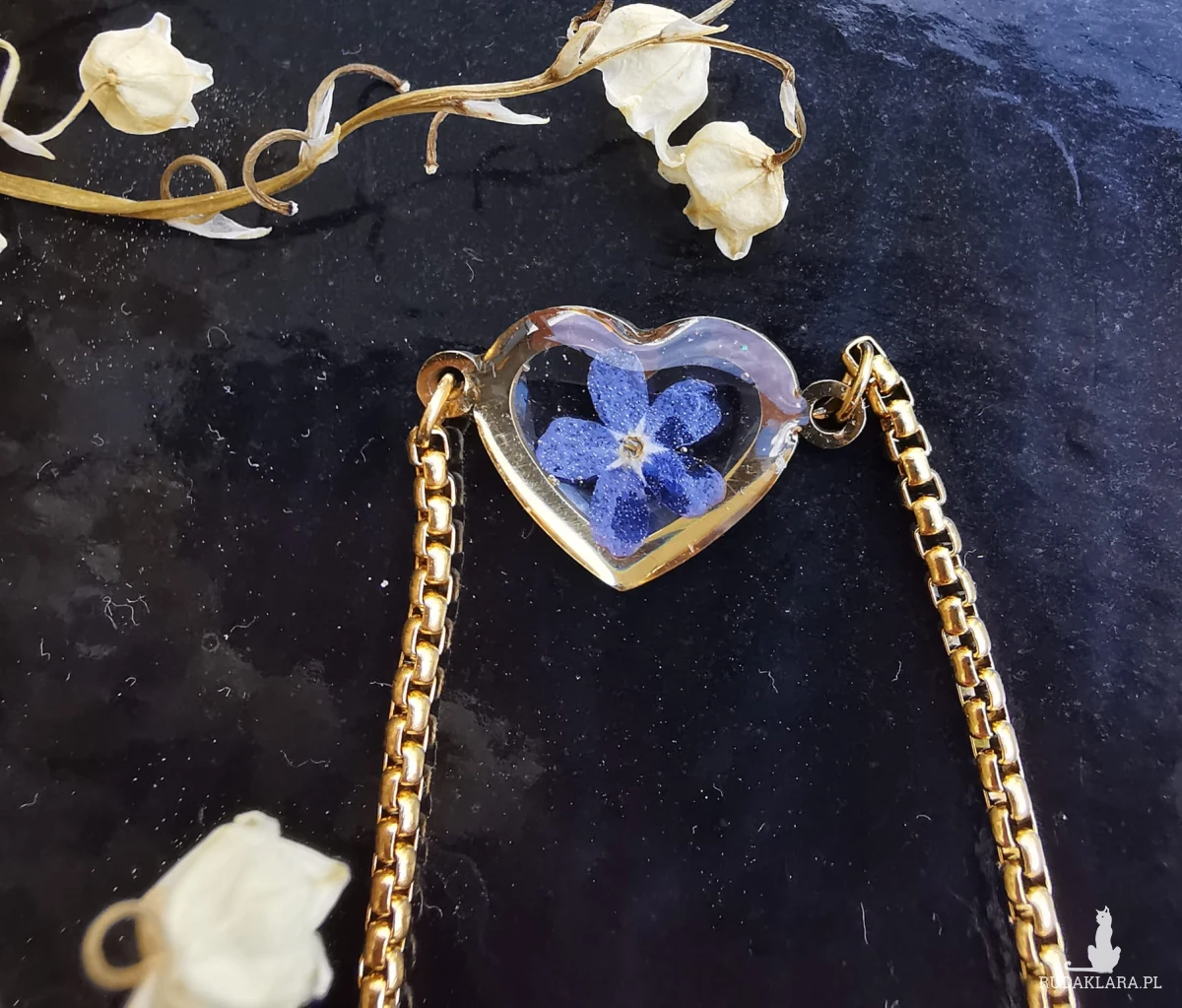 Bransoletka na złotej stali. W środku jest zatopiona prawdziwa suszona niezapominajka, wymiary oczka to 15*10mm.