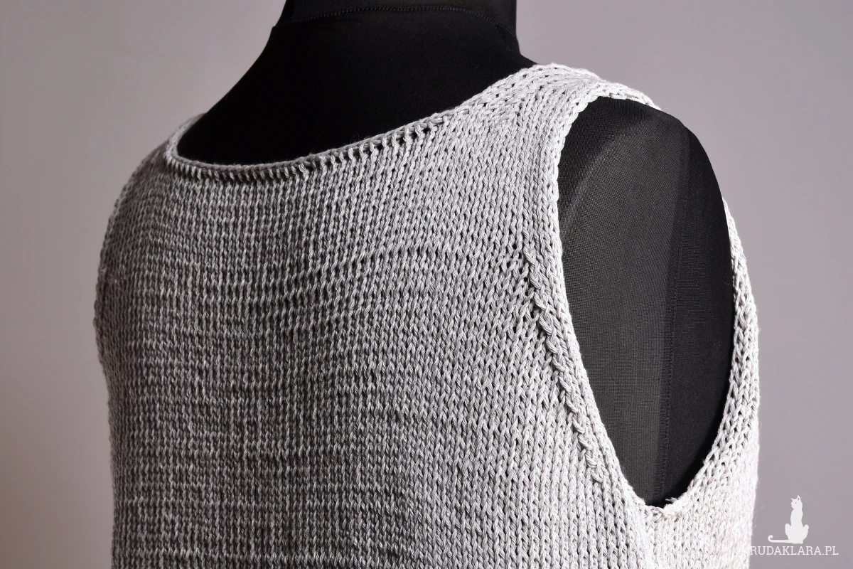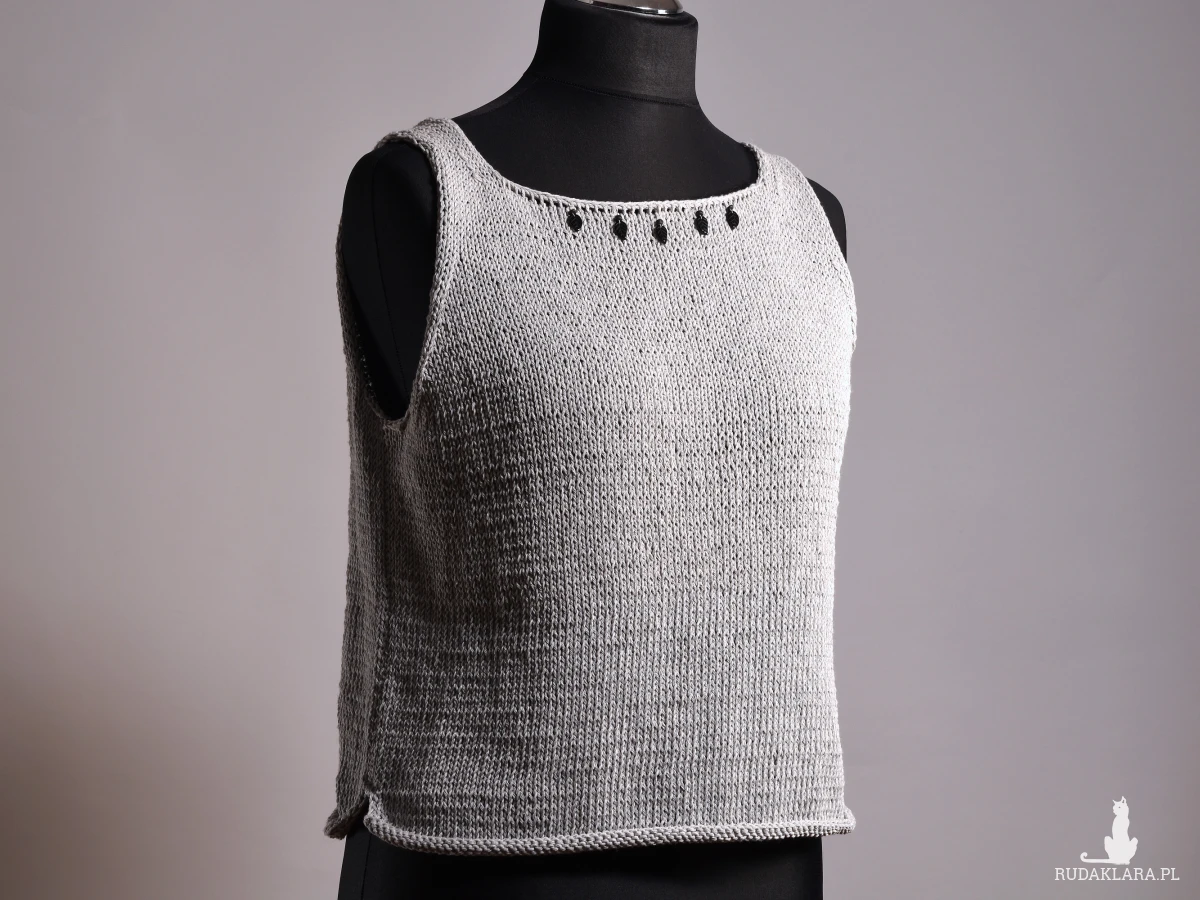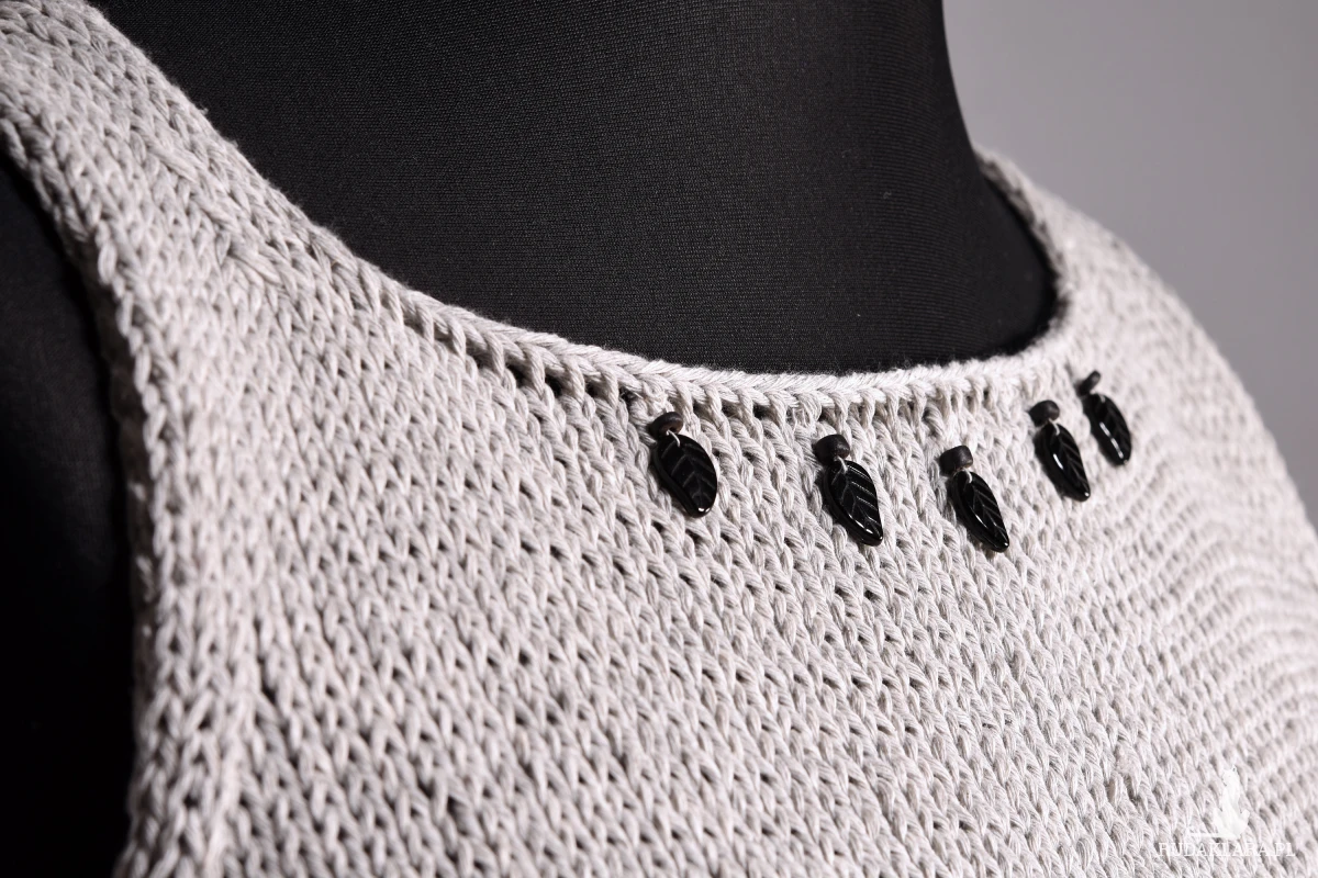 Top zrobiony ręcznie, zrobiony na drutach. Bluzka na ramiączkach z dekoltem w „łódkę”. Dodatkowym elementem dekoracyjnym są doszyte tuż pod dekoltem szklane korale w kształcie liści. Dolna część bluzki wykończona podwijającym się brzegiem. Prosta i elegancka bluzka na sezon letni. Top jest zrobiony z włóczki bawełnianej, lekkiej i przyjemnej dla skóry.