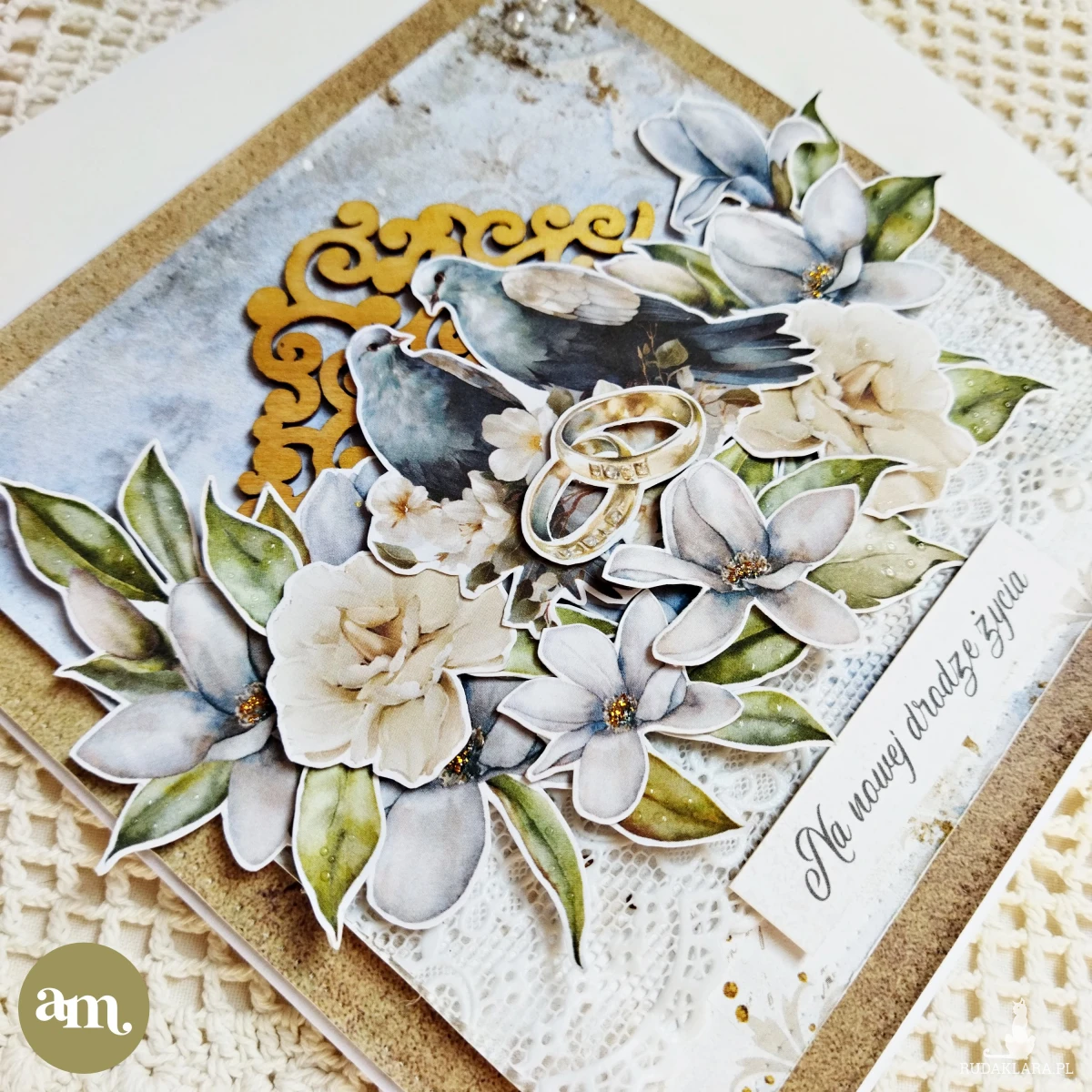 Elegancka kartka ślubna, która będzie idealna na zimowy jesienny bądź zimowy ślub. Utrzymana w lekko zgaszonej niebiesko-zielonej kolorystyce. Kartka została ozdobiona elementem ze sklejki pomalowanym na złoty kolor, kompozycją z papierowych kwiatów, dwoma gołąbkami oraz obrączkami. Napis "Na nowej drodze życia" jest tu dla przykładu. Na życzenie klienta mogę go zamienić na np. imiona nowożeńców. Całość kompozycji dopełniają białe pół-perełki oraz kropelki "rosy" na listach i brokatu wewnątrz kwiatów.