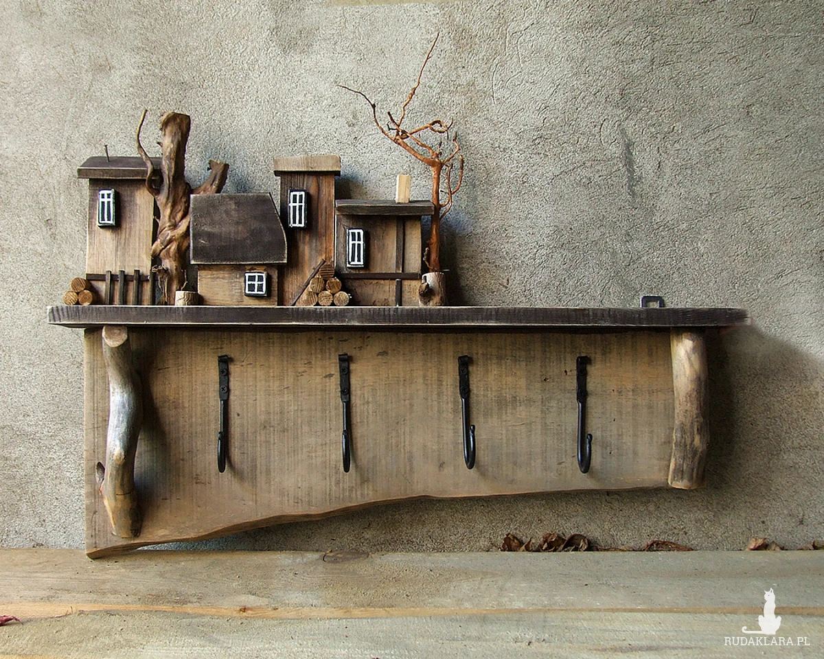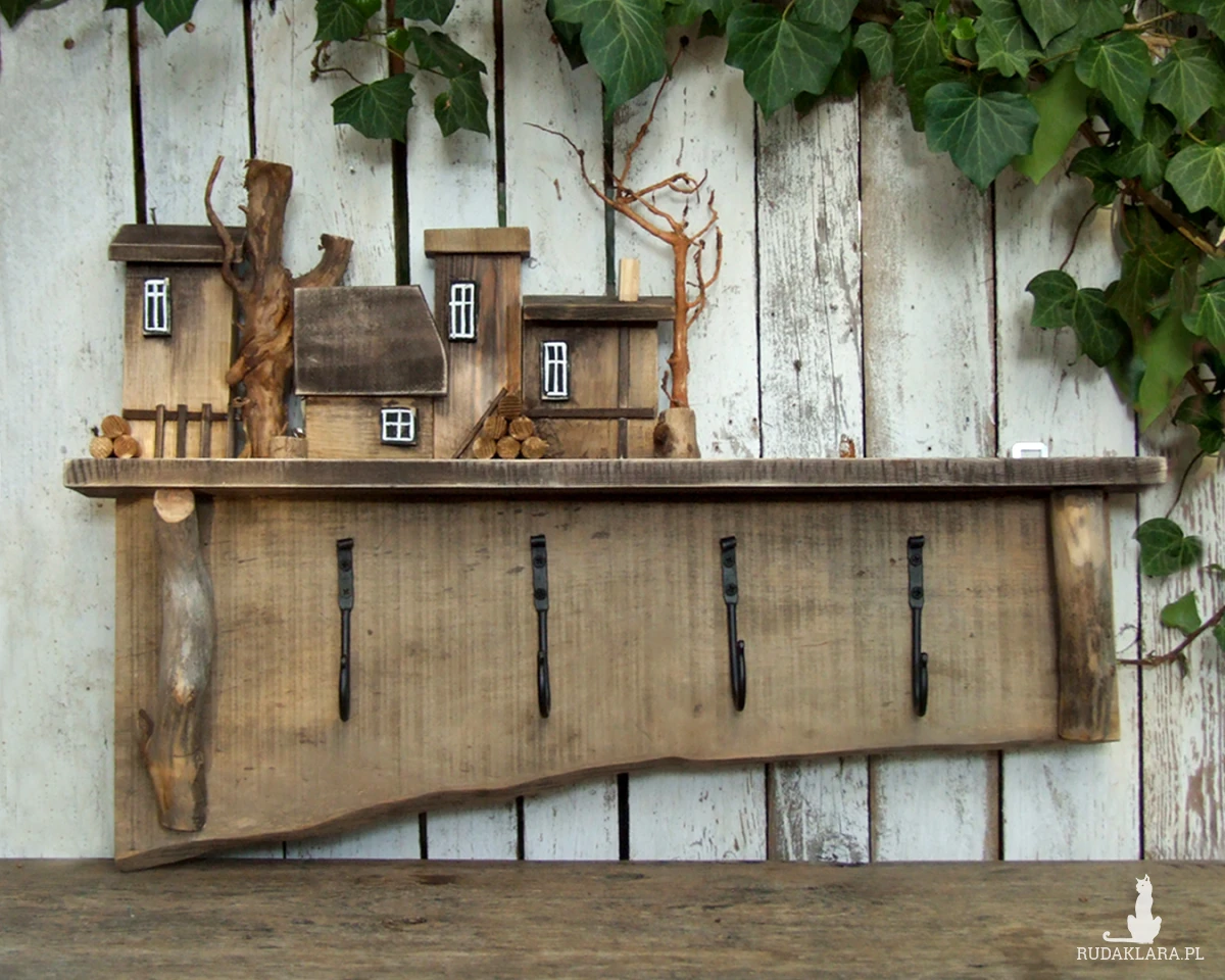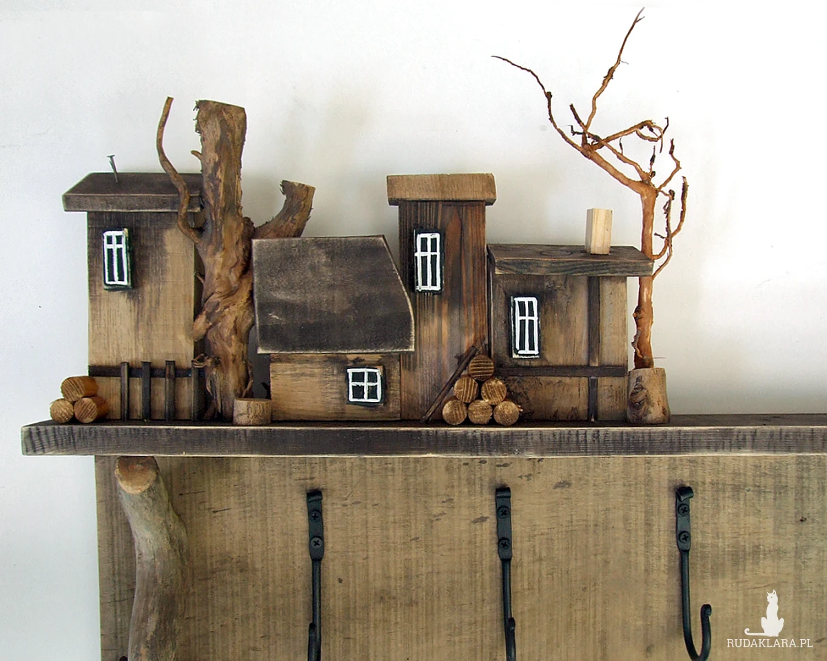 Do budowy tego wieszaka wykorzystaliśmy starą sosnową deskę o nierównej szerokości i ładnym nieregularnym brzegu. Dodatkowe elementy to naturalne gałązki, kóre imitują drzewa i które posłużyłe jako wsporniki pod półeczkę, na której stoi drewniana osada.
