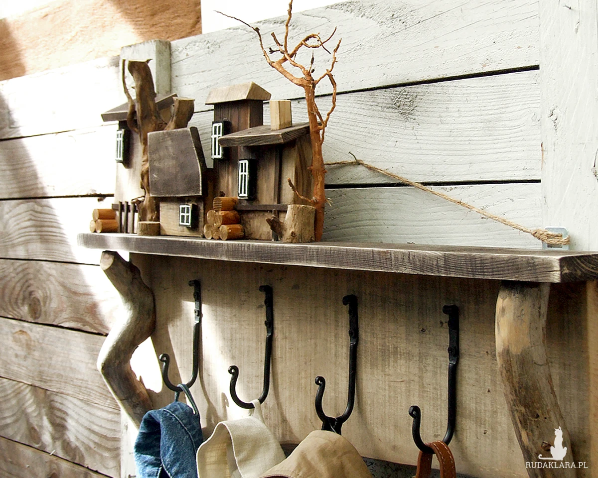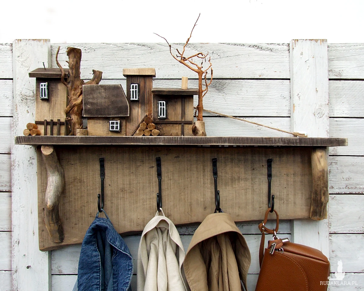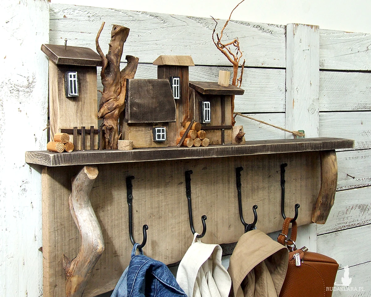 Do budowy tego wieszaka wykorzystaliśmy starą sosnową deskę o nierównej szerokości i ładnym nieregularnym brzegu. Dodatkowe elementy to naturalne gałązki, kóre imitują drzewa i które posłużyłe jako wsporniki pod półeczkę, na której stoi drewniana osada.