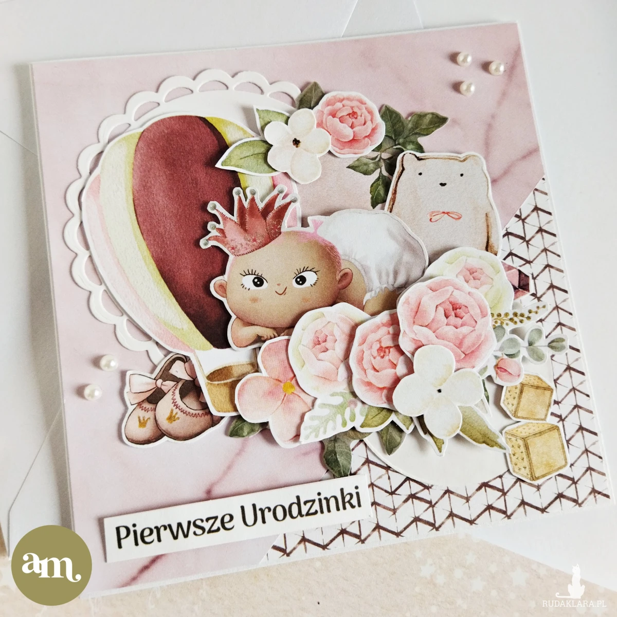 Przedstawiam przeuroczą kartkę z motywem malutkiej dziewczynki w koronie, otoczonej kwiatami i pasującym kolorystycznie balonem.