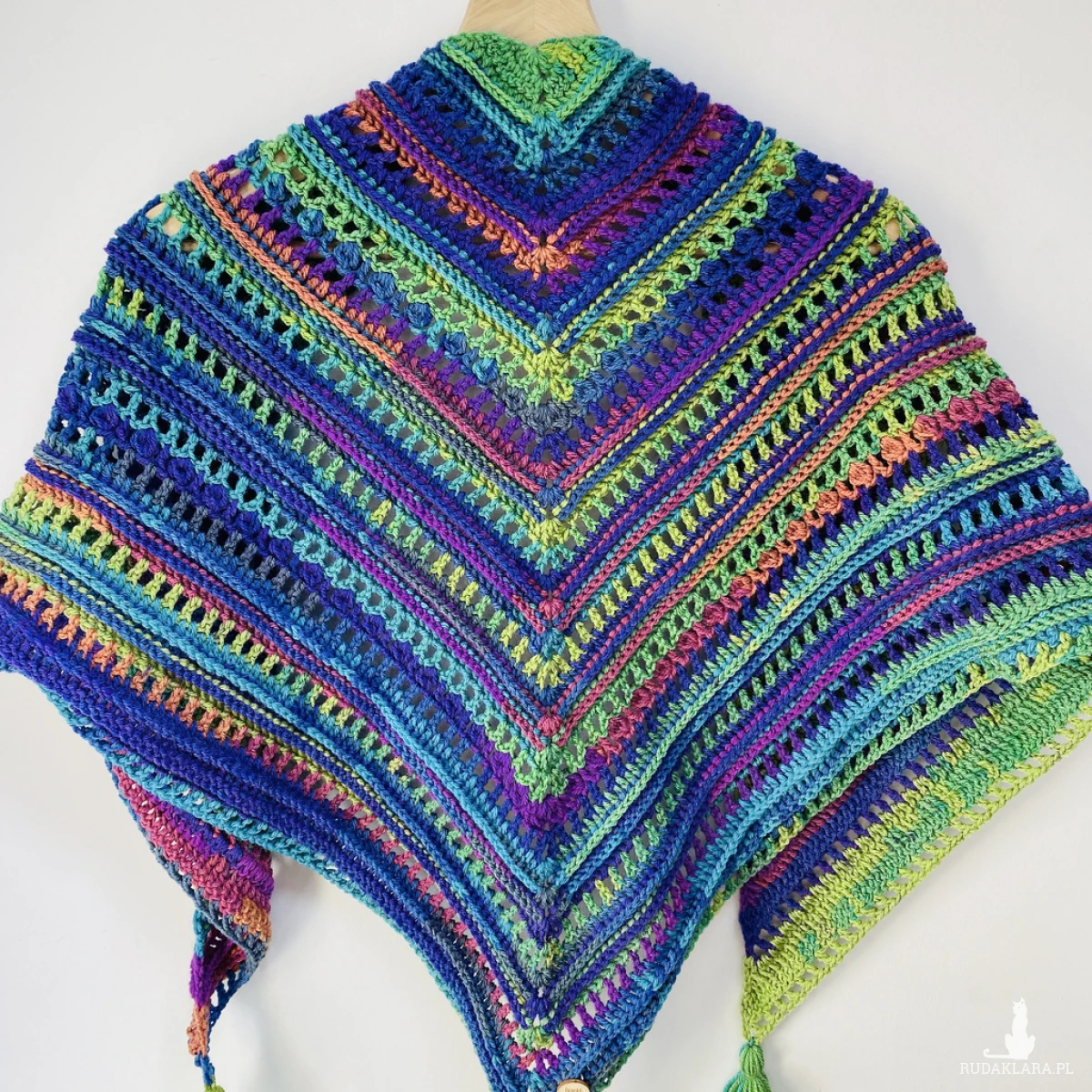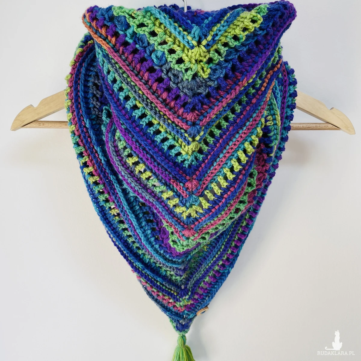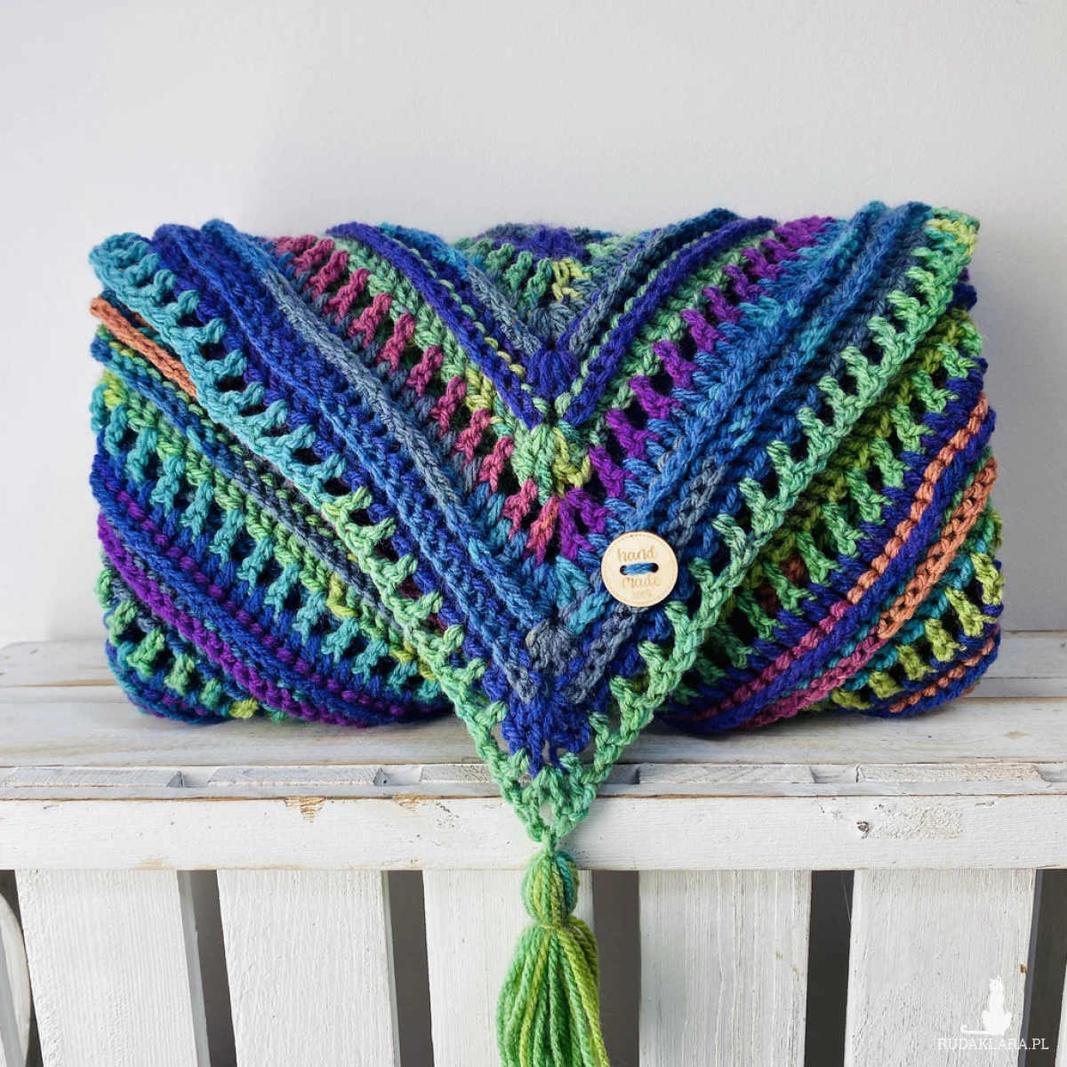 Chustę wykonałam na szydełku z miękkiej włóczki akrylowej, która zachwyca intensywnością koloru i delikatnością. Certyfikat OEKO-TEX® Standard 100 potwierdza, że jest bezpieczna dla a zdrowia materiały użyte do jej produkcji są wolne od szkodliwych substancji chemicznych.