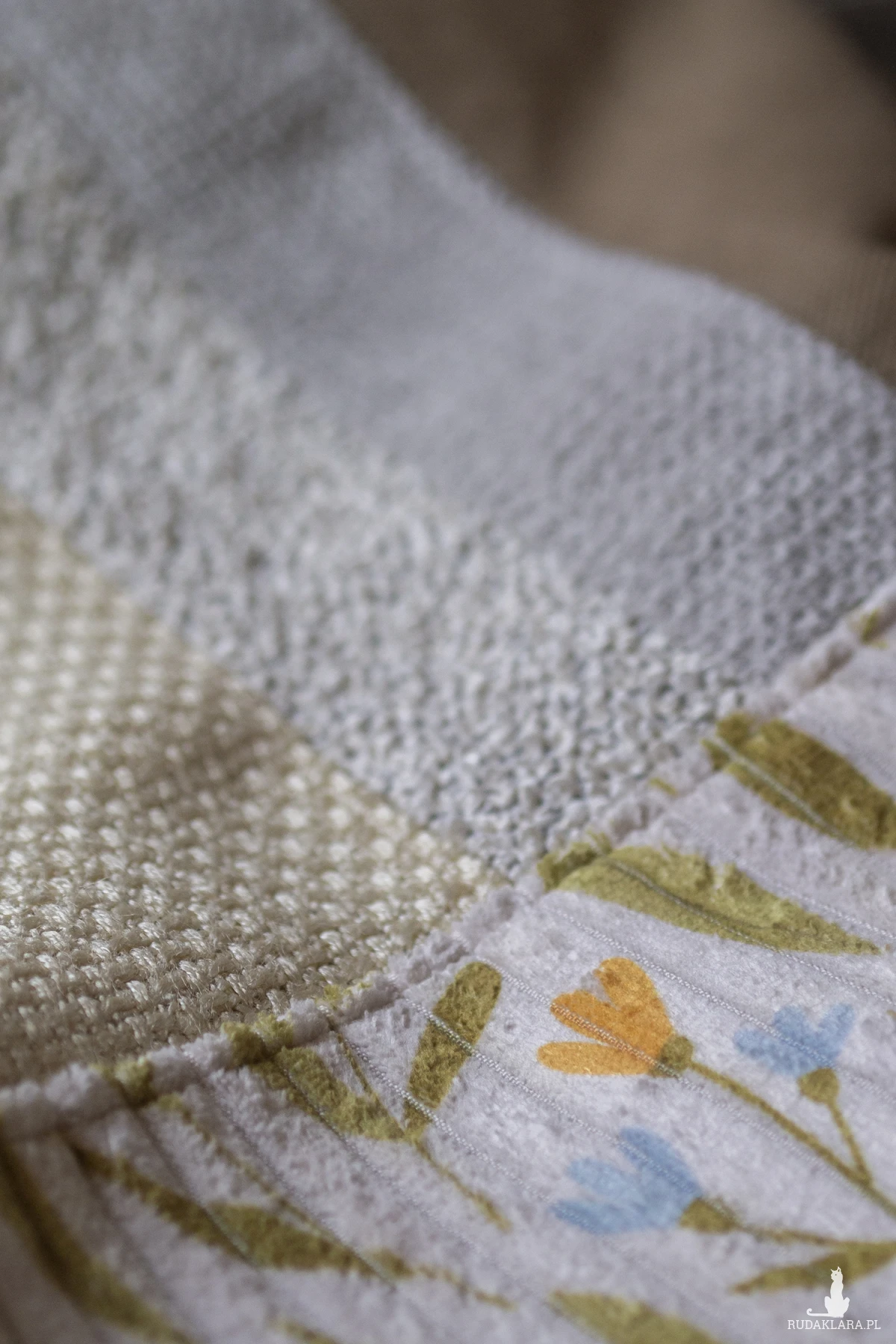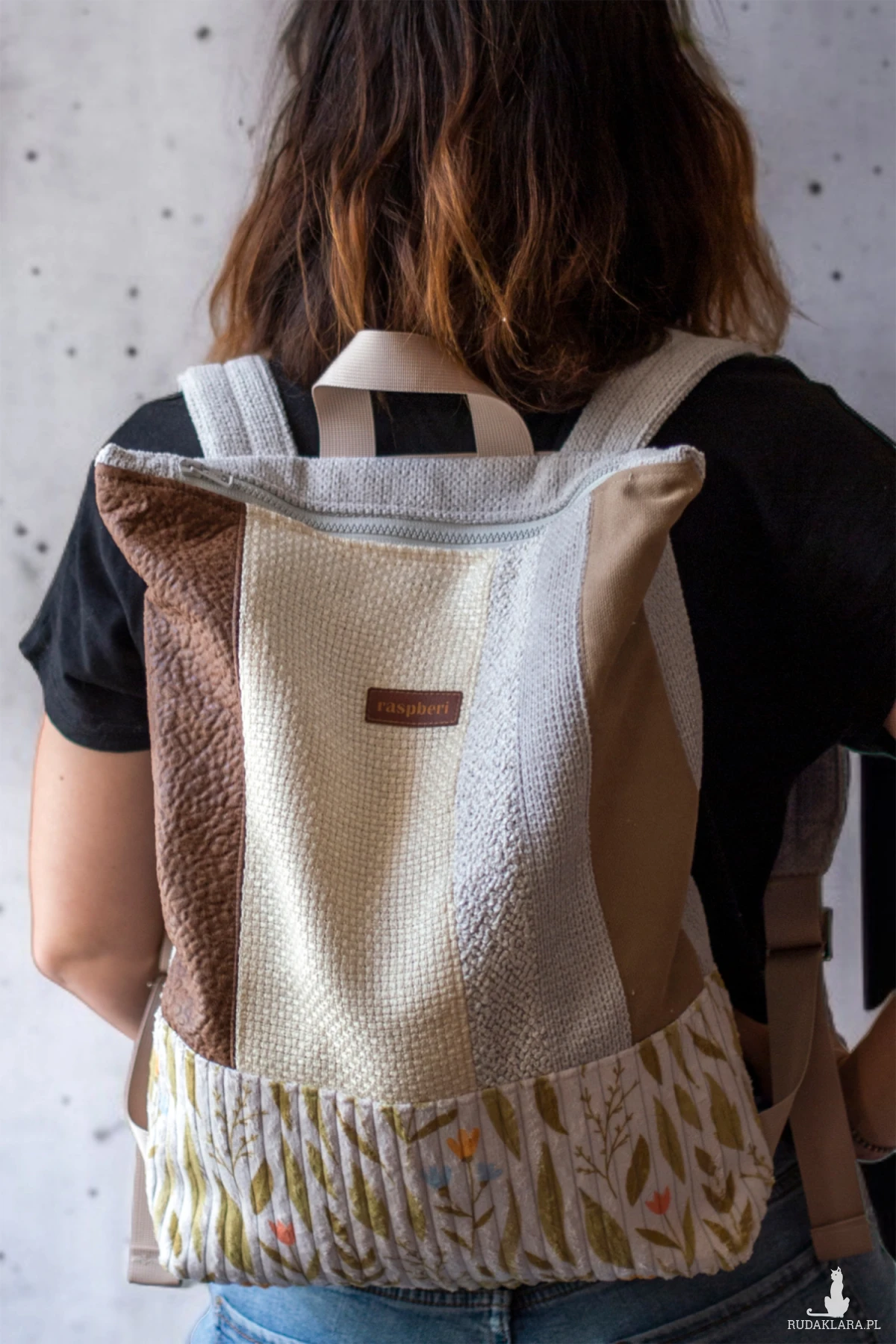 Duży, damski plecak miejski zapinany na suwak z kilku rodzajów kolorowych tkanin w połączeniu z grubym sztruksem w kwiaty.