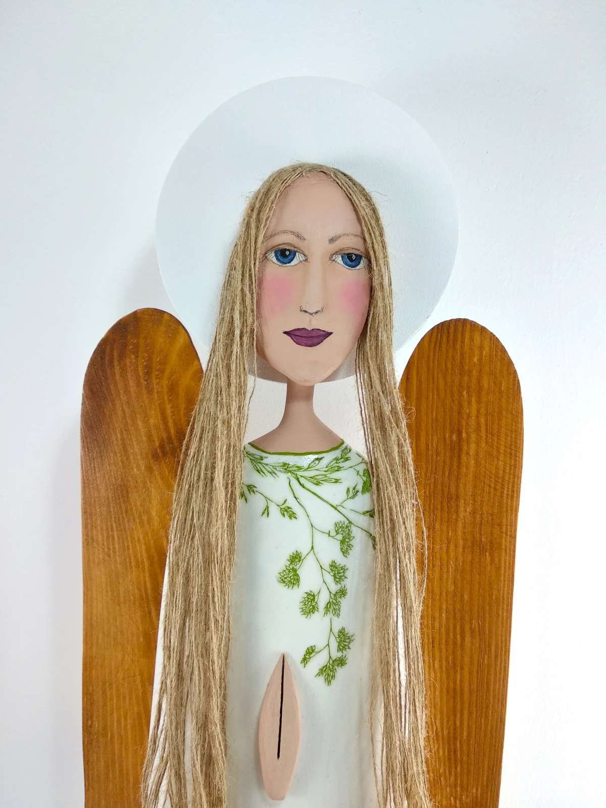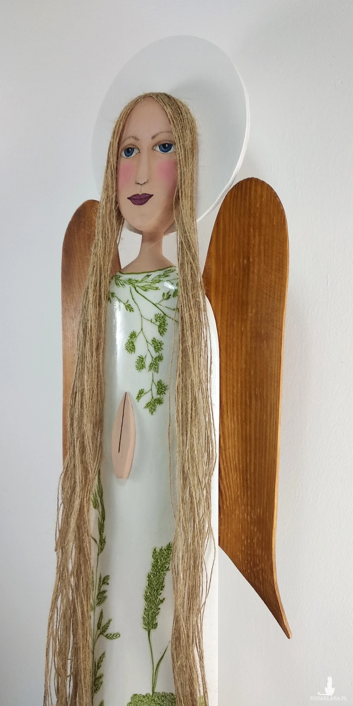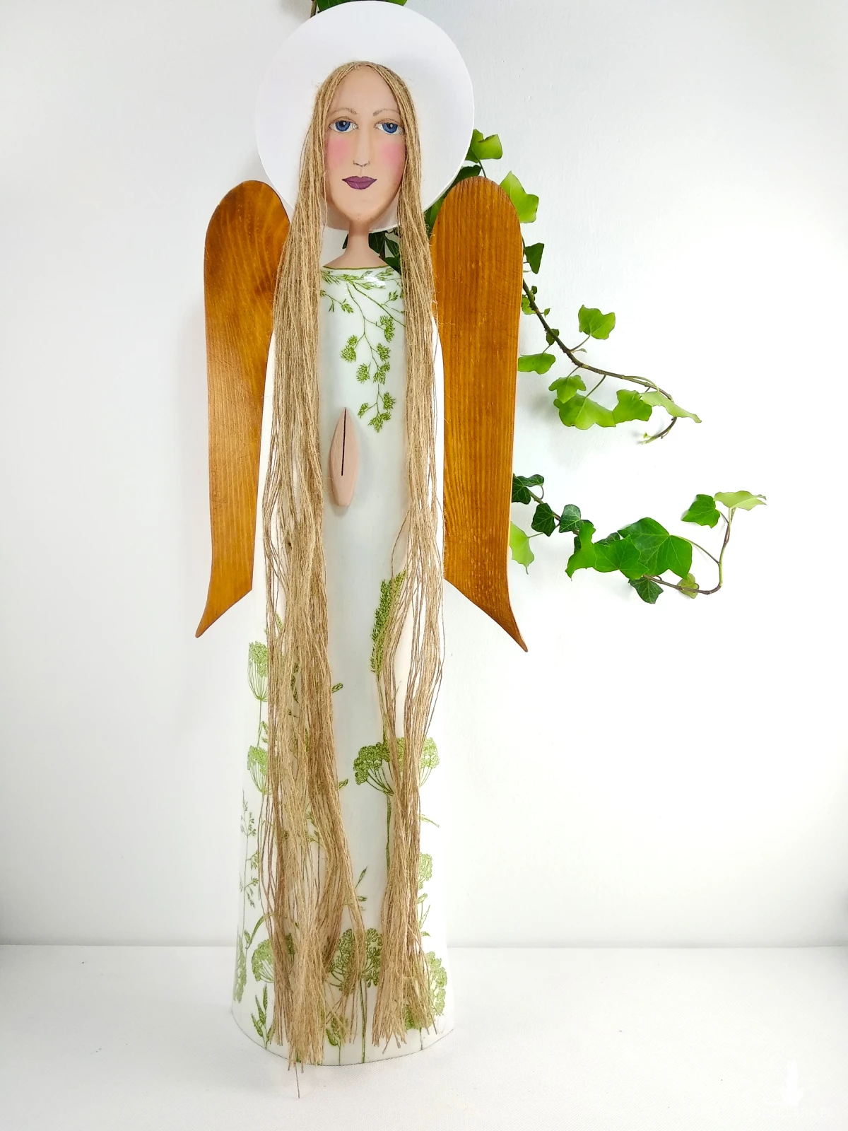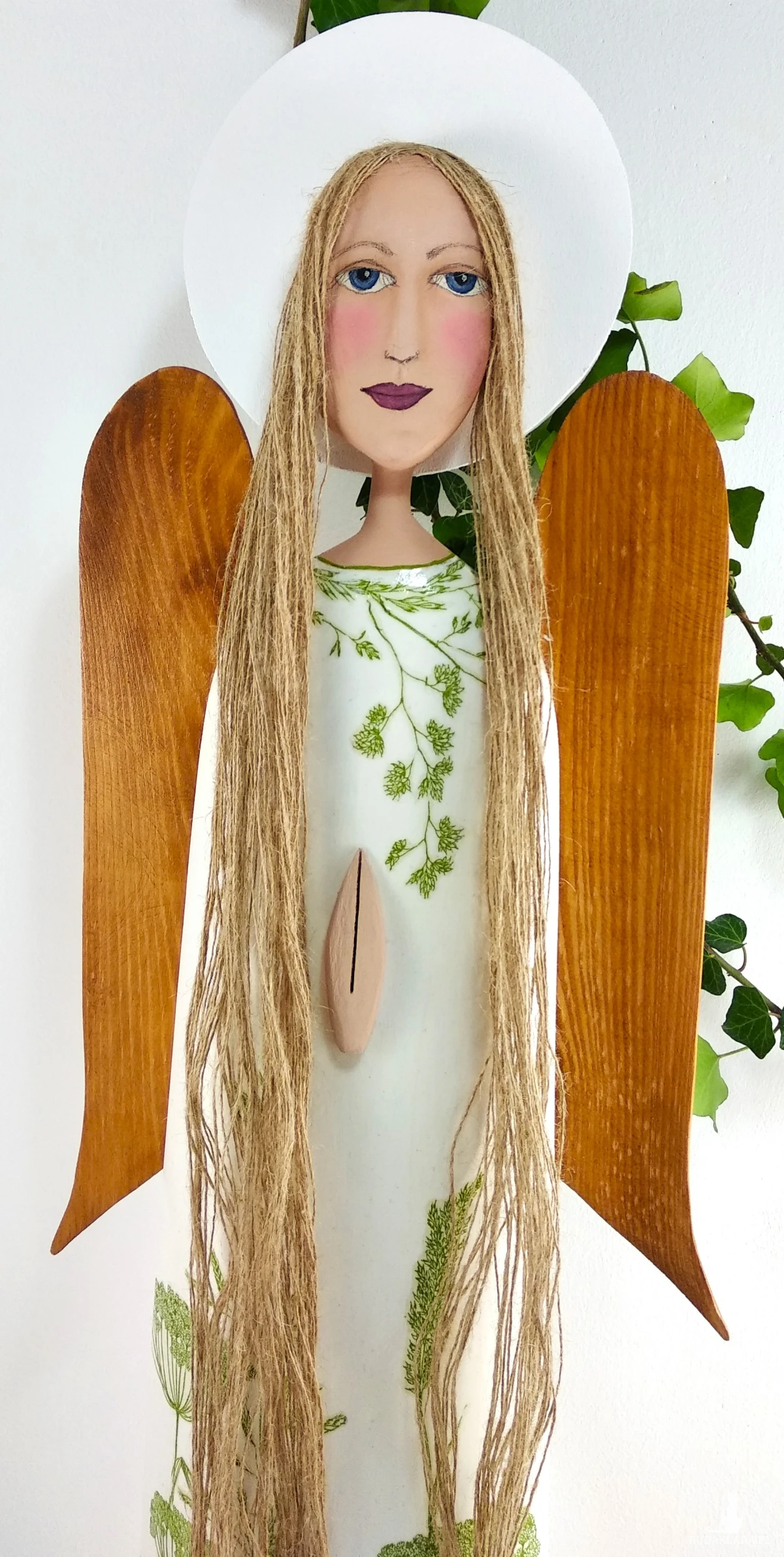 Drewniane skrzydła w naturalnym kolorze oraz jutowe włosy podkreślają organiczny charakter anioła. Twarz pełna spokoju i łagodności sprawia, że dekoracja wprowadza do wnętrza poczucie ciszy i ukojenia — jakby niosła ze sobą szept łąkowego wiatru.