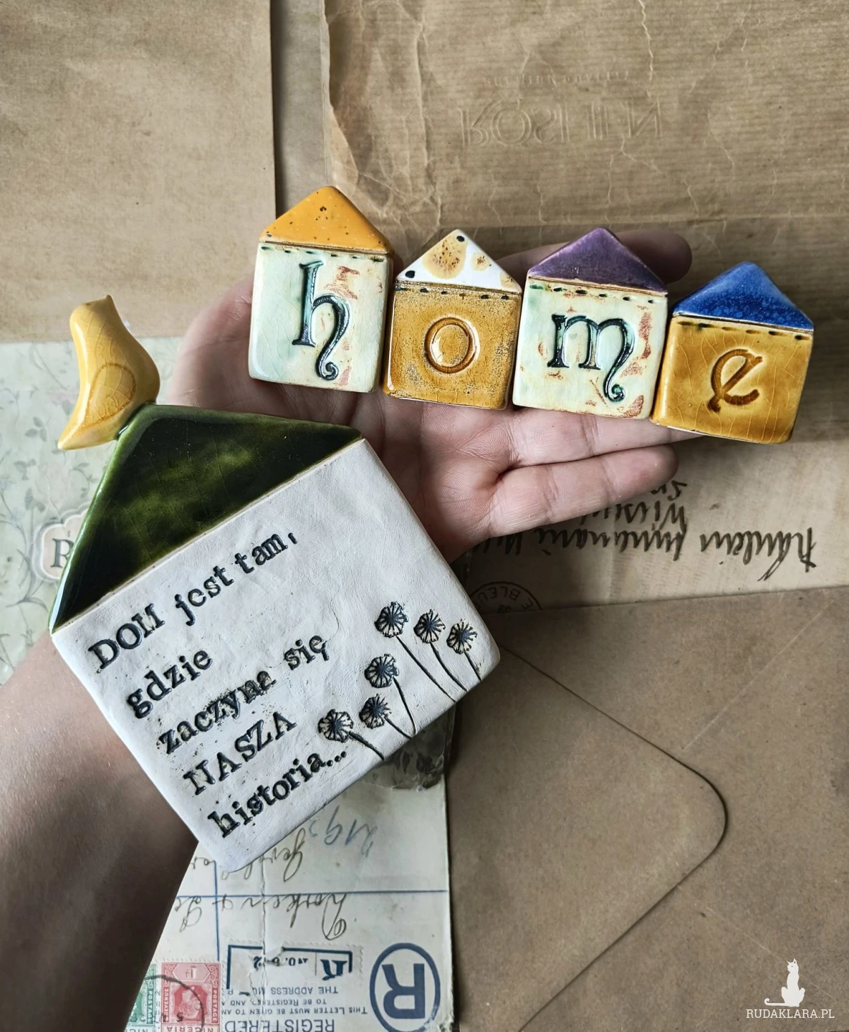 Zestaw 4 kolorowych domków z napisem HOME o wymiarach ok 3,5 cm x 4,5 cm. Polecam serdecznie. Domek z sentencją o wymiarach ok 9 cm x 12 cm. serdecznie polecam.