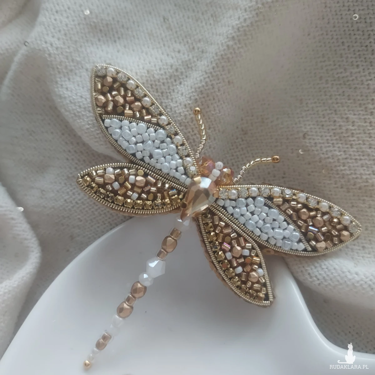 Broszka ważka w kolorze perłowo-złotym - wiosenno-letnie szaleństwo piękna oraz delikatności. Broszka powstała haftem koralikowym z dbałością o każdy szczegół.