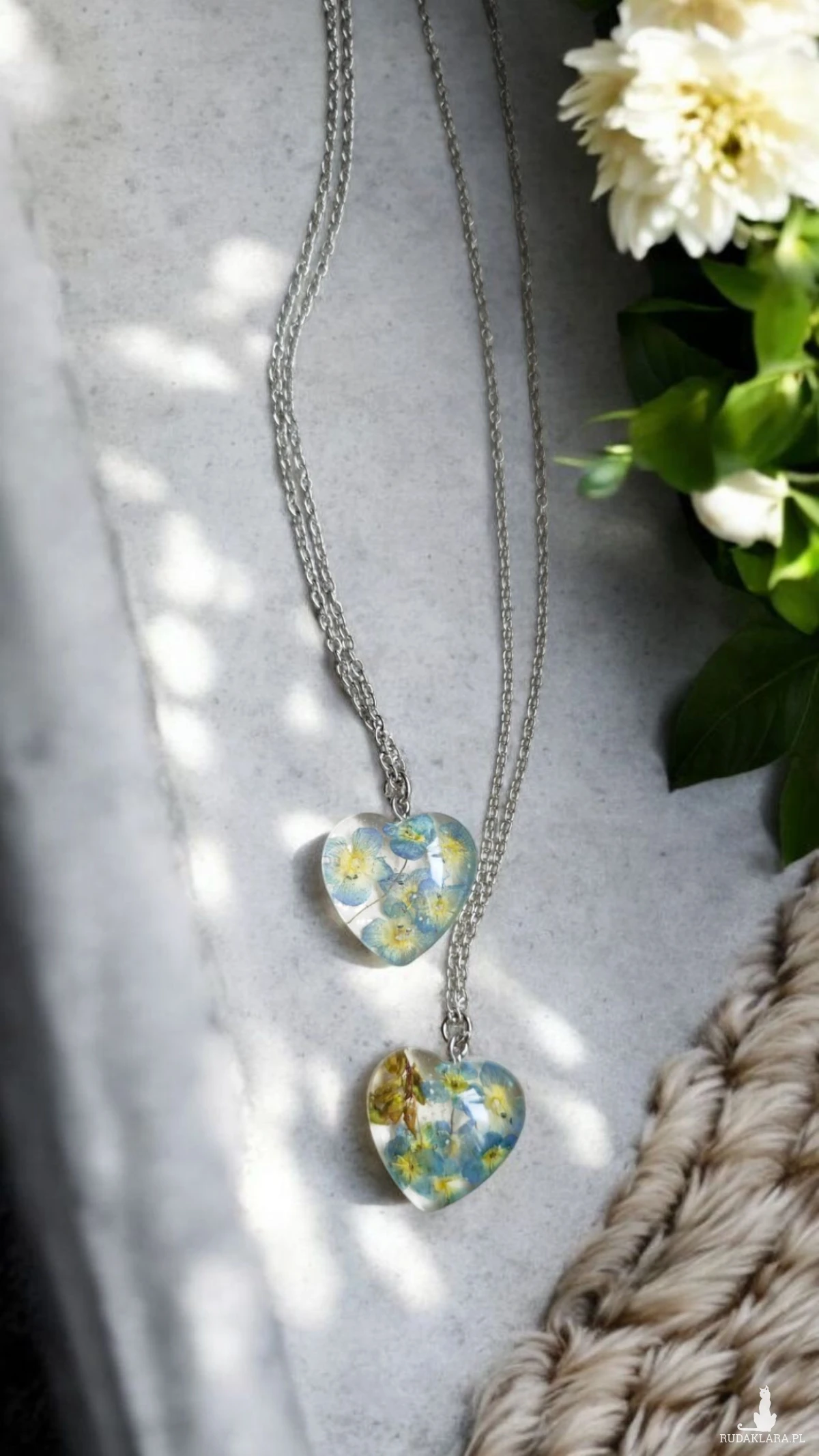 Te ręcznie wykonane serduszka kryją w sobie niebiesko-żółte kwiatki, zatopione w przezroczystej żywicy. Ich srebrne łańcuszki podkreślają elegancję i lekkość, a wyjątkowa kolorystyka dodaje im naturalnego uroku.