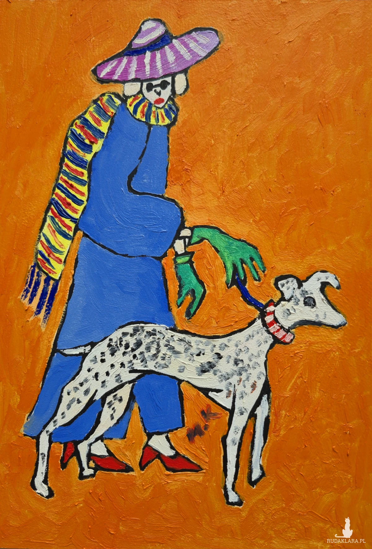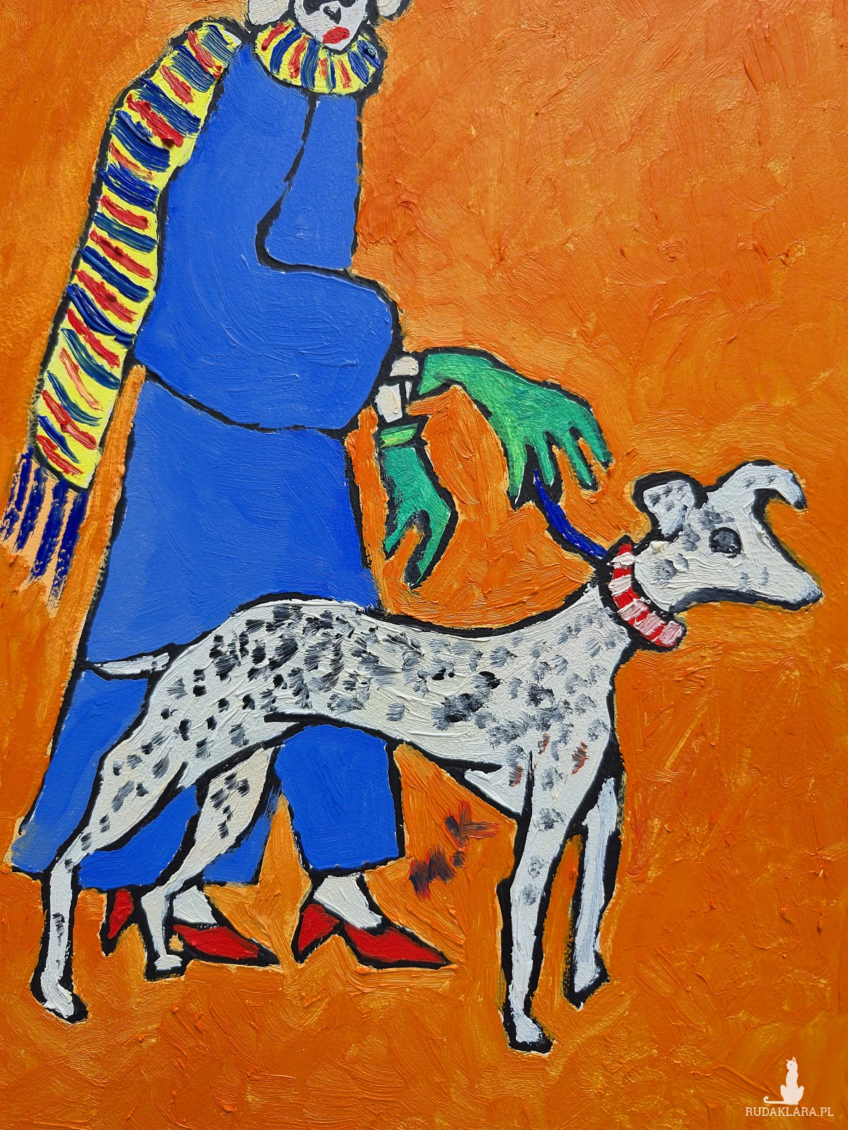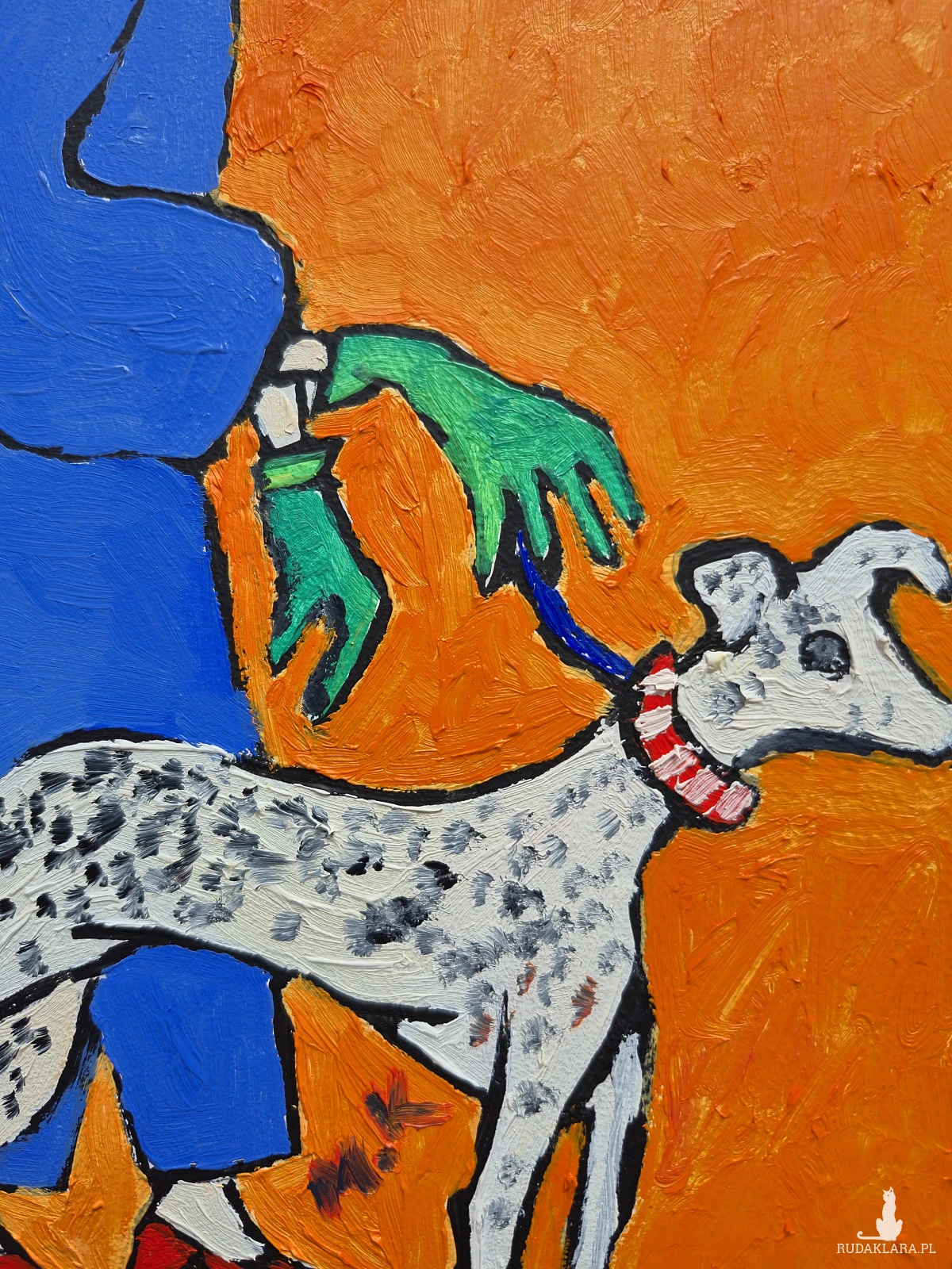 Obraz tętni kolorami: intensywny pomarańcz tła kontrastuje z błękitem postaci, zielenią rąk i bielą psa. Fioletowy kapelusz i pasiasty szalik dodają całości nieco szaleństwa. Kompozycja jest nieco chaotyczna, ale w dobry sposób! Kształty są uproszczone, jakieś takie kanciaste, co nadaje dziełu abstrakcyjnej nuty. Artysta posłużył się techniką grubo kładzionej farby, co widać po fakturze tła. Jasne, wyraziste kolory wzbudzają we mnie poczucie radości i optymizmu.