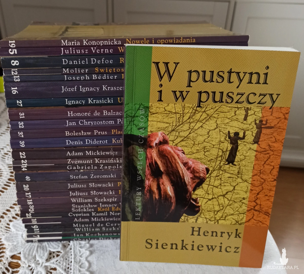 Seria 27 lektur wszech czasów dla podstawówki i szkoły średniej wydawnictwo Orkla Press Polska . Kolekcja zebrana drogą subskrypcji. Oprawa miękka, stan idealny bez śladów używania. Format bliski A5. Wydanie adresowane do nauczycieli oraz uczniów w różnym wieku / szkoła podstawowa i średnia/. Do wykorzystania w pracy nauczyciela i ucznia. Wygodna biblioteczka dla każdego domu. Doskonała seria na prezent. Gorąco polecam. Wykaz tytułów: W pustyni i w puszczy H.Sienkiewicz, Nowele i opowiadania M.Konopnicka, W 80 dni dookoła świata J.Verne, Robinson Crusoe D.Defoe, Świętoszek Molier, Dzieje Tristana i Izoldy J.Bedier, Stara baśń J.I.Kraszewski, Utwory wybrane I.Krasicki, Ojciec Goriot H.Balzac, Pamiętniki J.C Pasek, Placówka B.Prus, Kubuś Filatelista i jego pan D.Diderot, Dziady A. Mickiewicz, Nie-Boska komedia Z.Krasiński, Moralność Pani Dulskiej G.Zapolska, Ludzie bezdomni S.Żeromski, Poezje J.Słowacki, Balladyna J.Słowacki, Hamlet W.Szekspir, Szewcy I.Witkiewicz, Król Edyp Sofokles, Poezje C.K.Norwid, Ballady i romanse, Konrad Wallenrod A.Mickiewicz, Przygody Don Kichota M.Cervantes, Makbet W.Szekspir, Fraszki, Pieśni, Treny J.Kochanowski, Opowieść wigilijna Ch.Dikens.