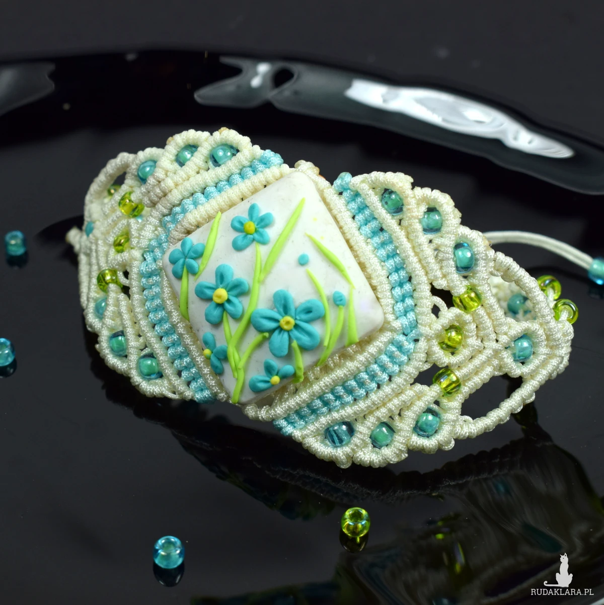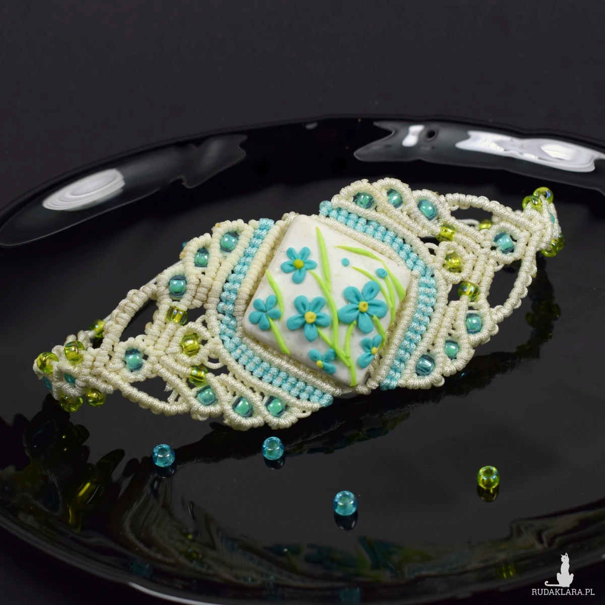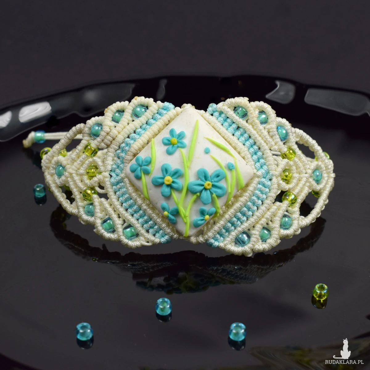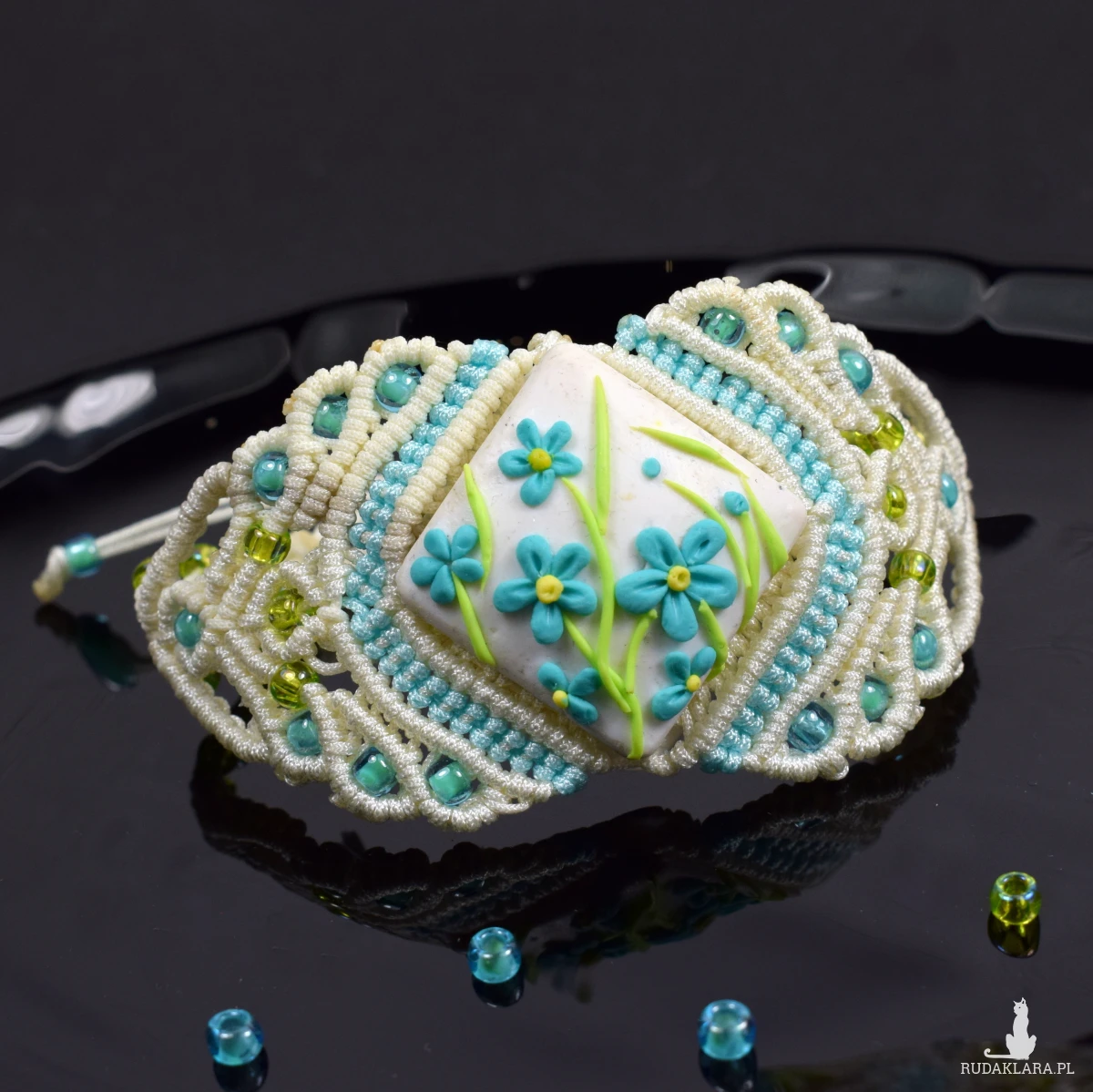 oraz ozdobiona szklanymi koralikami w delikatnych odcieniach błękitu i