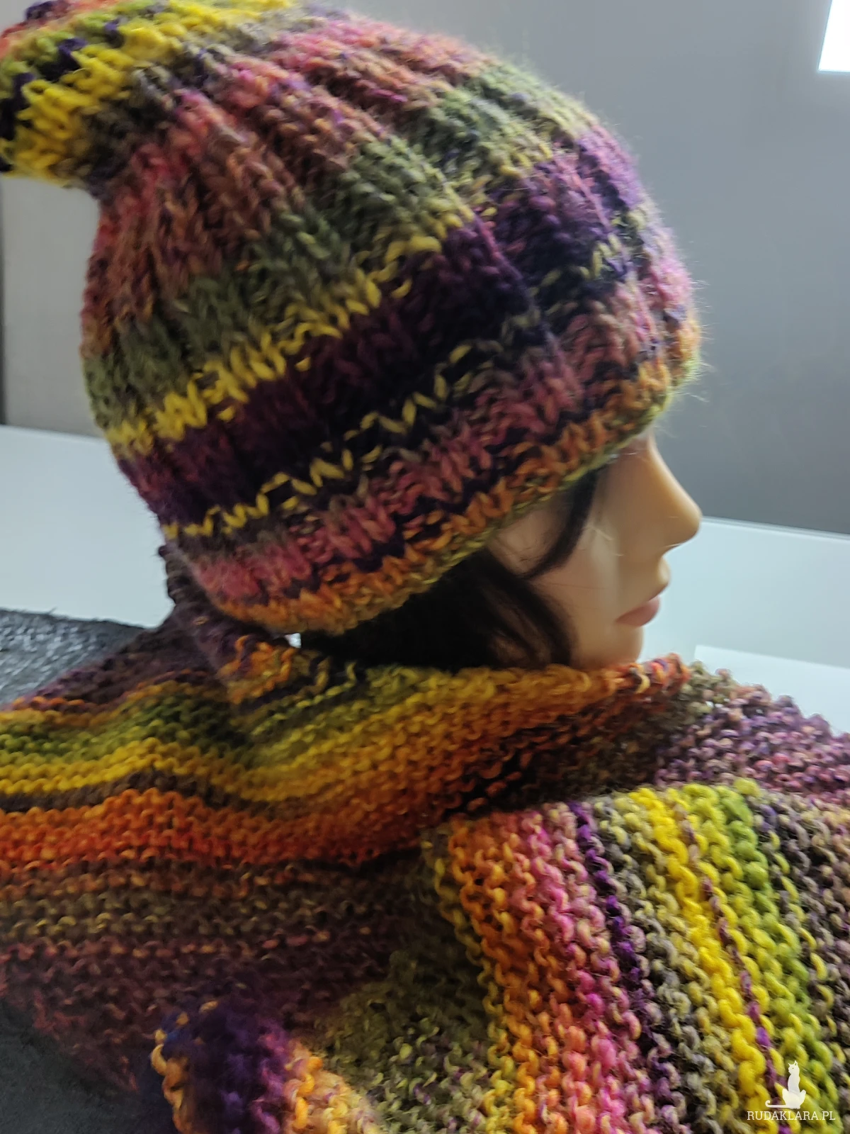 Czapka uniwersalna, ciepła, energetyczne kolory niezwykle twarzowe ponad czasowe w komplecie z szalem ożywią szarą jesień i zimę.