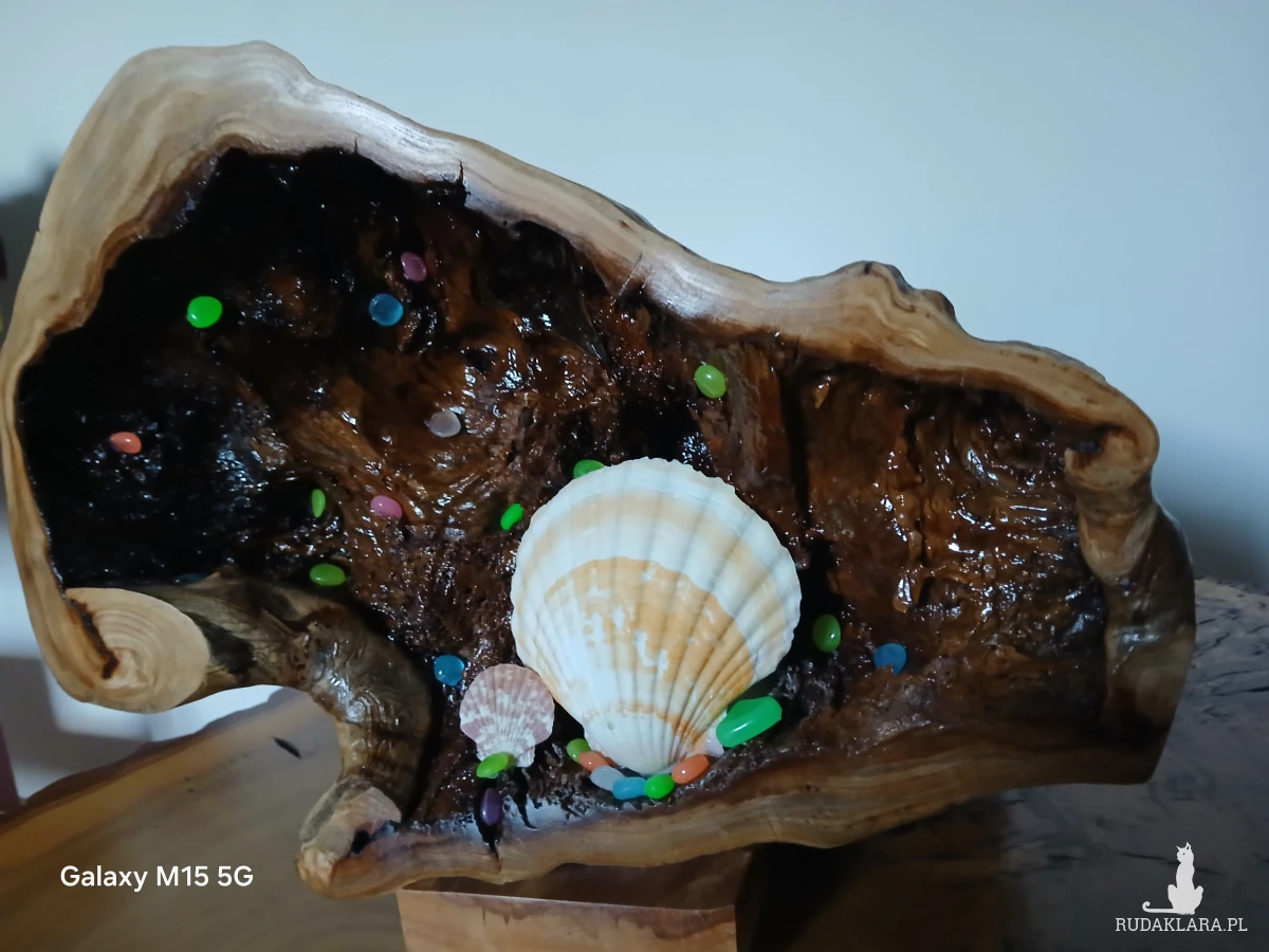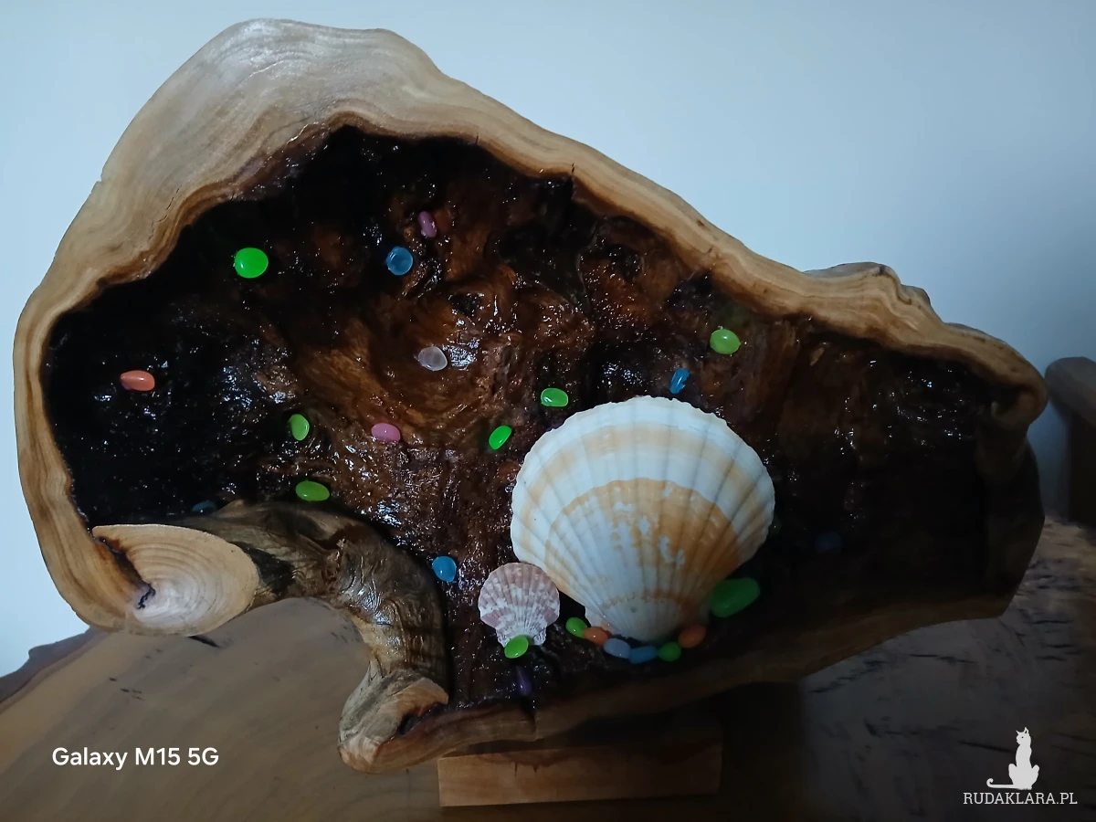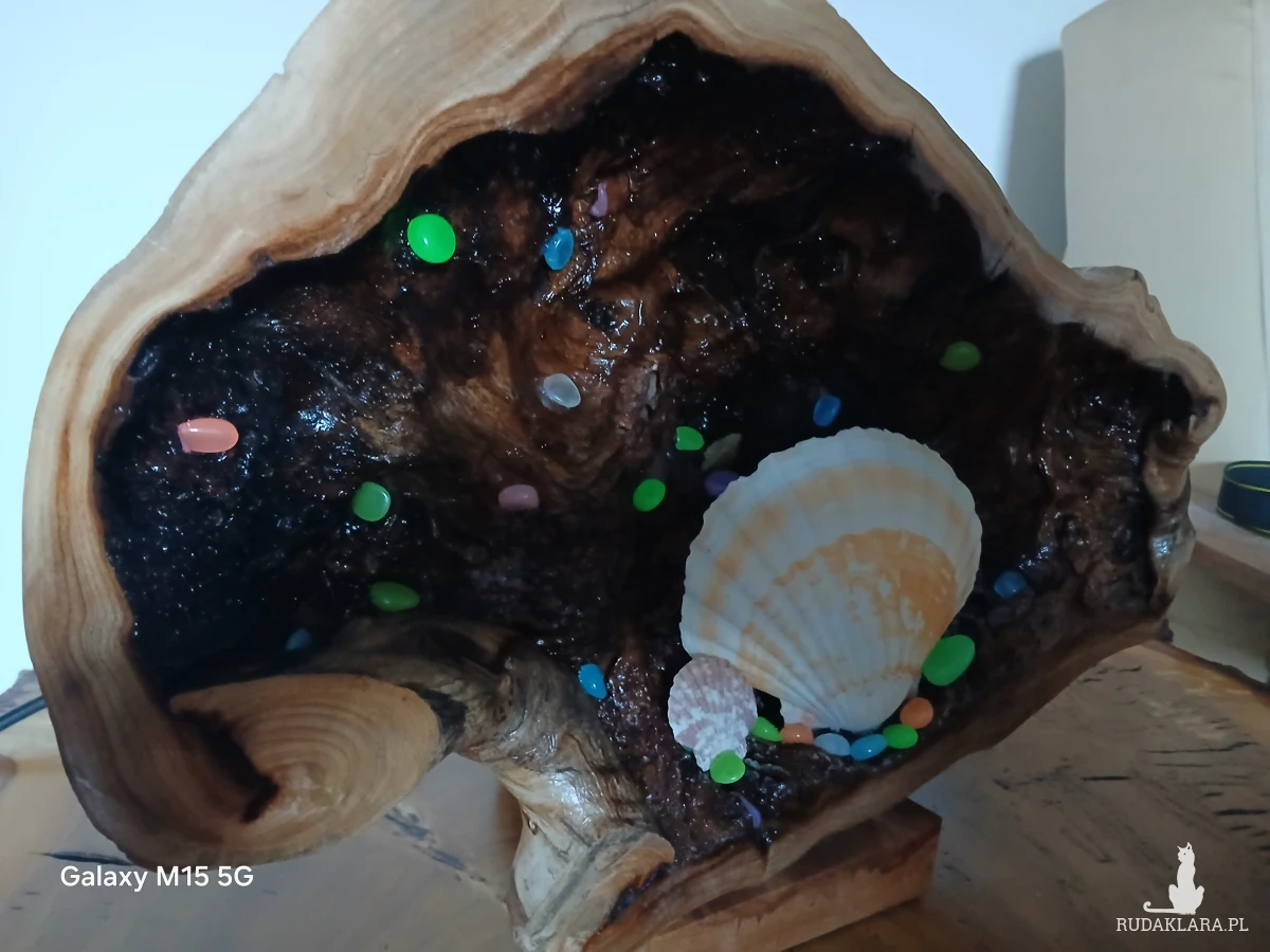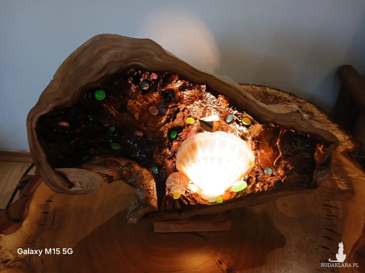 Ta wyjątkowa lampa to połączenie naturalnego drewna i muszli, tworzące niepowtarzalny element dekoracyjny. Starannie wycięte i wypolerowane drewno eksponuje piękne słoje, a umieszczona w centrum muszla pełni funkcję klosza, emitując ciepłe i przytulne światło. Dodatkowe ozdobne kamyki dodają jej charakteru.