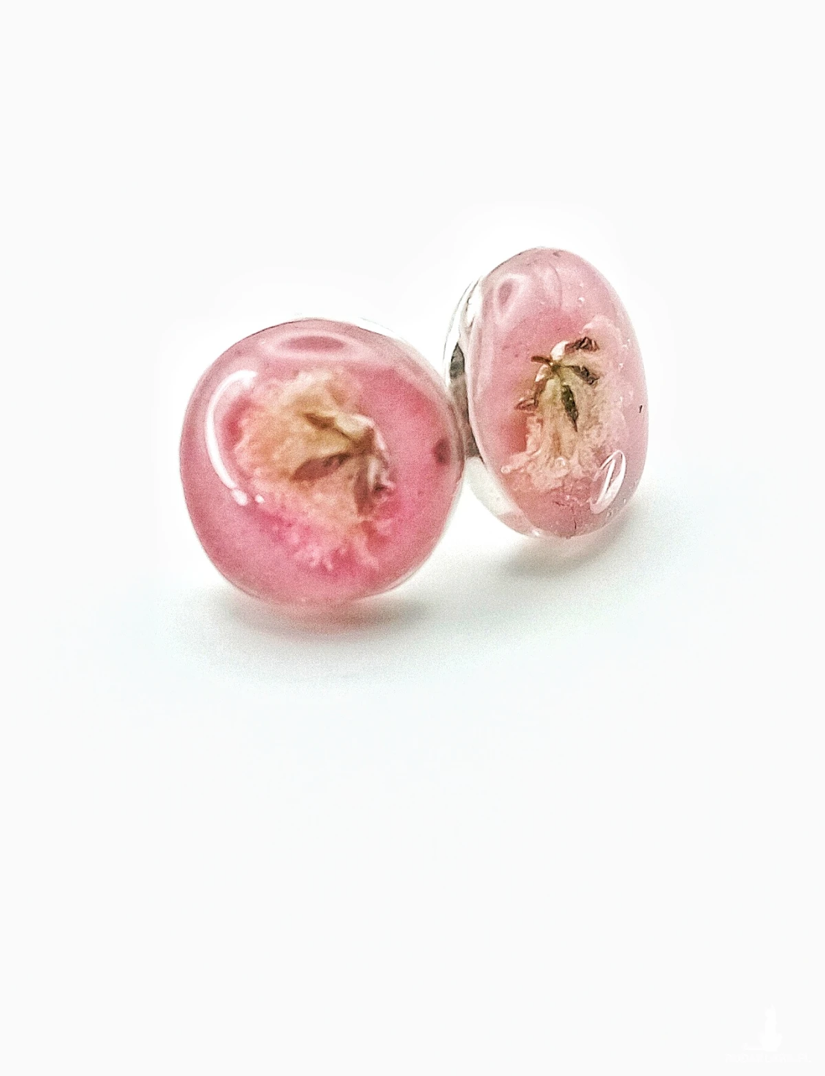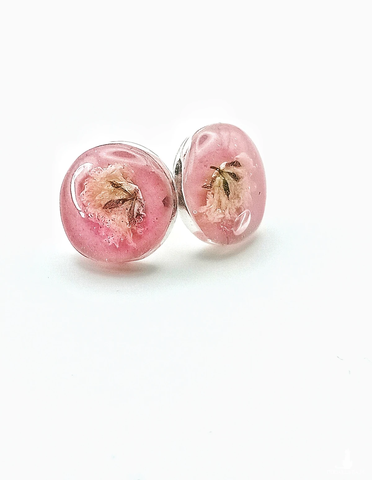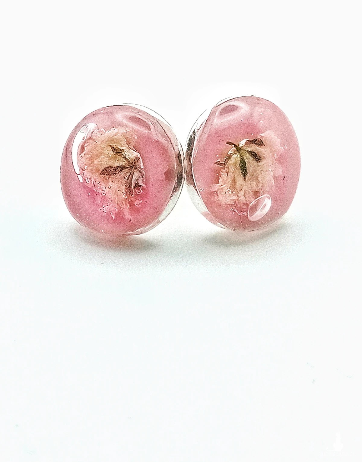Zatopione w żywicy UV suszone kwiatuszki gipsówki nadają kolczykom wyjątkowego uroku – są delikatne, romantyczne i modne.