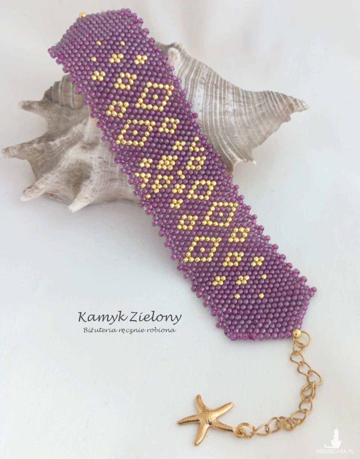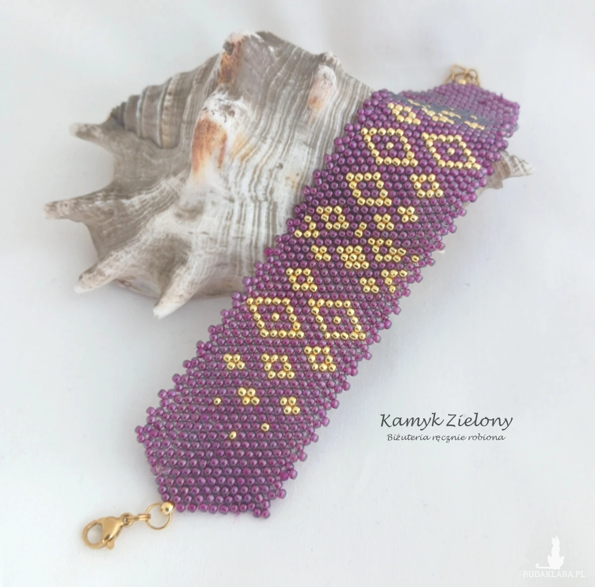 Szeroka bransoletka mankietowa uszyta została ręcznie z wysokiej jakości koralików szklanych. Do jej zrobienia użyto japońskich koralików Toho w kolorze fioletowym oraz złotym.