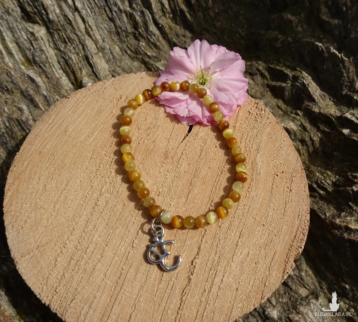 Bransoletka kulek naturalnego złotego tygrysiego oka wielkości 4,5mm na silikonowej gumce, z zawieszką Om.