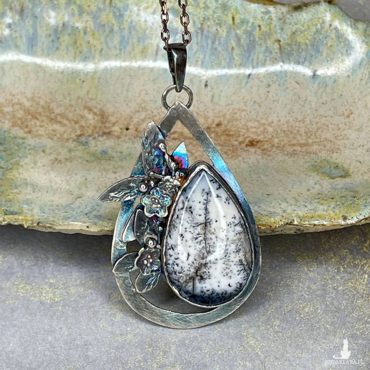 Agat został oprawiony w srebro próby 925, ręcznie formowane i zdobione roślinnymi detalami. Oksydowanie i przecieranie srebra wydobywa każdy detal oprawy, dodając jej głębi i tęczowych blasków. Całość tworzy pełen wdzięku, lekko baśniowy naszyjnik – idealny dla kobiet, które cenią delikatność, naturę i unikatowy styl.