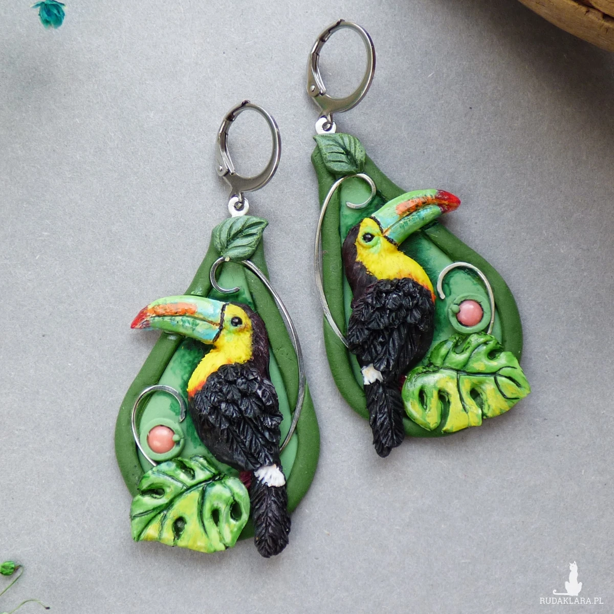 Kolczyki inspirowane egzotycznym pięknem tropikalnych lasów – przedstawiają ręcznie wyrzeźbione tukany, otoczone liśćmi monstery i zielenią. Każdy szczegół został wykonany z dbałością o detale – od faktury piór po barwny dziób ptaka.