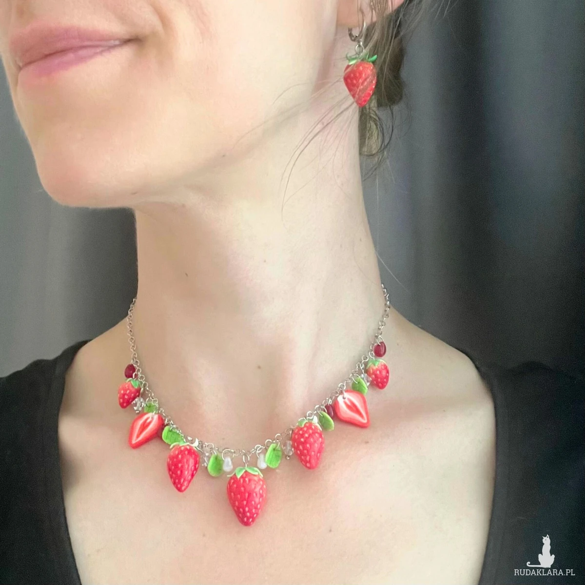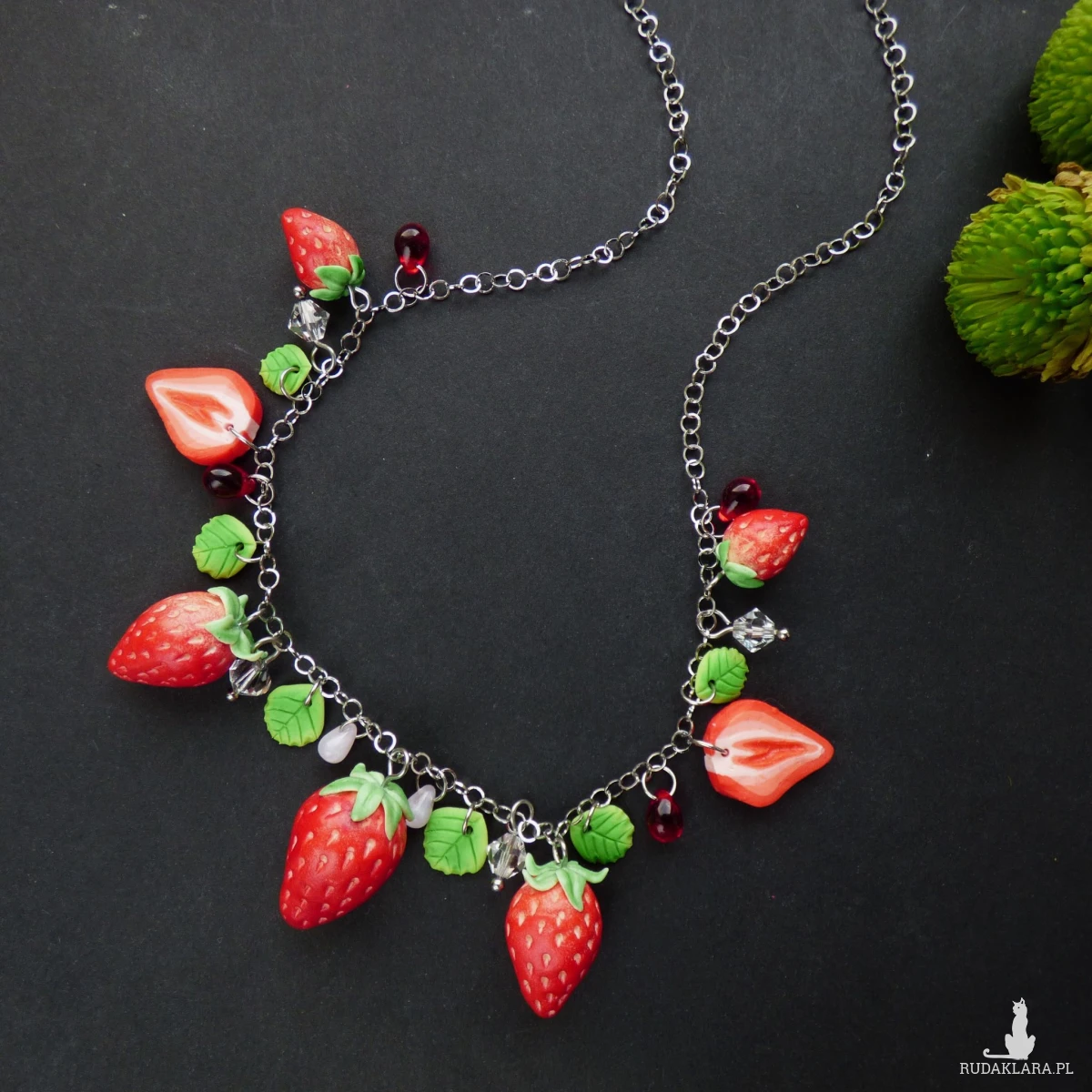 Soczysta biżuteria z glinki polimerowej. Apetyczny, letni naszyjnik ozdobiony ręcznie wyrzeźbionymi truskawkami i ich plasterkami, listkami oraz szklanymi koralikami. To lekka, radosna biżuteria, która od razu przywołuje smak słonecznego dnia i zapach świeżych owoców.
