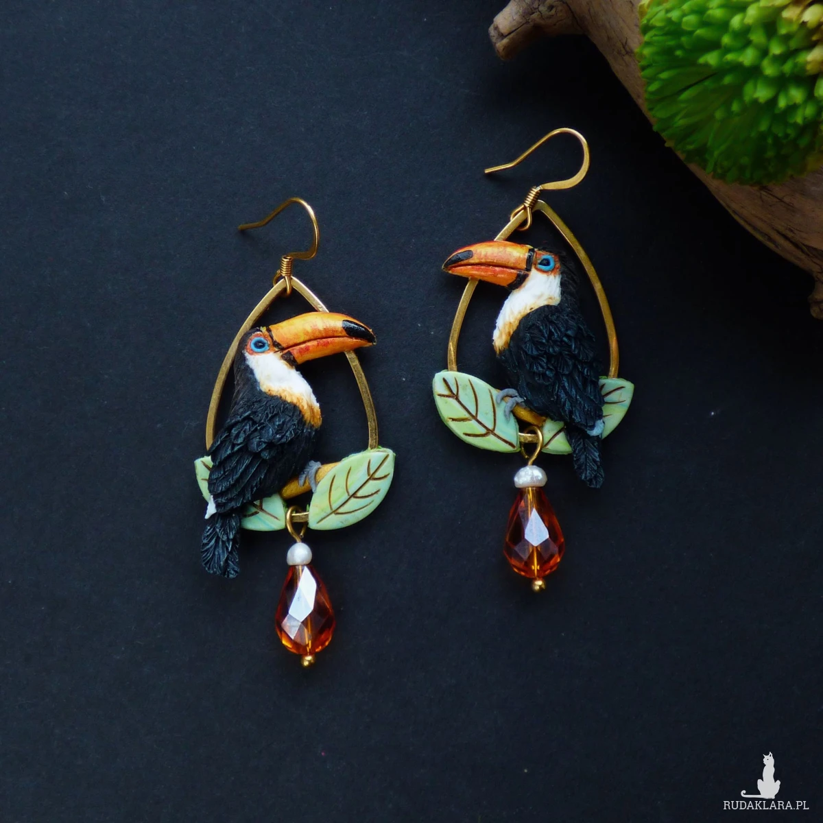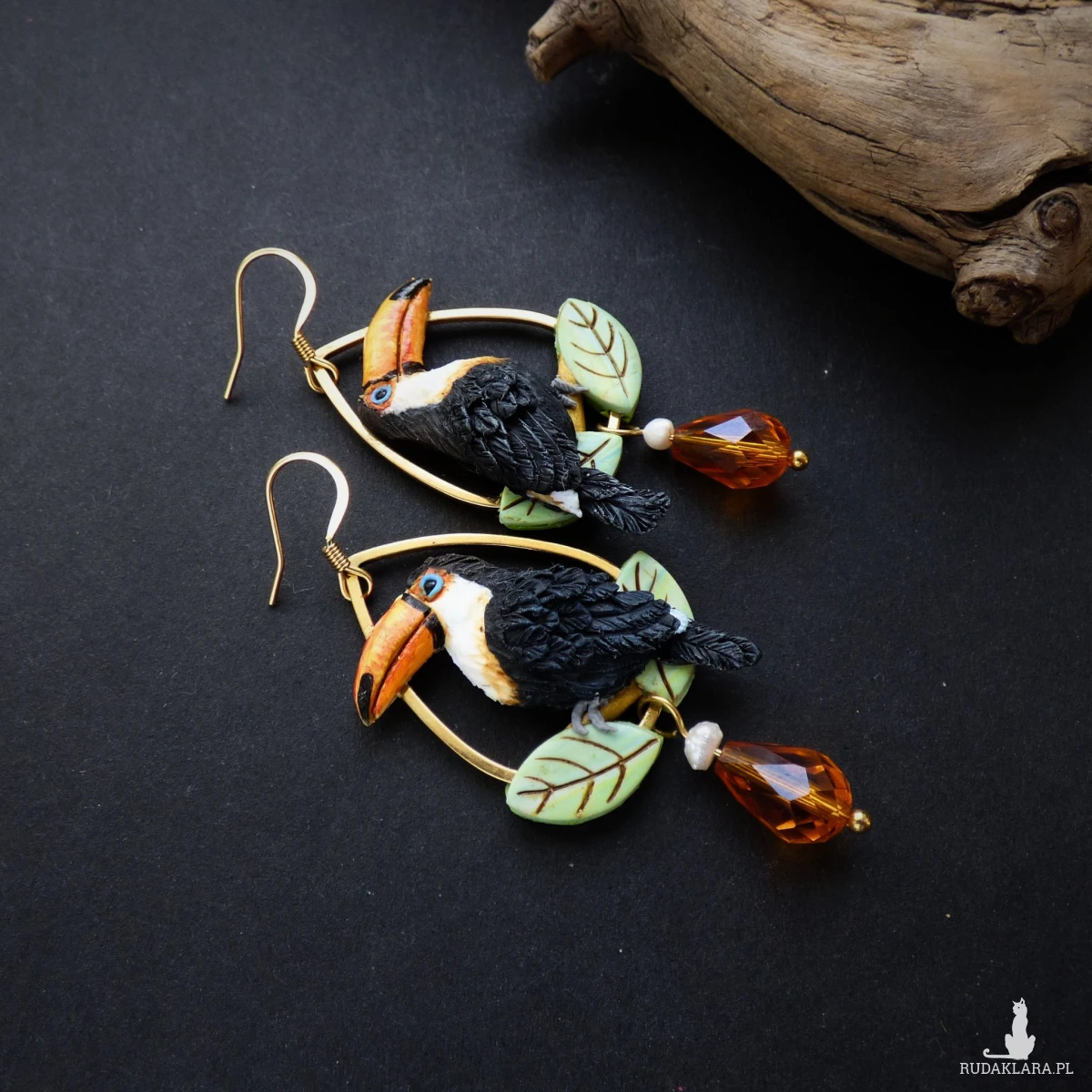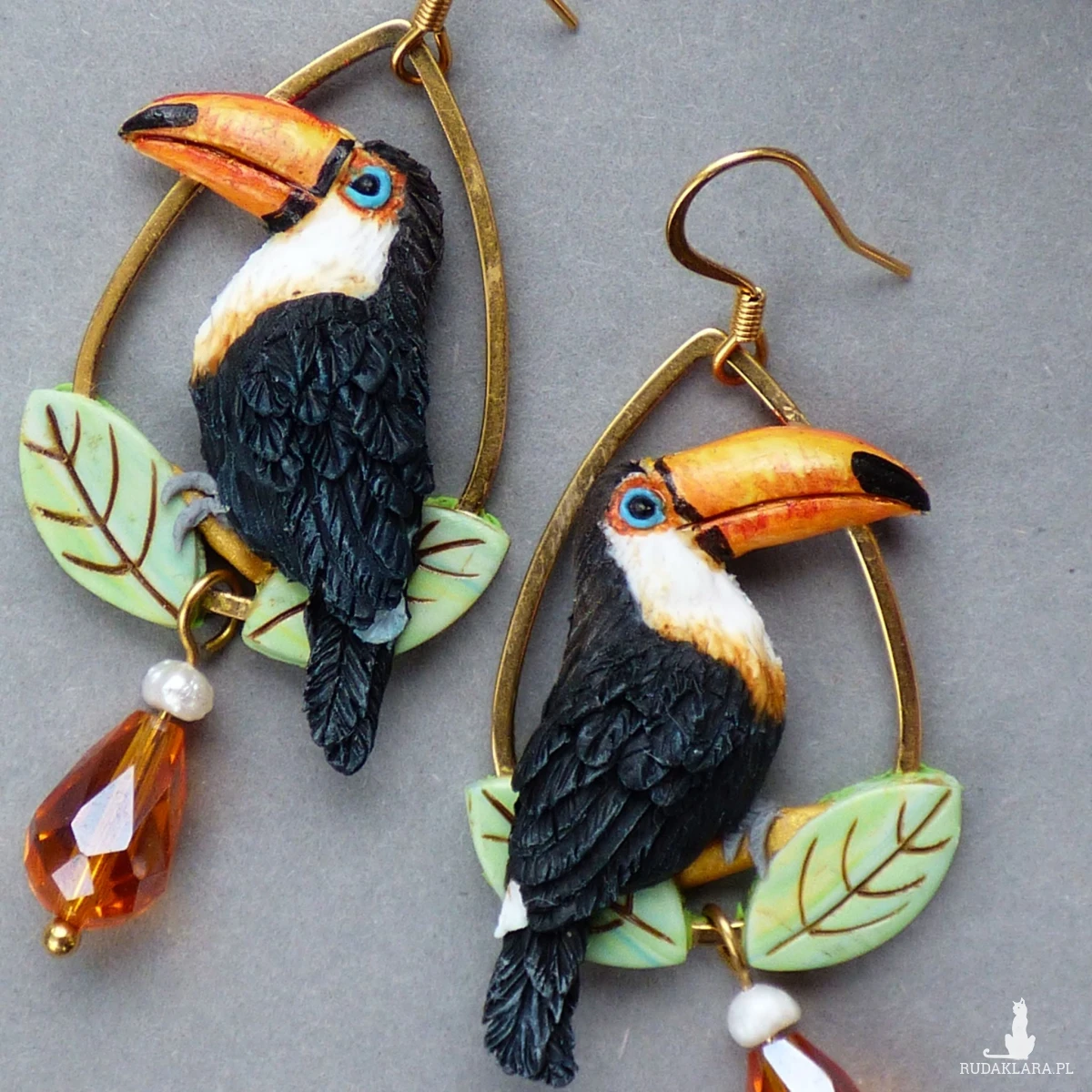 Biżuteria z odrobiną tropikalnej magii! Te wyjątkowe kolczyki przedstawiają egzotyczne ptaki, jakimi są tukany siedzące wśród liści. Kolczyki wykończyłam elegancką kroplą pomarańczowego kryształka i naturalną perłą. Biżuteria łączy w sobie radość egzotyki z nutą wyrafinowania – idealna zarówno na wakacyjne wyjazdy, jak i barwny dodatek do pracy.
