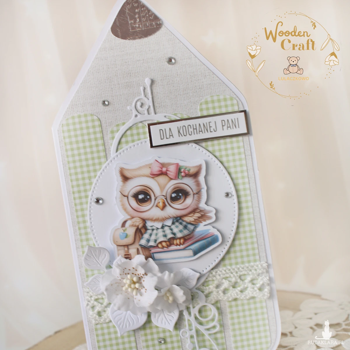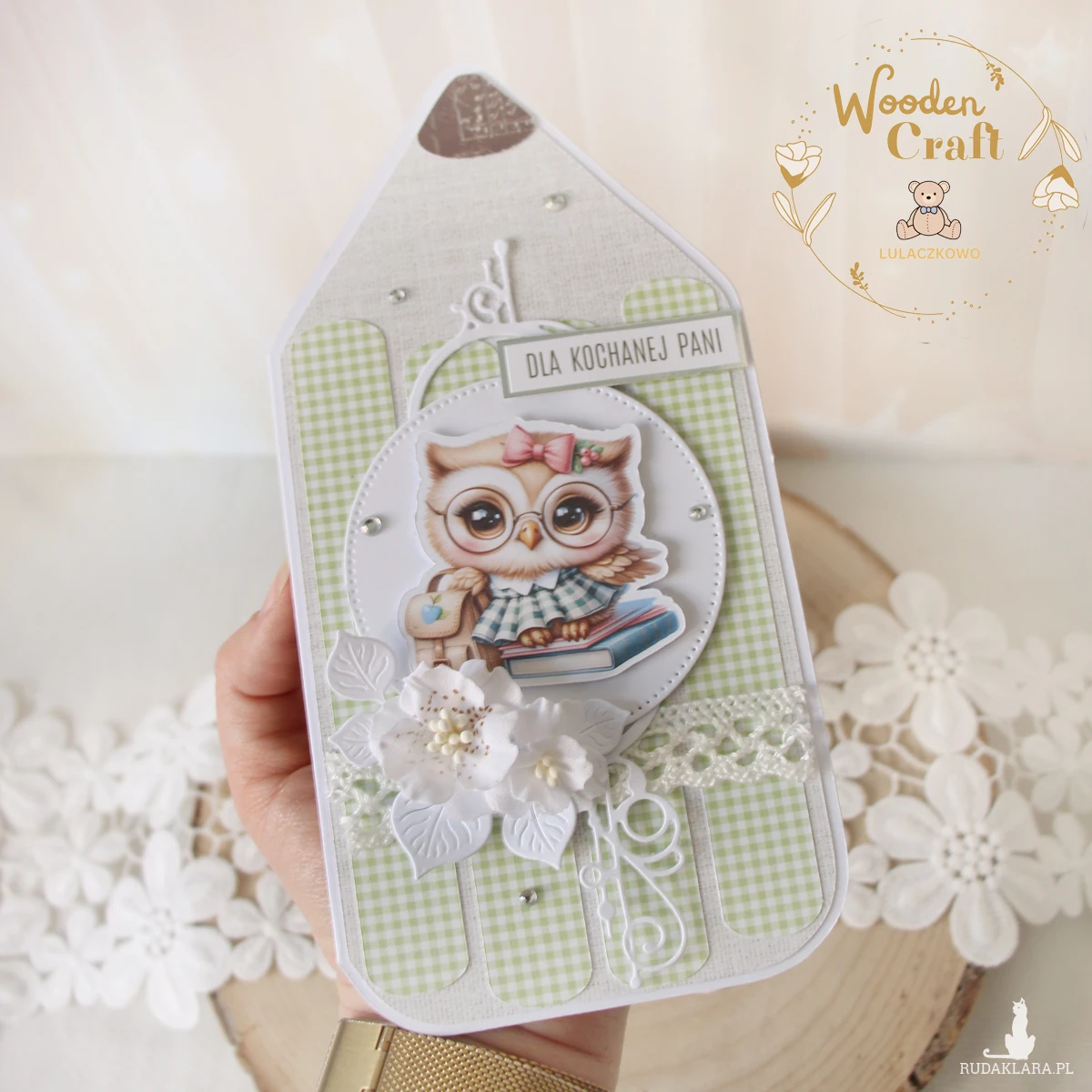 Przepiękna, ręcznie robiona kartka w kształcie kredki, jako podziękowanie na zakończenie roku szkolnego dla nauczyciela lub wychowawcy. Kartka z motywem uroczej sowy z torbą i książkami, ozdobiona koronką, ażurowym dekorem, kryształkami oraz ręcznie robionymi, materiałowymi kwiatami, a także napisem "Dla Kochanej Pani" (na życzenie mogę zmienić napis na dowolny). Kartka w odcieniach przepięknej jasnej zieleni i beżu, otwierana, w środku jest pusta, z miejscem na podpisy uczniów i życzenia (istnieje możliwość personalizacji, wklejenia imienia nauczycielki, wychowawczyni oraz własnej dedykacji/życzeń), w tym celu proszę o kontakt.