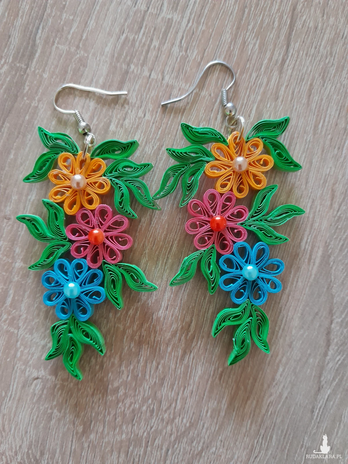 Kolczyki wykonane ręcznie z papieru metodą quilling, zabezpieczone i utwardzone lakierem bezbarwnym, więc nie chłoną wilgoci atmosferycznej.