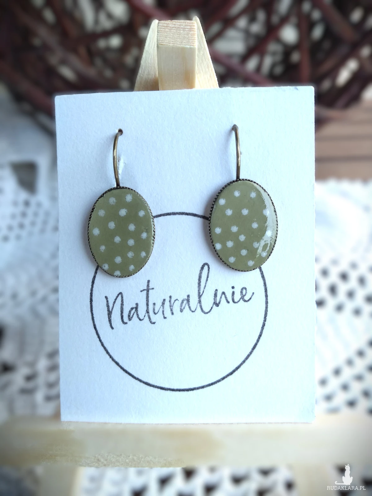 Piękne kolczyki ( bigle angielskie) - pastelowa mięta w białe kropeczki. Długość kolczyka 3 cm. Bigle antyalergiczne, bez niklu i ołowiu.