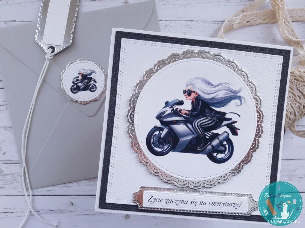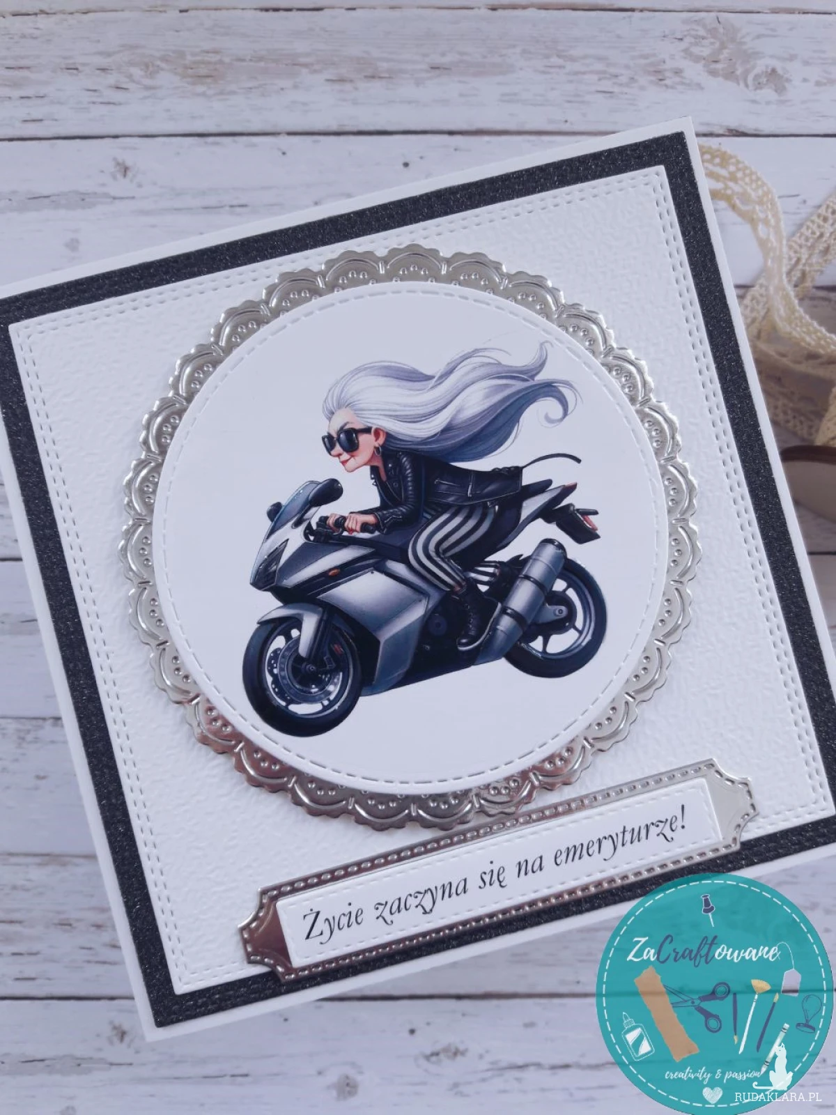 Wesoła kartka z okazji przejścia na emeryturę z kobietą na motorze, wykonana metodą scrapbookingu z wykorzystaniem profesjonalnych materiałów i dbałością o każdy szczegół.