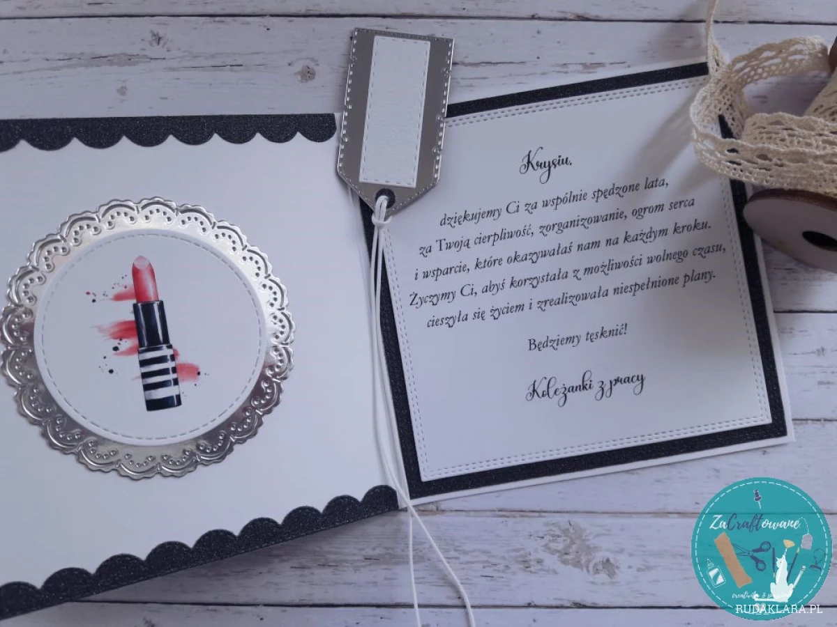 Do kartki dołączam GRATIS w postaci 1 widocznej na zdjęciu etykietki, za pomocą której można podpisać upominek dla osoby przechodzącej na emeryturę i przyczepić ją do wstążki, którą obwiązany jest prezent, za pomocą sznureczka, który również znajduje się w zestawie.