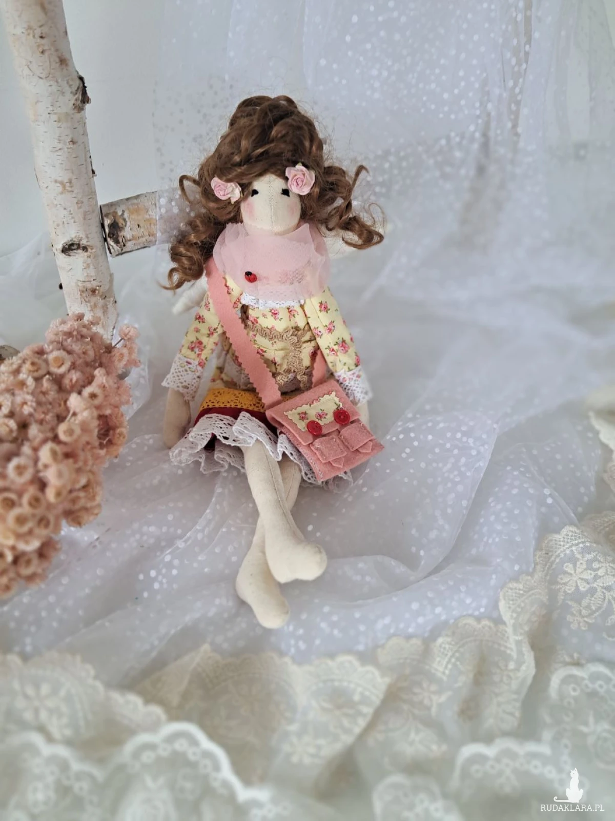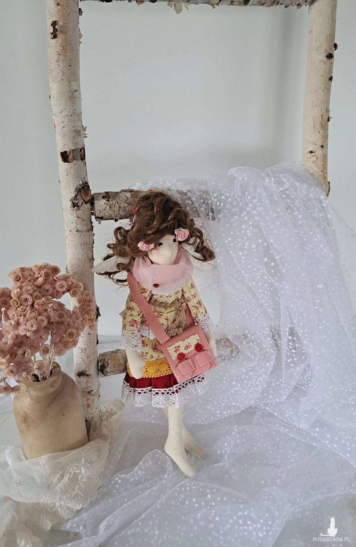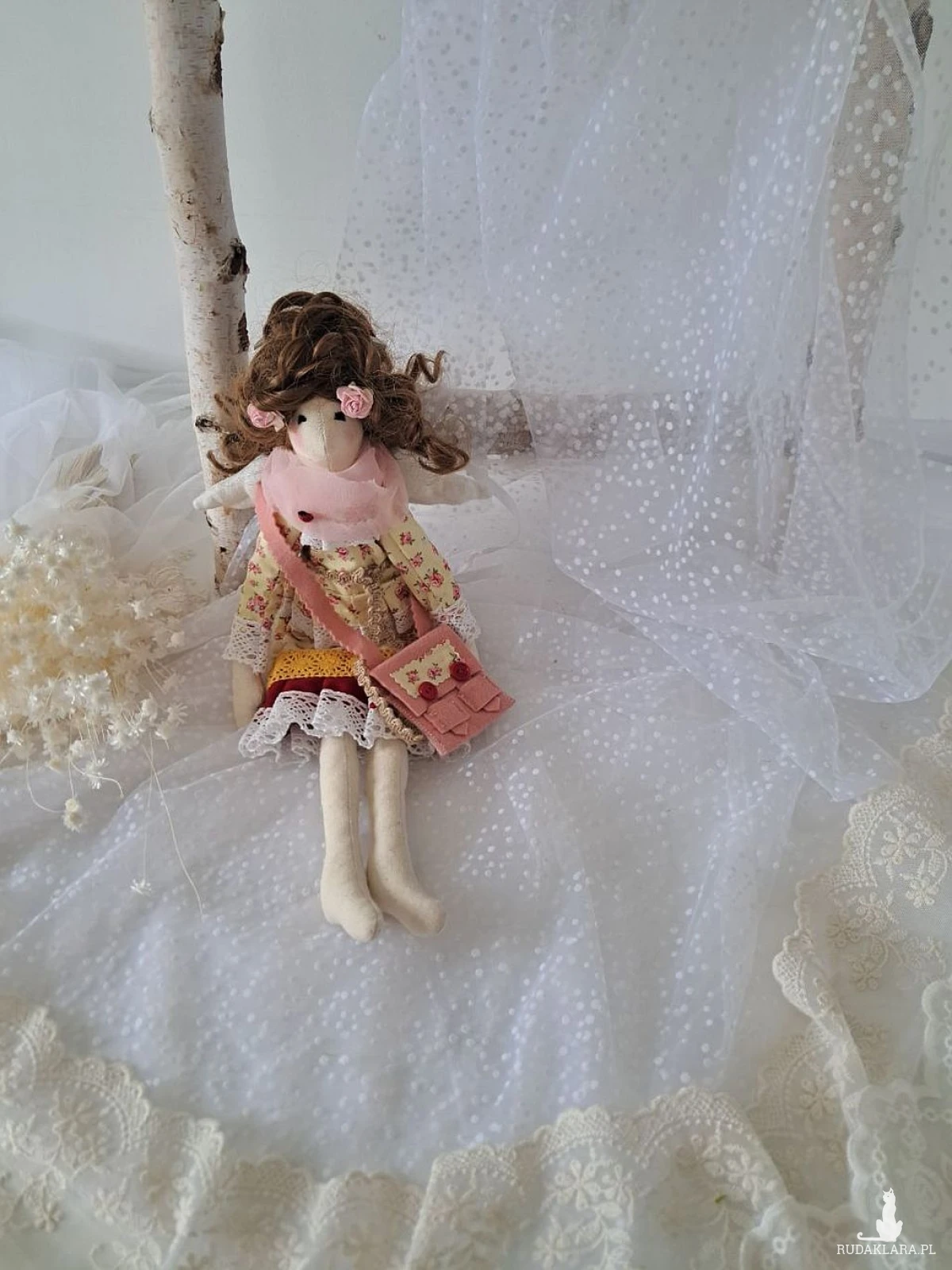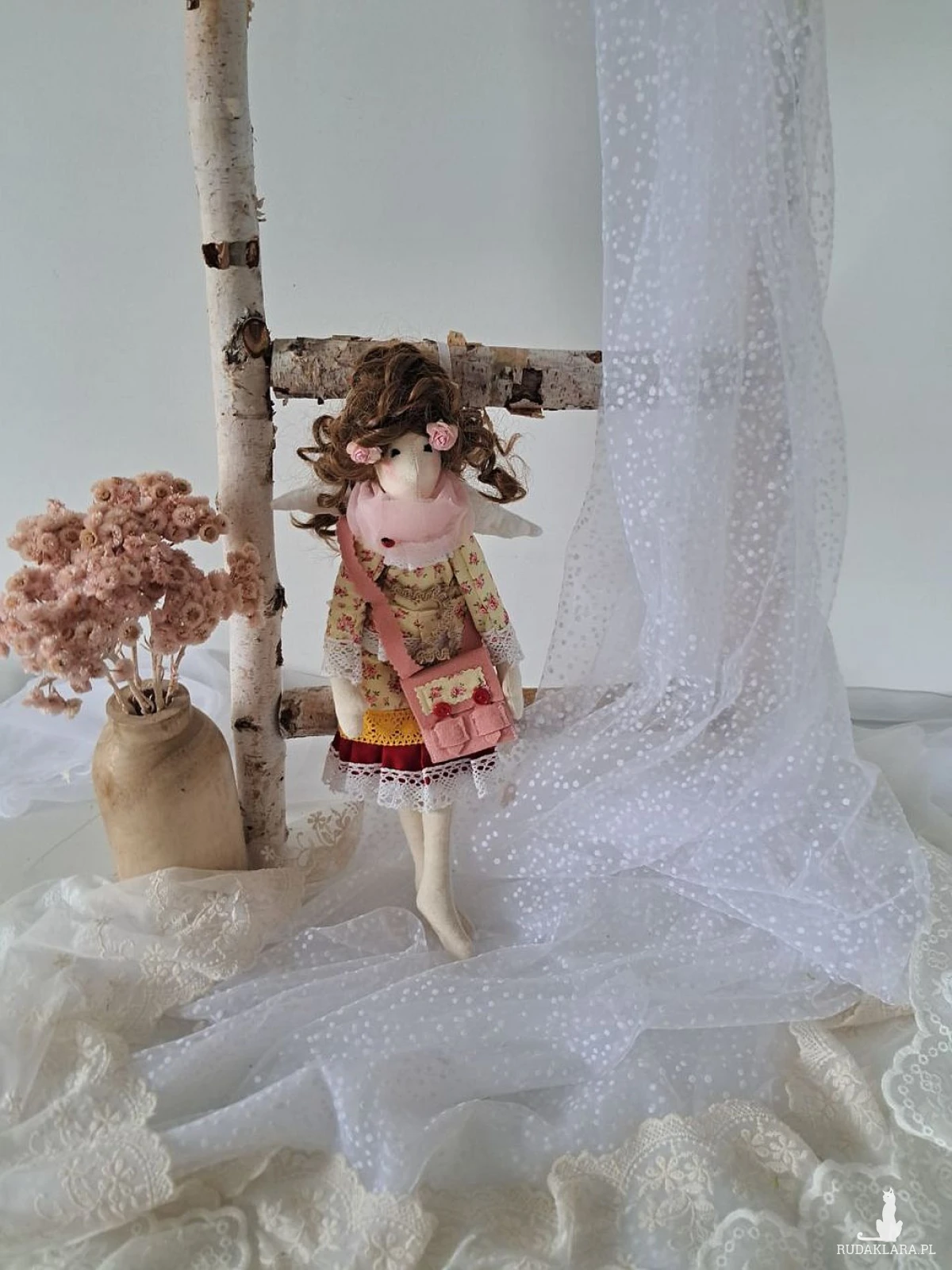 Witam serdecznie:) Mam do sprzedaży własnoręcznie wykonaną anielicę tildę widoczną na załączonych zdjęciach. Ciałko uszyte z surówki bawełnianej,wypełnione antyalergiczną kulką silikonową. Sukienka uszyta z bawełny,udekorowana koronkami z bawełny. Pod szyją tiulowy szal z naklejoną biedroneczką:) Włosy kręcone ciemny brąz z wpiętymi różyczkami. Torebeczka typu listonoszka z filcu,przewieszona przez ramię. Białe bawełniane skrzydełka. Można zawiesić lub posadzić. Może stanowić piękny wyraz wdzięczności za trud pracy nauczyciela w mijającym roku szkolnym,ale nie tylko. Wysokość 37 cm.