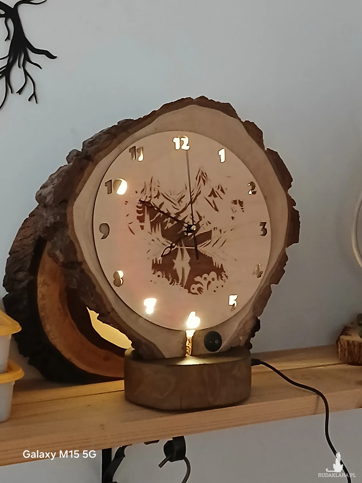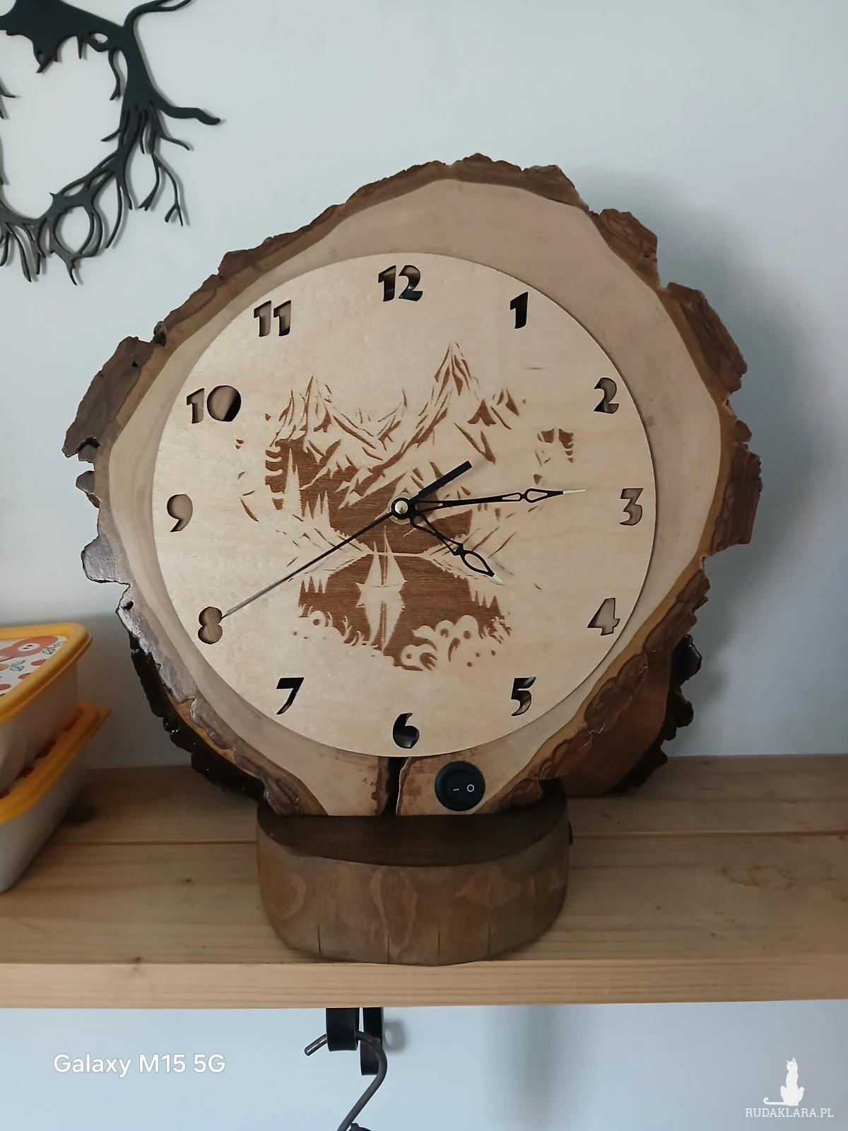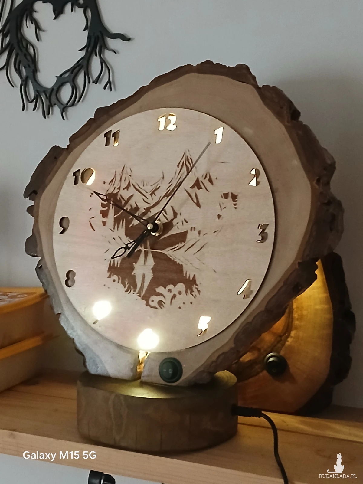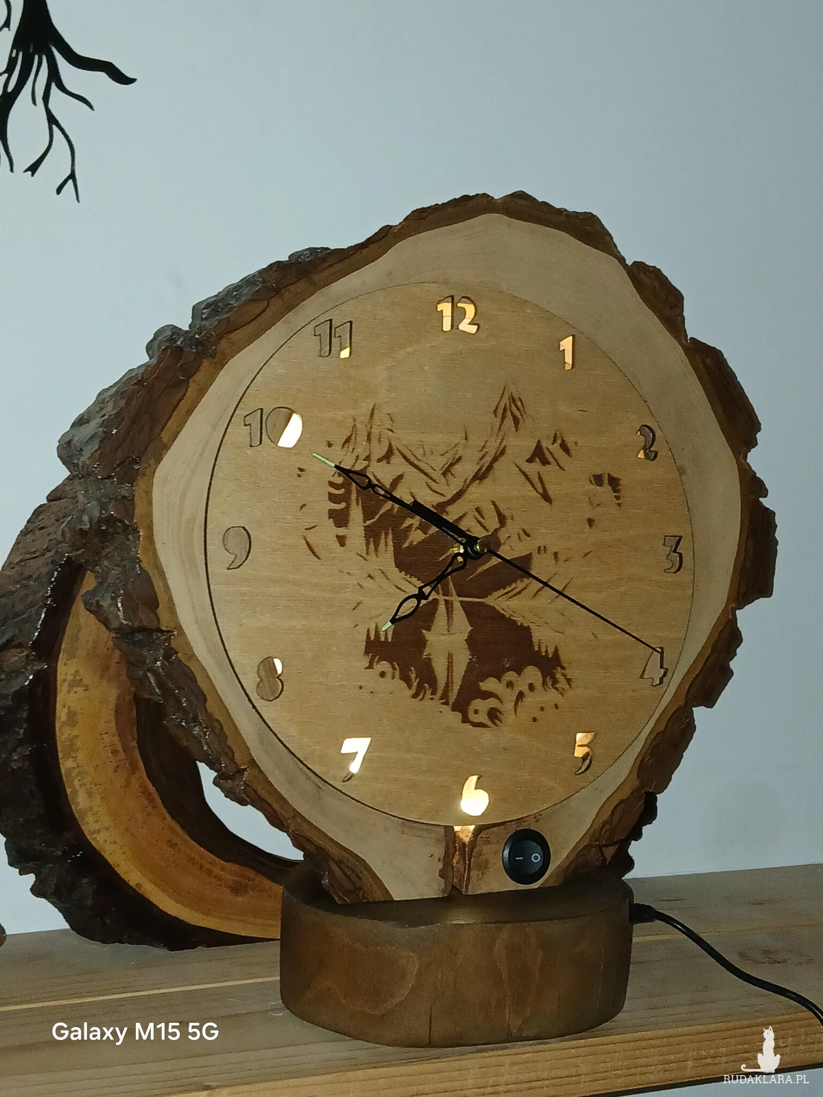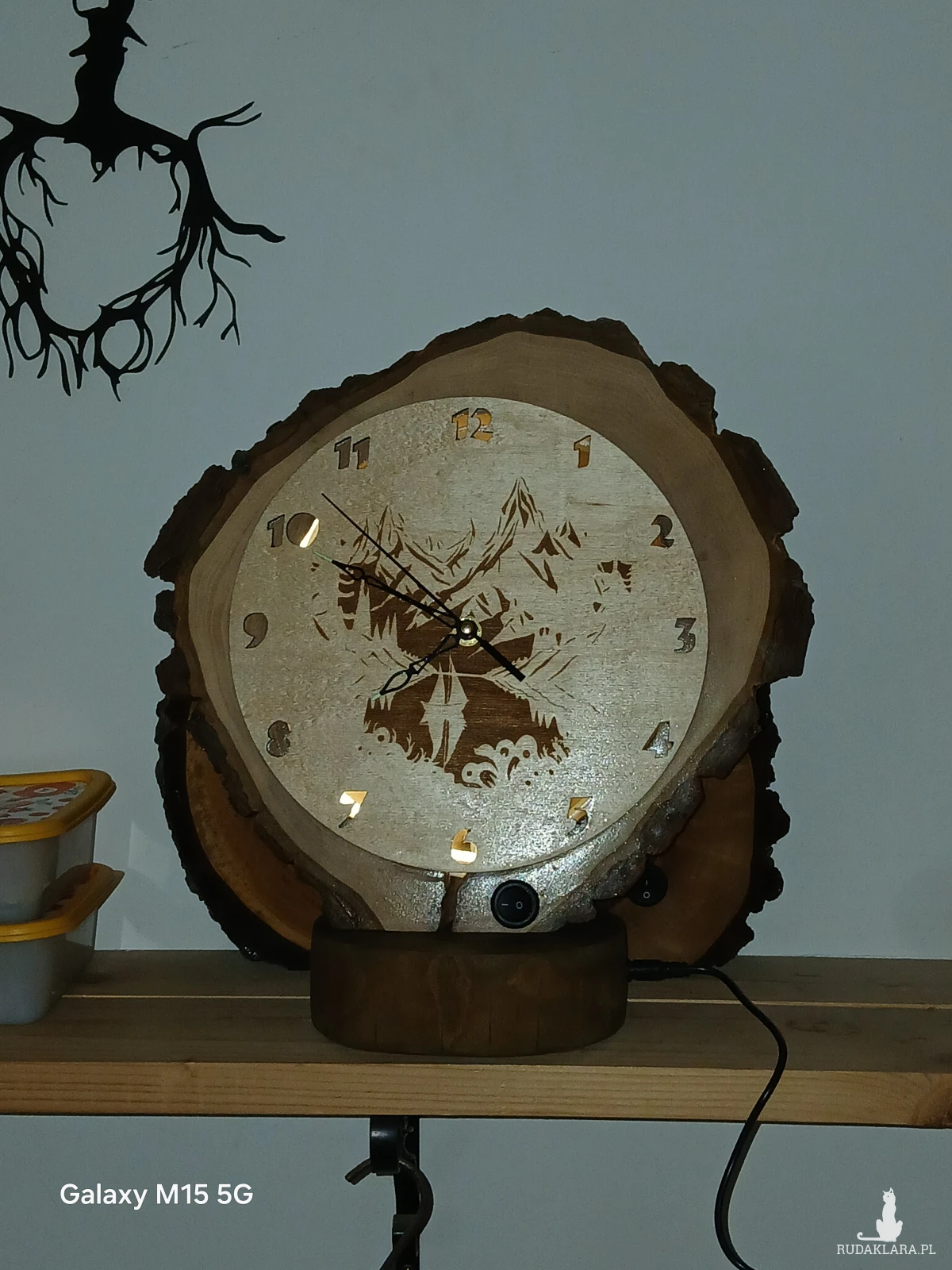 Zegar z podświetleniem ,cyferblat ze sklejki z wypalonym widoczkiem.