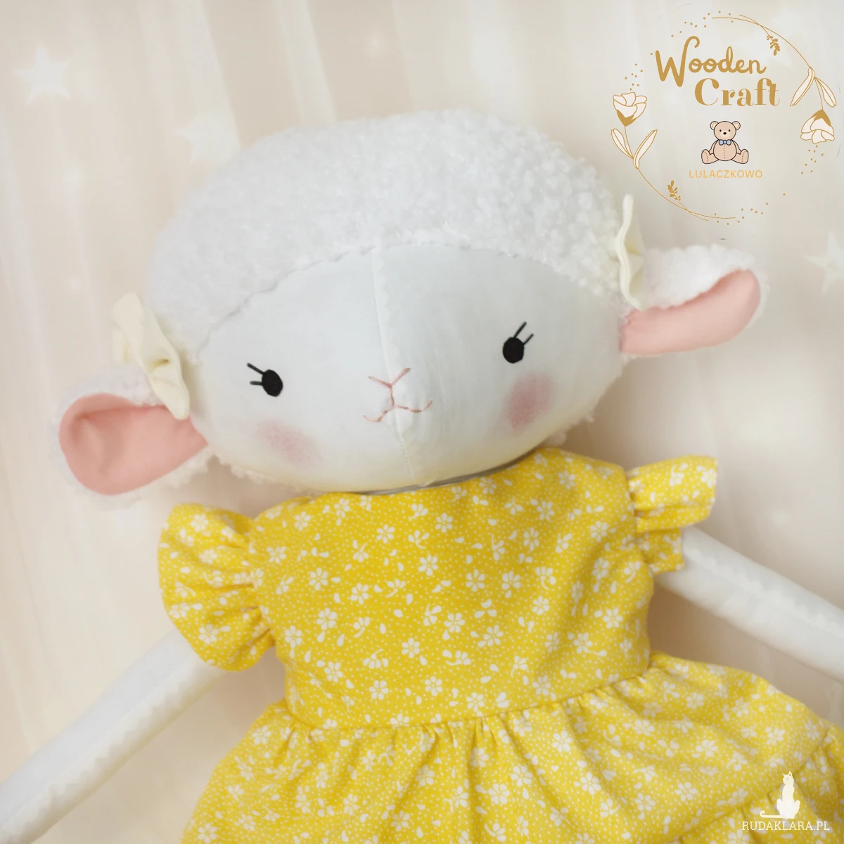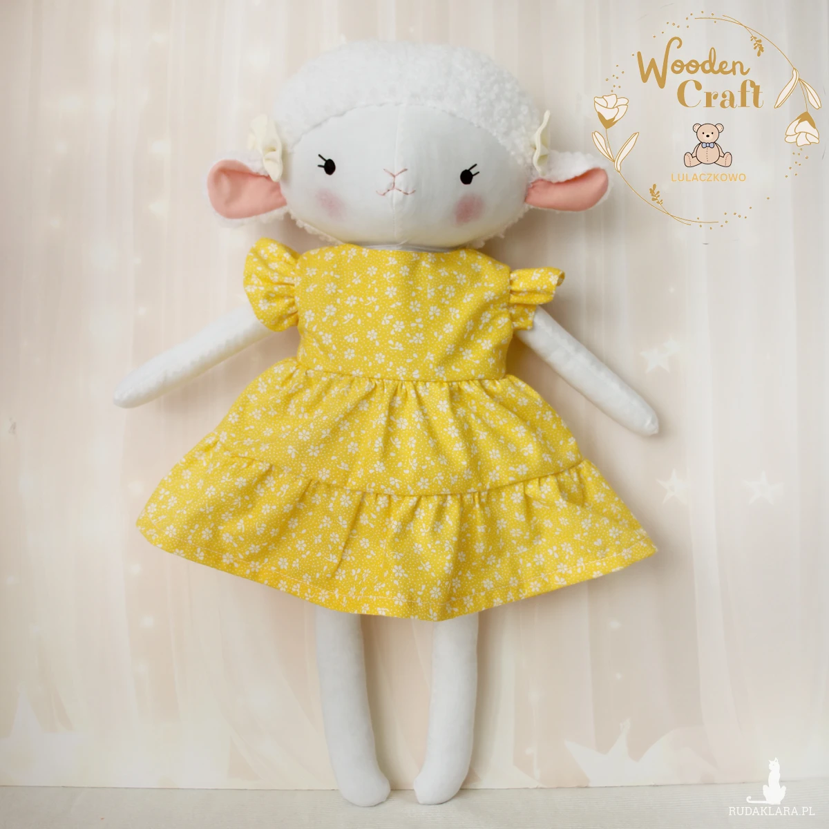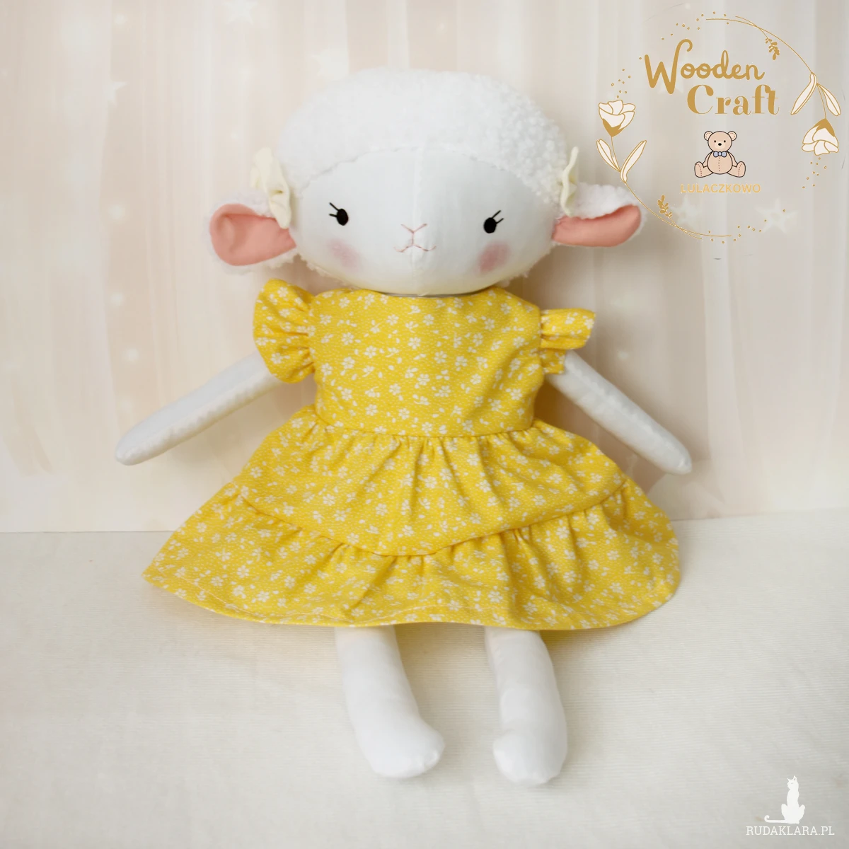 Przeurocza przytulanka, owieczka cała w bieli, uszyta ręcznie z najwyższą starannością, ubrana w żółtą sukieneczkę w drobne kwiatuszki, z falbankami. Wykonana ze 100% bawełny, wypełniona antyalergiczną kulką silikonową. Oczka malowane wodoodpornym markerem, nosek i uśmiech wyszyte muliną, uszka ozdobione kokardkami. Sukieneczkę można swobodnie zdejmować, zapinana jest na rzep. Górne i dolne łapki układają się luźno, owieczka siedzi z podparciem.