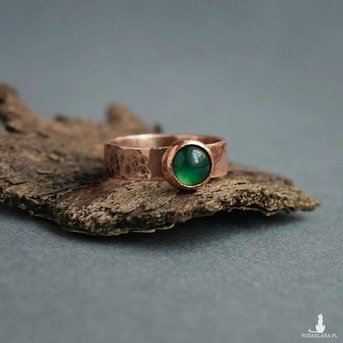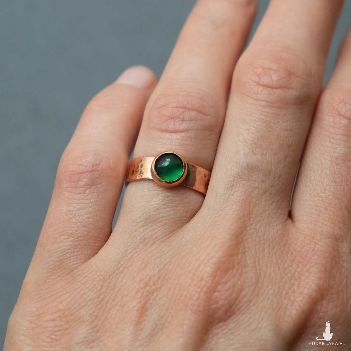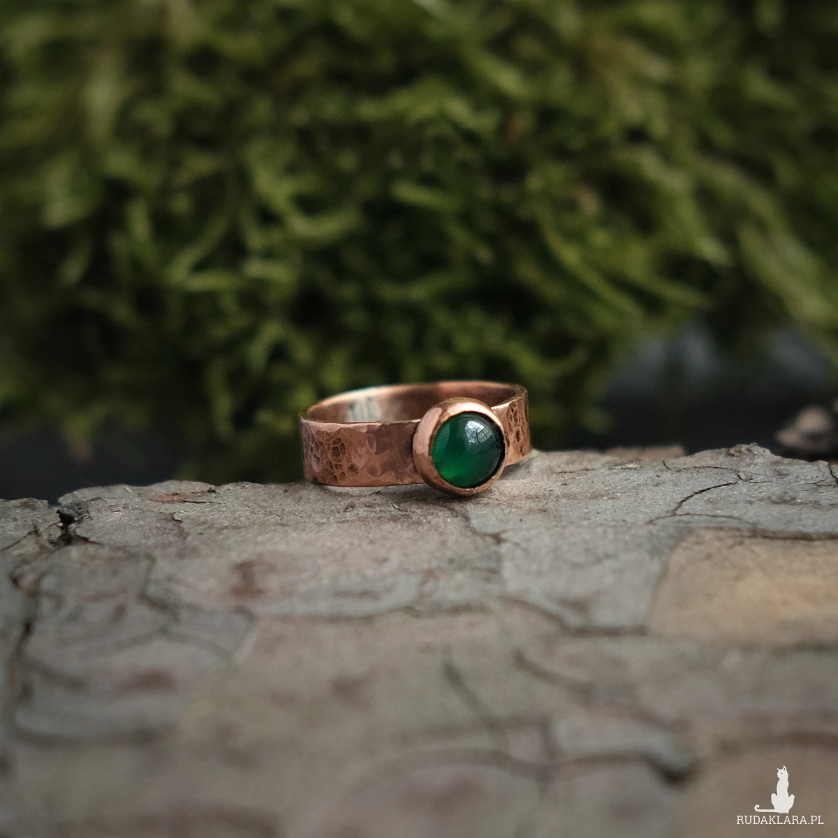 Pierścionek na fakturowanej obrączce mieści w sobie kamień zielonego onyksu. Pierścionek został wykonany ręcznie z miedzi, miedź poddałam oksydacji.