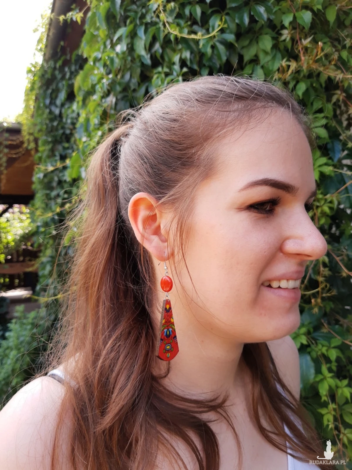 Kolczyki są wykonane ze sklejki drewnianej o grubości 3 mm i mimo swej wielkości są bardzo lekkie. Zostały ozdobione dwustronnie metodą decoupage’u, a następnie wielokrotnie pokryte lakierem akrylowym w celu zabezpieczenia i zapewnienia trwałości. Kilkakrotnie szlifowane, dzięki czemu mają jedwabistą, miłą w dotyku fakturę. Grafika nie ulega blaknięciu. Bigle antyalergiczne.