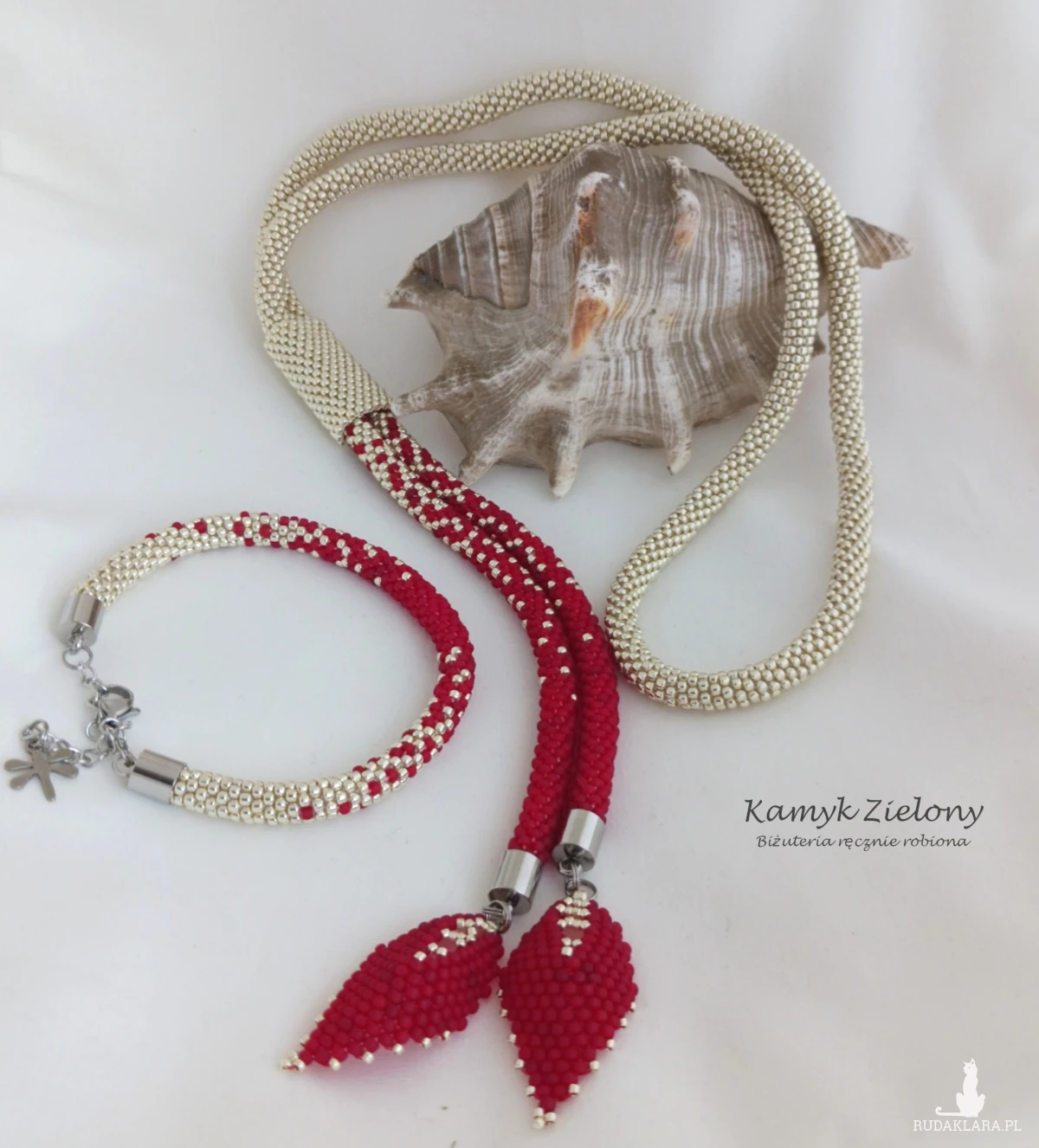 Całość powstała z 2-milimetrowych koralików Toho w kolorze jasnego srebra oraz matowej czerwieni. Do jego wykonania użyto wysokiej jakości koralików ze szkła. W przypadku koralików srebrnych, kolor został naniesiony fabrycznie metodą galwanizowania, dzięki czemu metaliczna, srebrna powłoka jest bardzo trwała.