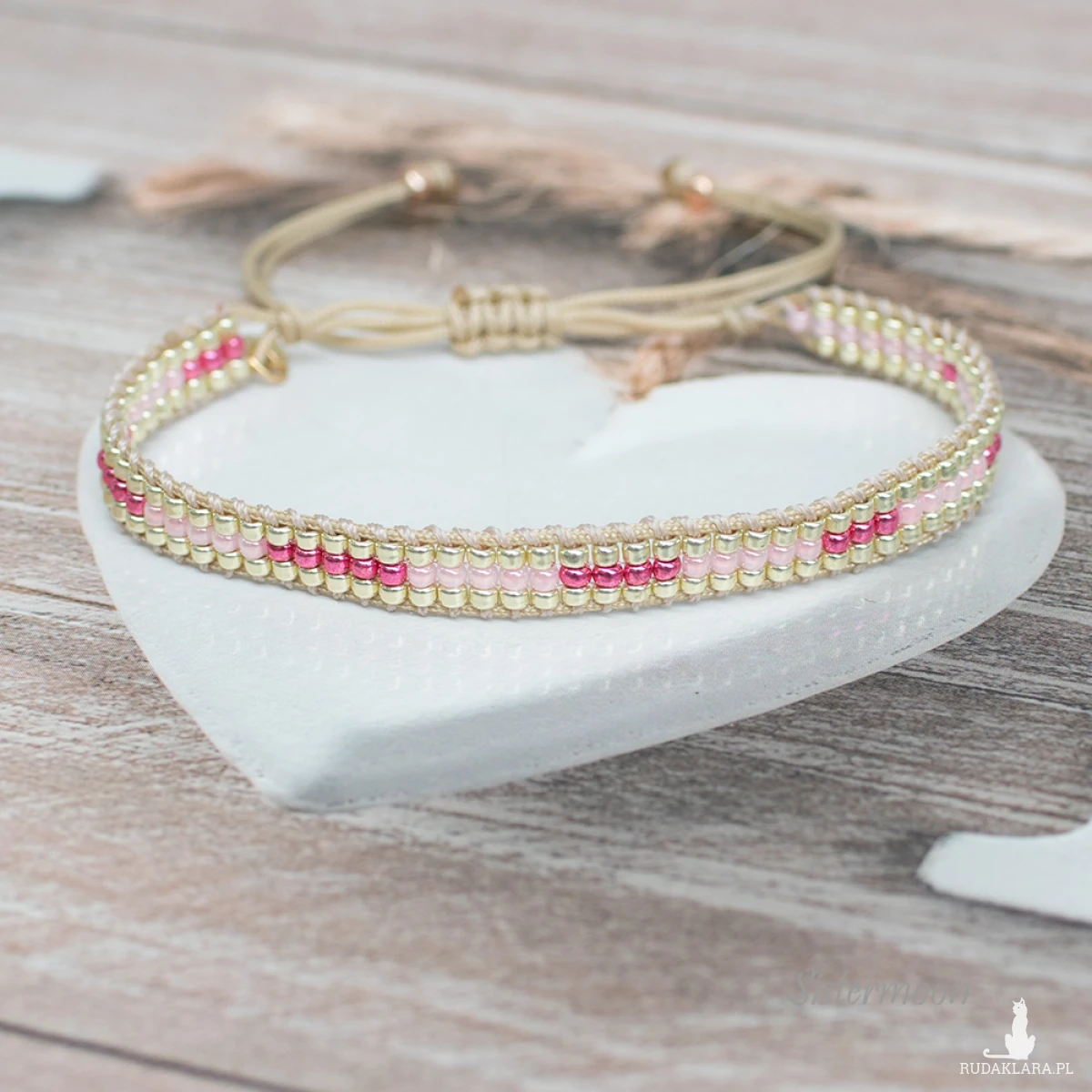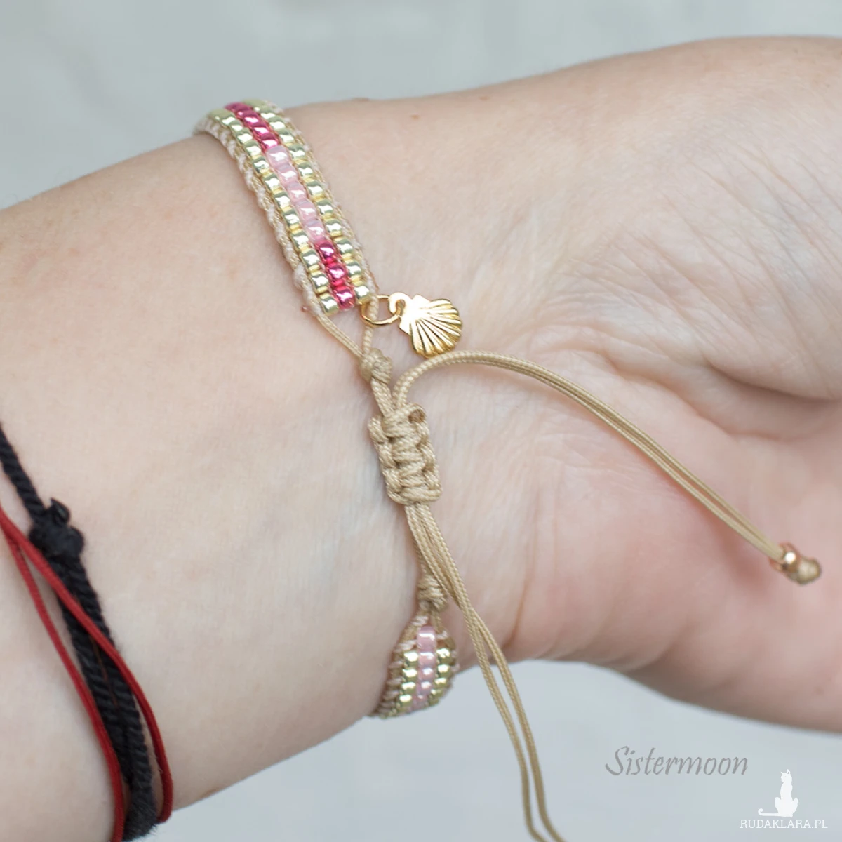 2. Bransoletka na bazie beżowego sznurka- mocny nierozciągliwy i nieblaknący cienki sznureczek- oraz nieścieralnych koralików Toho, stabilizowanych dodatkową nicią.