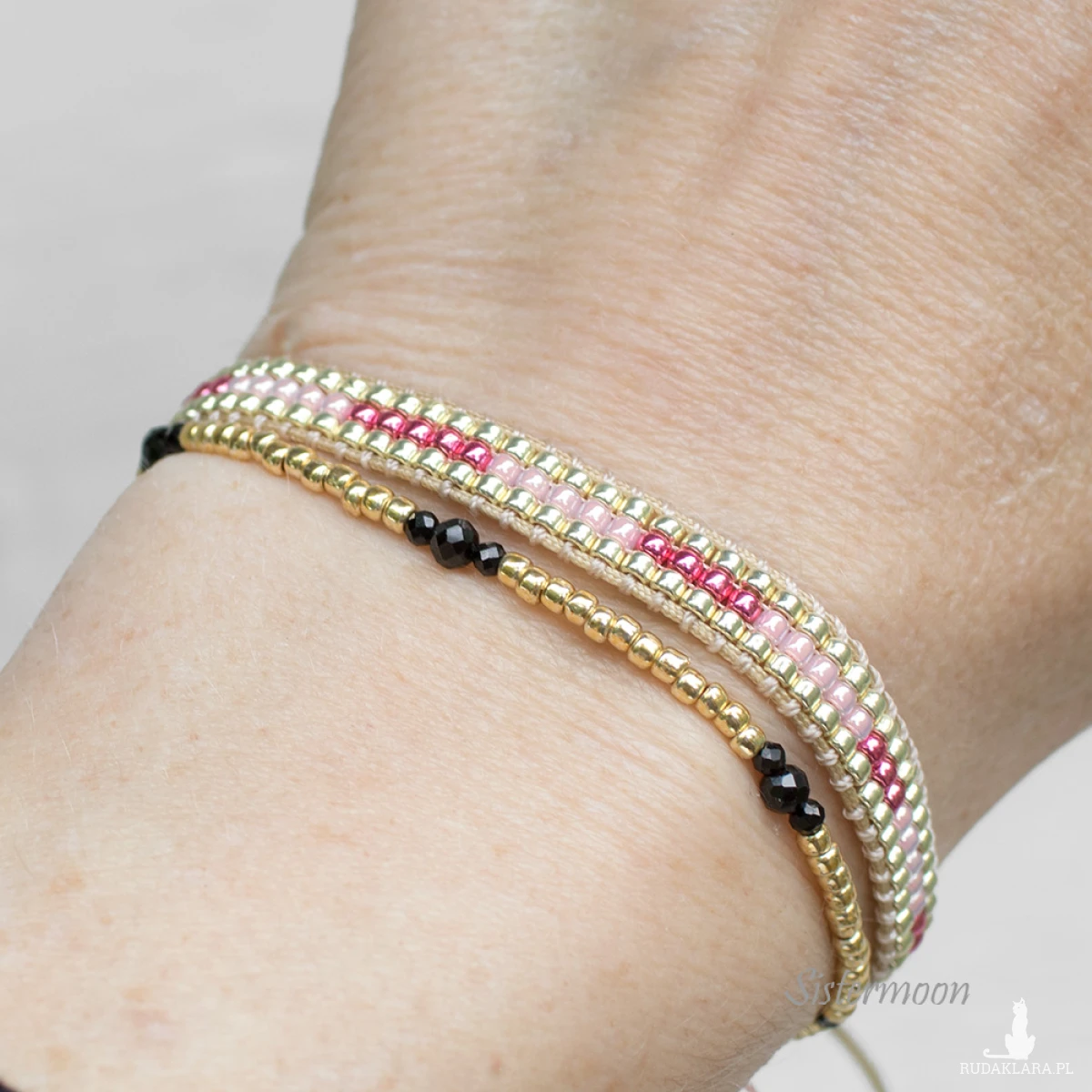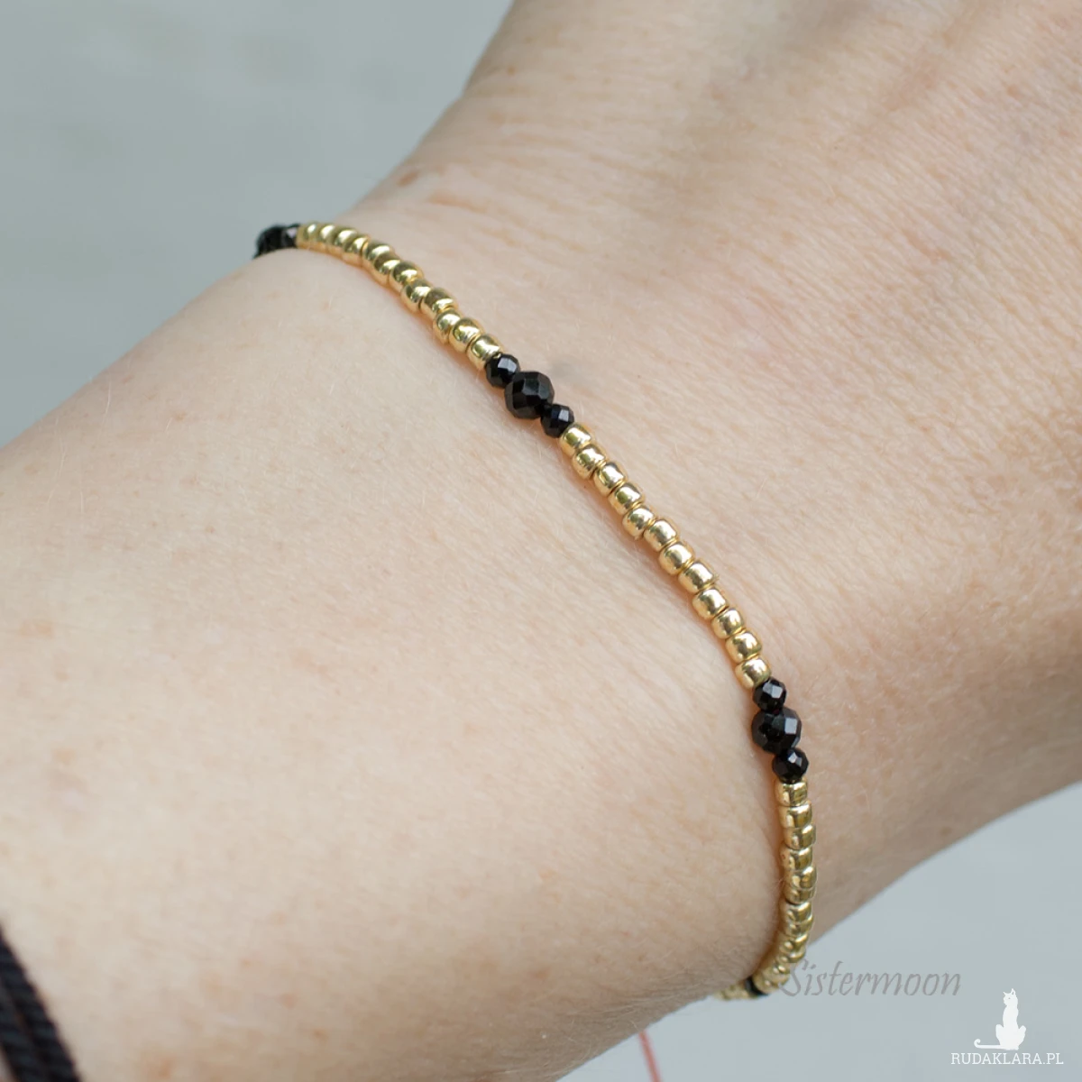 1. Bransoletka na Szczęście - cienki czerwony sznureczek woskowany, drobniutkie czarne fasetowane spinele, złote nieścieralne koraliki japońskie Toho