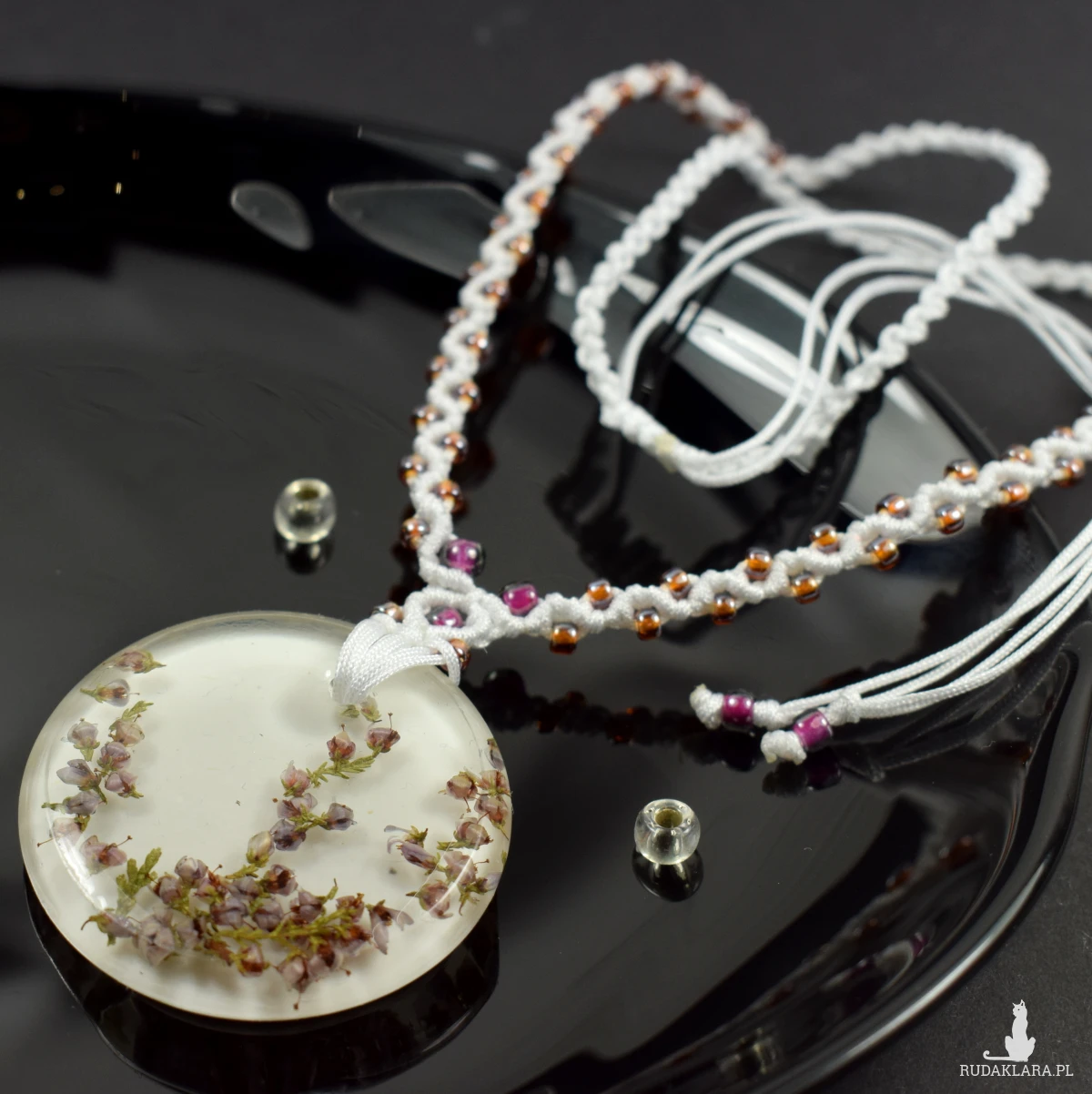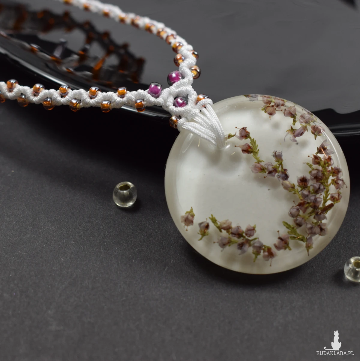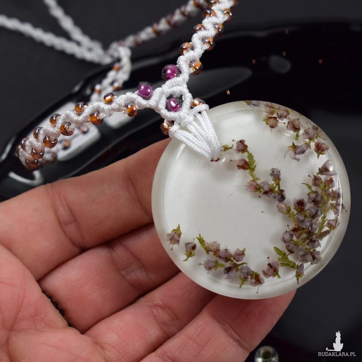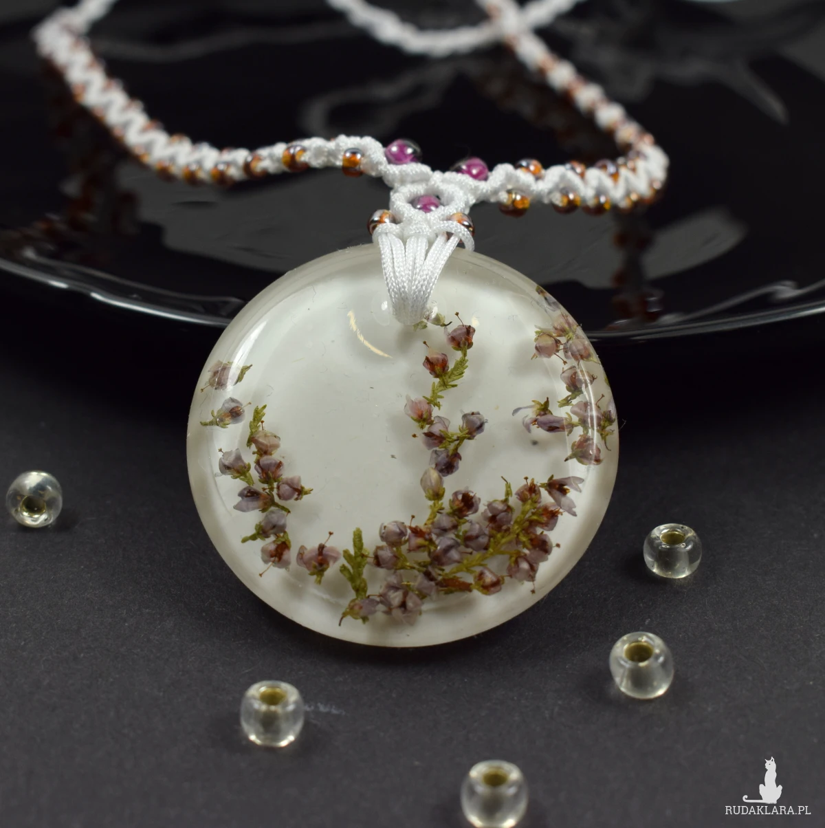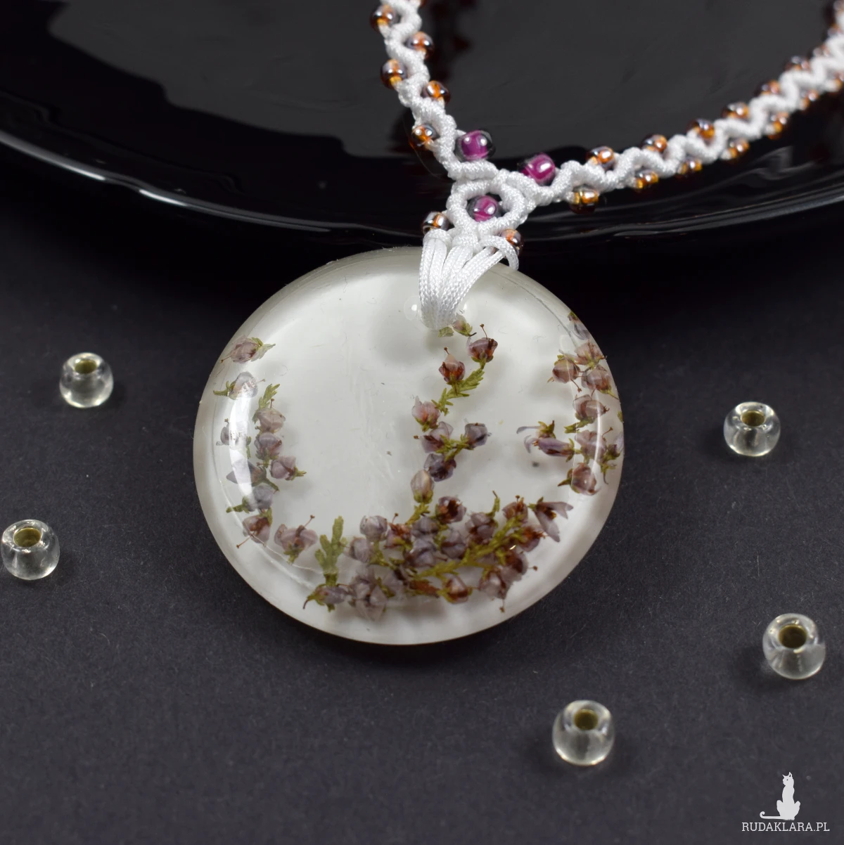 Duży wisiorek z zatopionymi kwiatami wrzosu w żywicy to niezwykły
