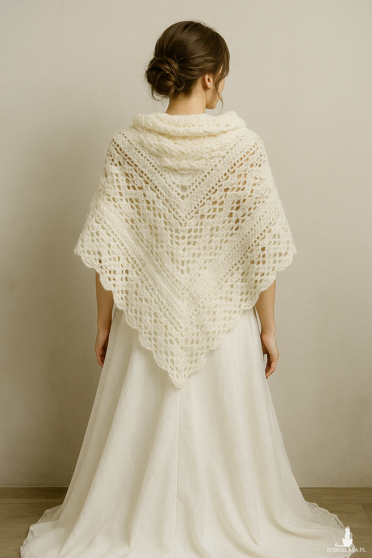 Ręcznie robiona chusta to artystyczne dopełnienie sukni ślubnej dodające jej uroku i romantyzmu. Wykonanie handmade sprawia, że jest niepowtarzalnym, wysokiej jakości dodatkiem, który uczyni ten dzień jeszcze bardziej niezapomnianym.