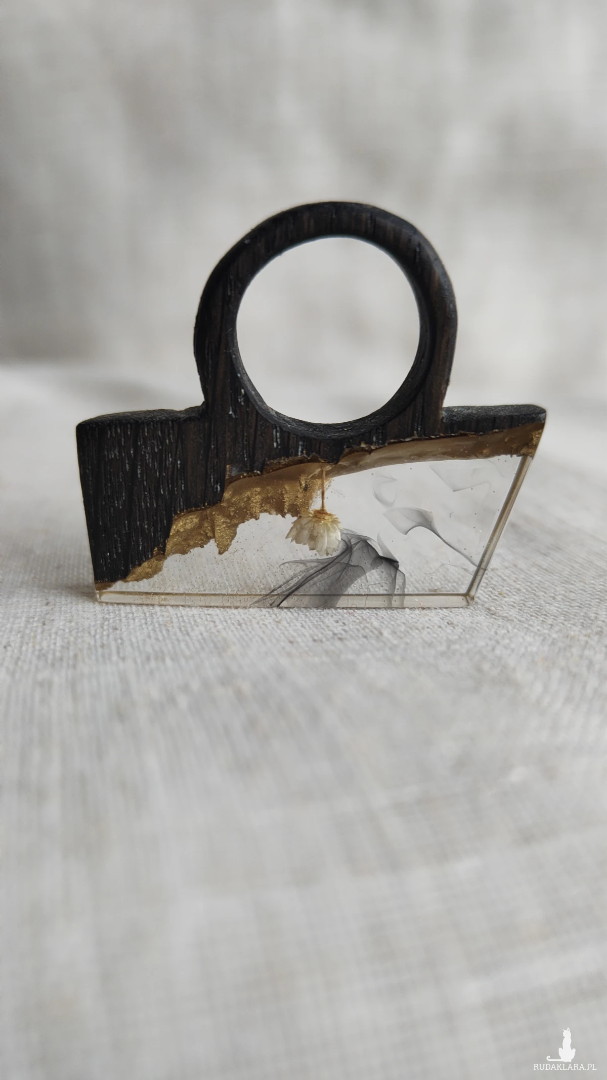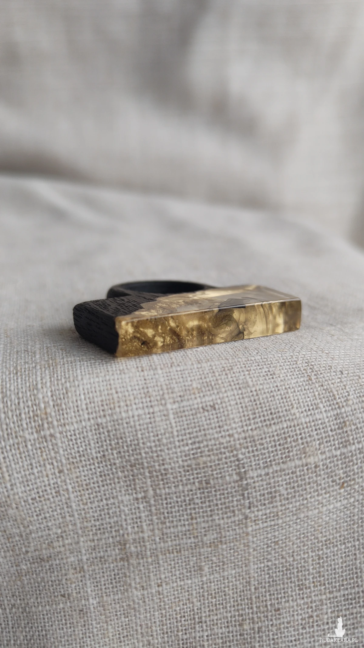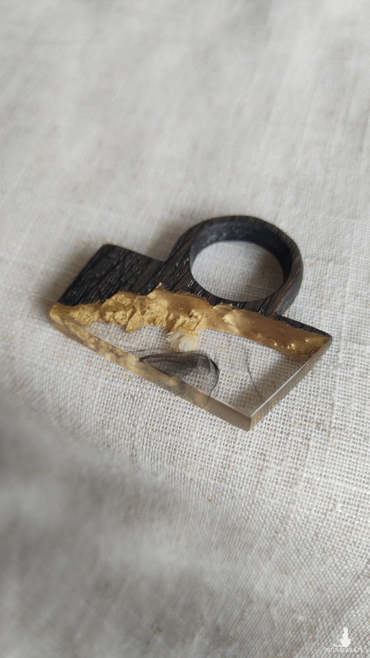 Ręcznie wykonany pierścionek z czarnego dębu, pokrytego złotą farbą, oraz krystalicznie przezroczystej żywicy epoksydowej.