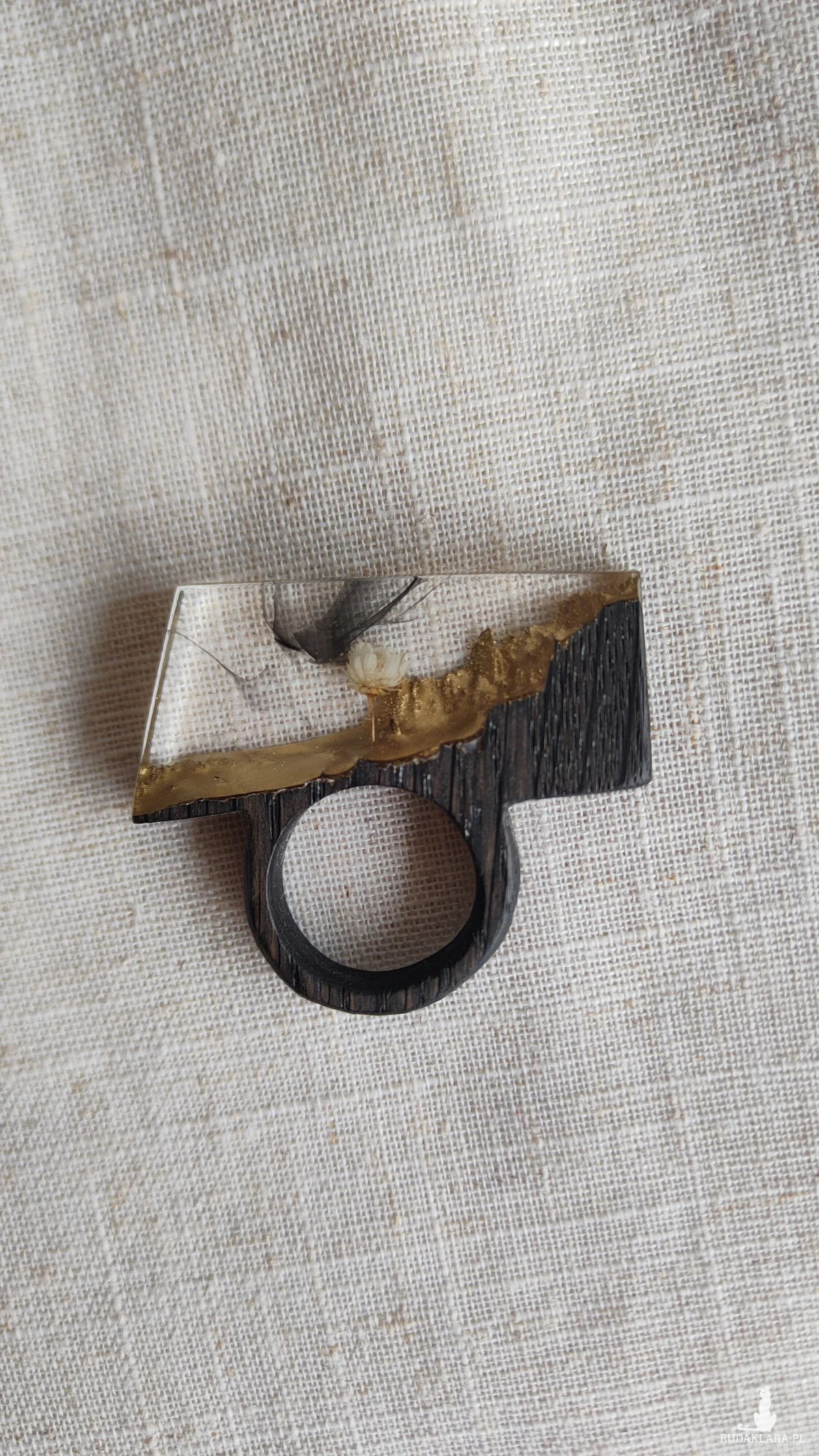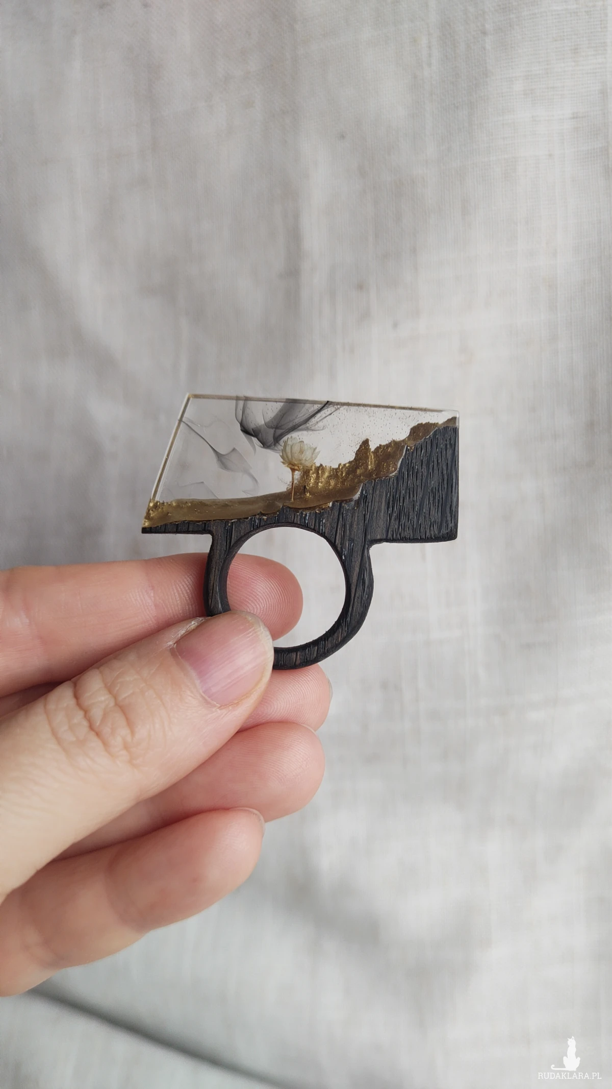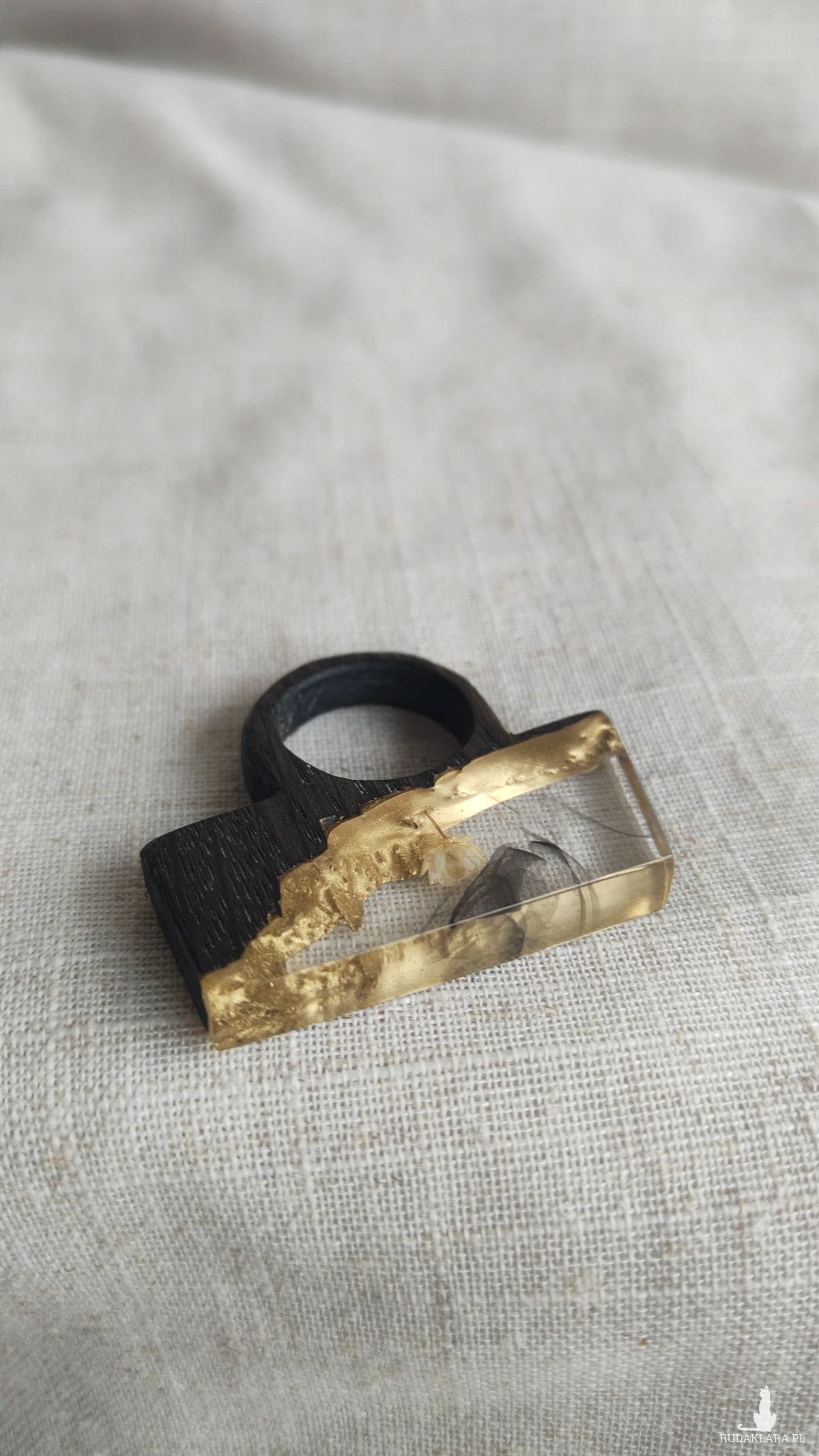 Ręcznie wykonany pierścionek z czarnego dębu, pokrytego złotą farbą, oraz krystalicznie przezroczystej żywicy epoksydowej.