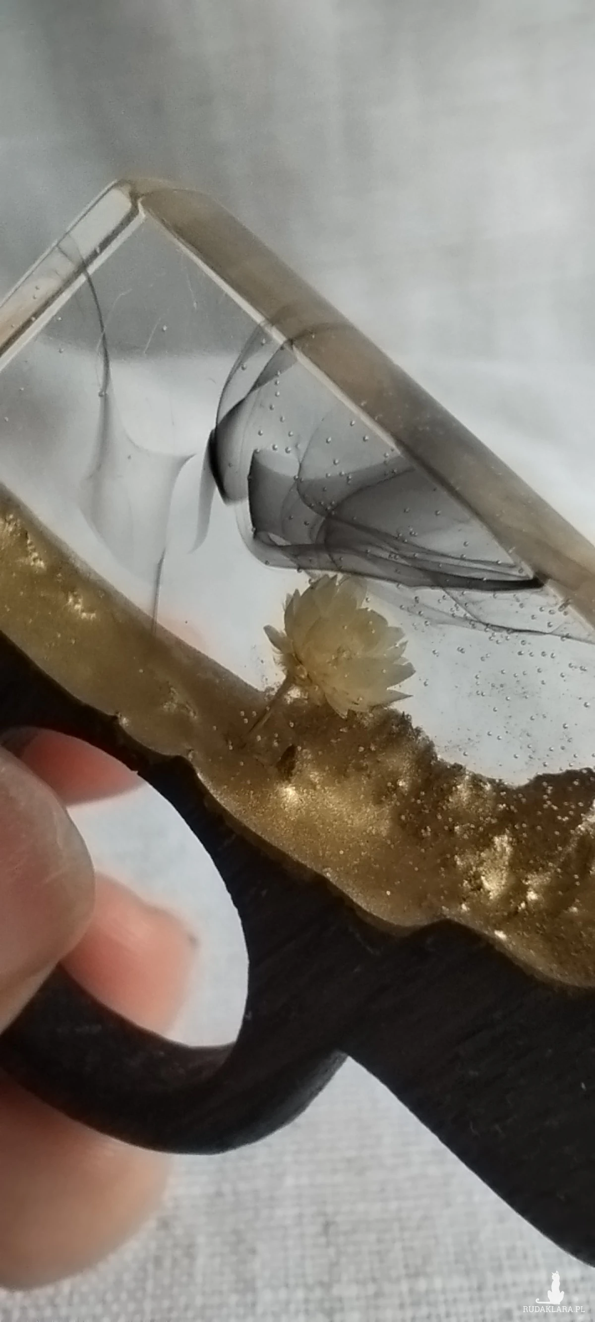 Wewnątrz żywicy znajduje się prawdziwy suszony kwiat, starannie umieszczony na tle złotej powierzchni drewna, tworząc kontrast między naturą a luksusem.