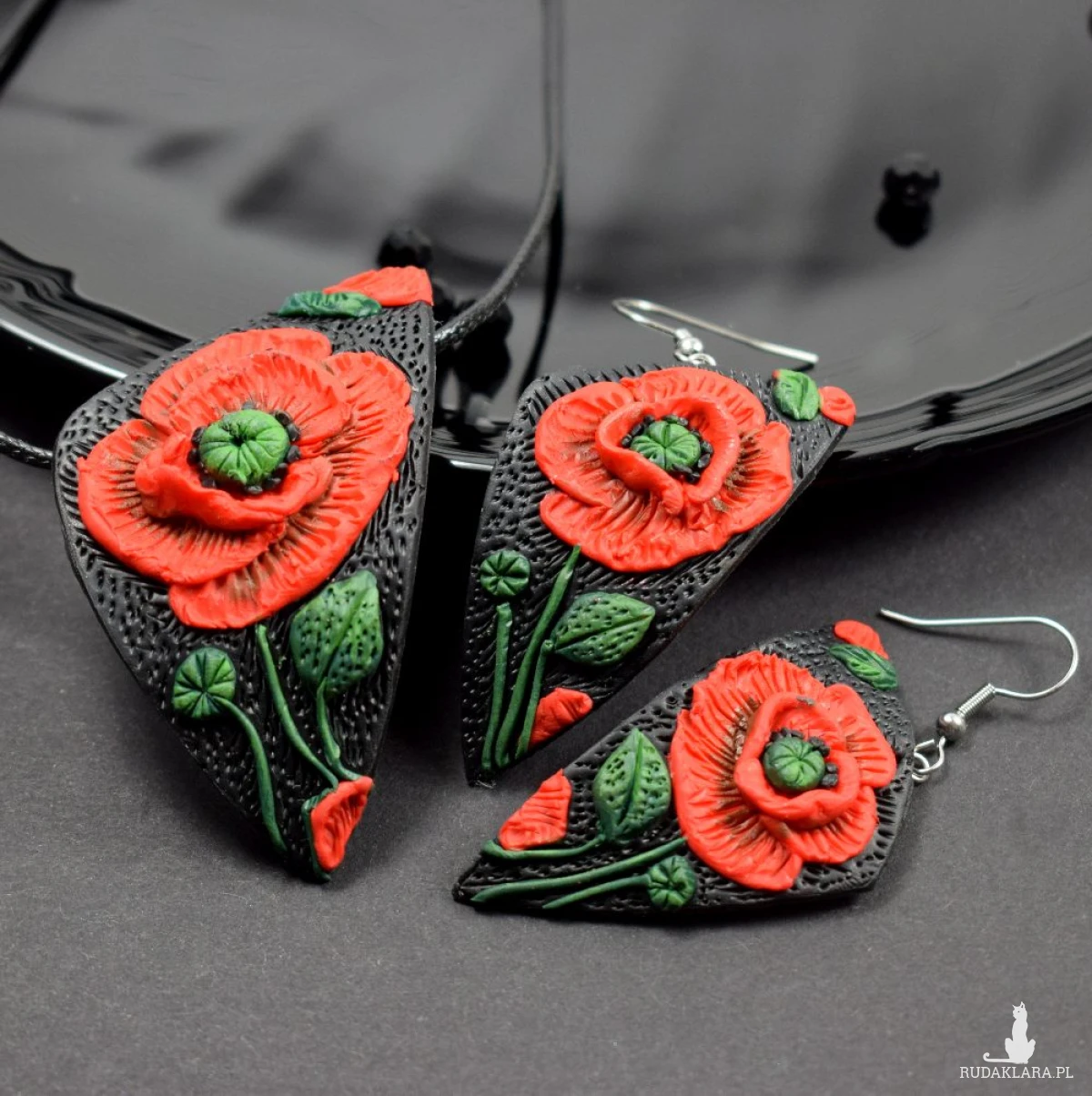 Wyjątkowy komplet biżuterii o asymetrycznym kształcie, z motywem kwiatów maku: naszyjnik, długie kolczyki i pierścionek.