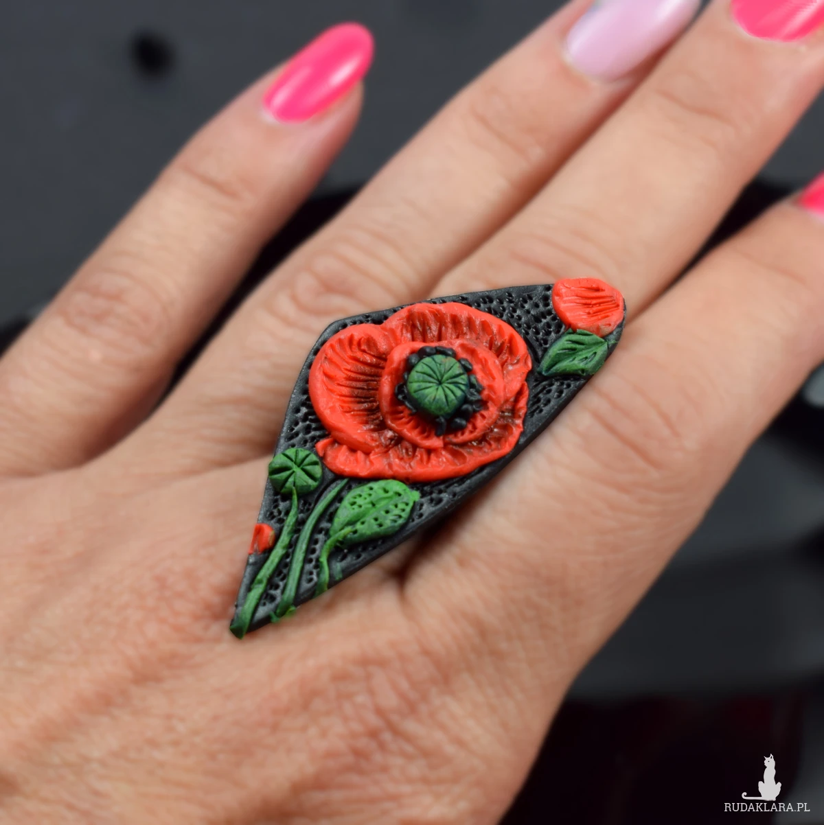 Duży, regulowany pierścionek z motywem kwiatu maku.