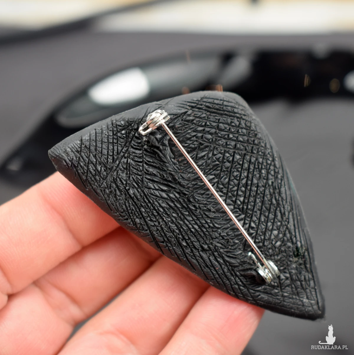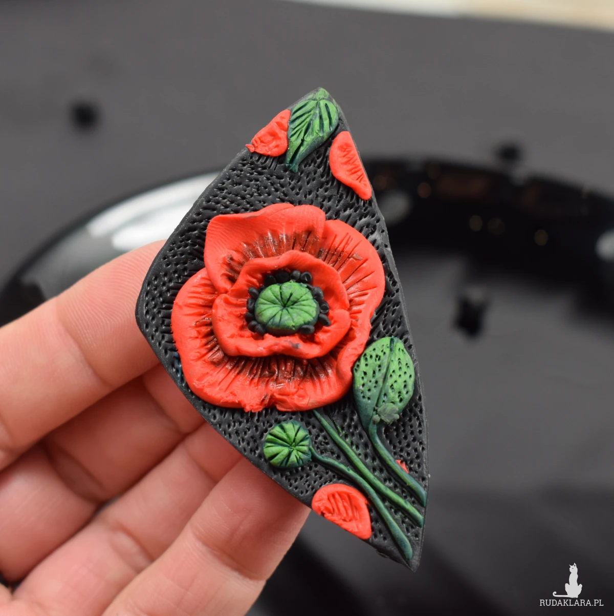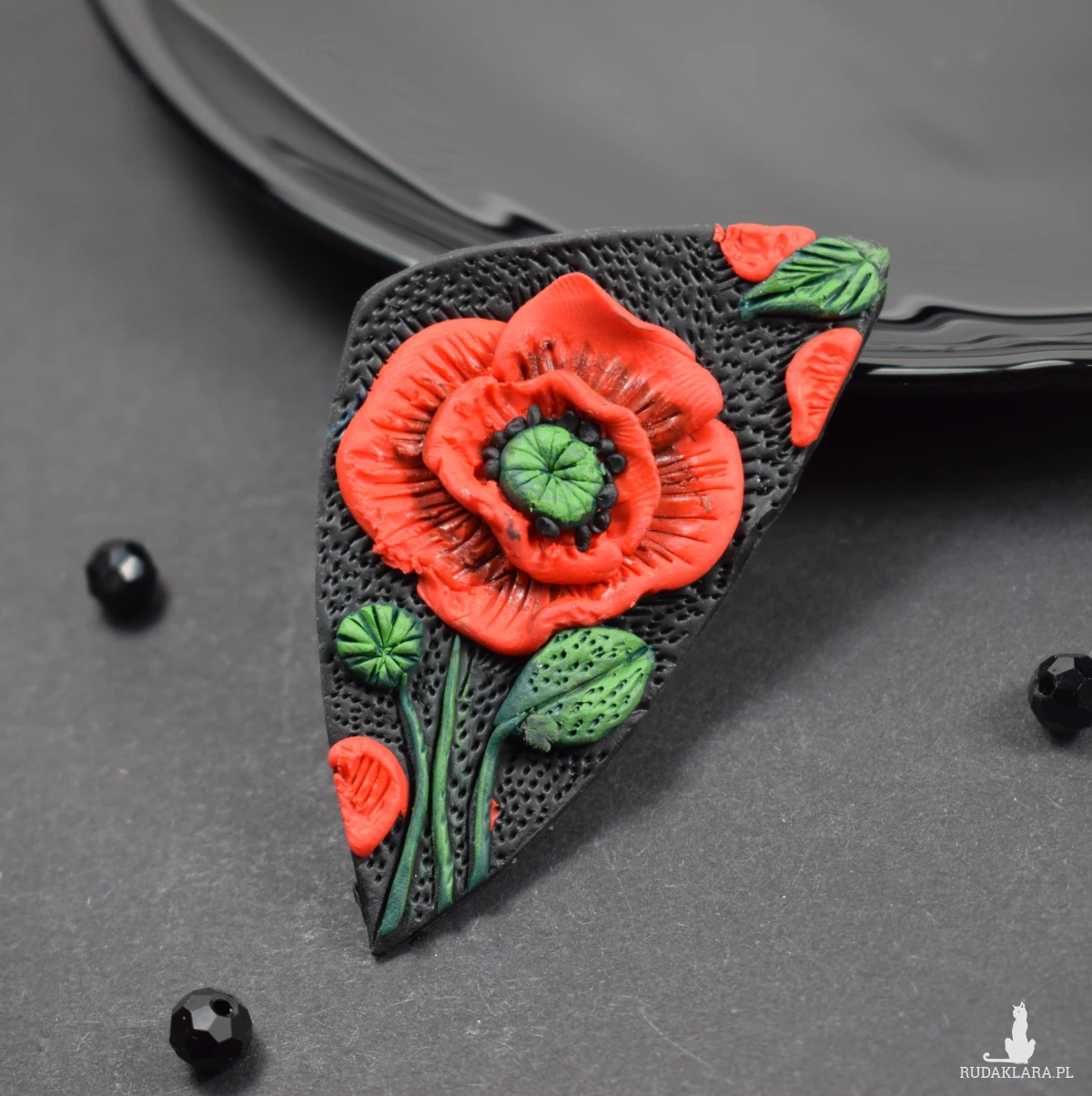 Wyjątkowa broszka o asymetrycznym kształcie, z motywem kwiatu maku.