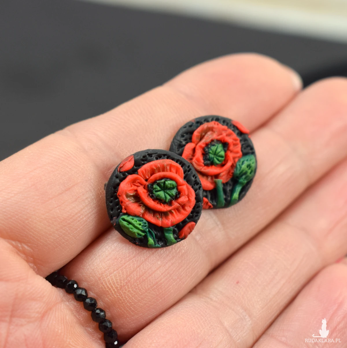 Wyjątkowy komplet biżuterii "czerwone maki", w skład którego wchodzi duży naszyjnik i kolczyki sztyfty.
