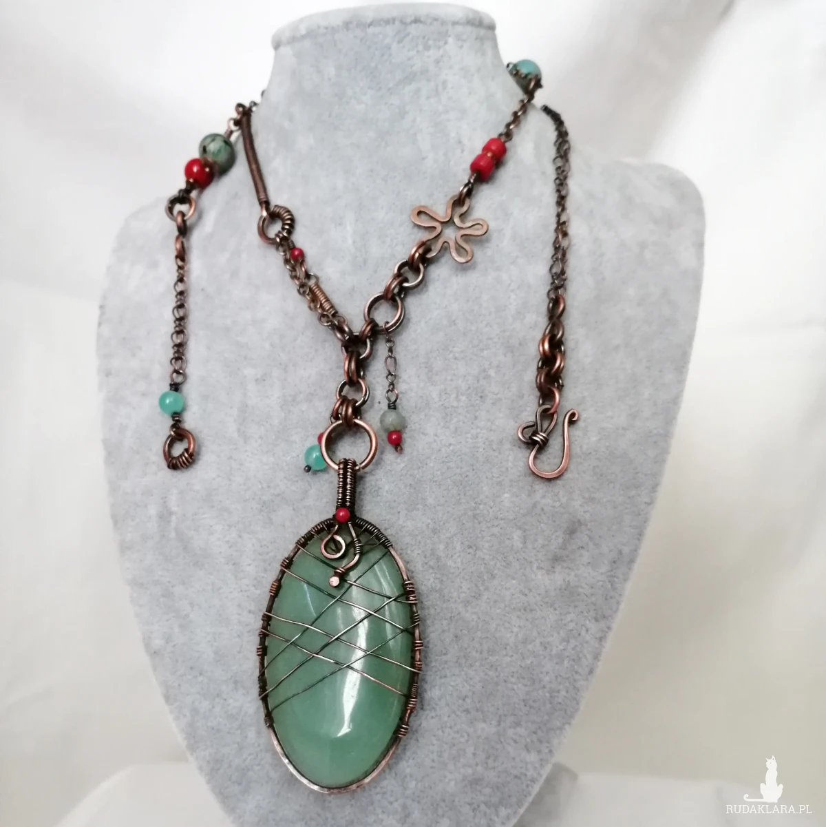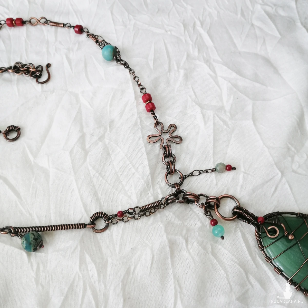 Naszyjnik boho wykonany z miedzi i kolorowych kamieni. W centrum znajduje się awenturyn o rozm. 60/40 mm. Elementy naszyjnika robione ręcznie, dodatkowo przyozdobione kamykami agatu (błękitny), jaspisu (niebieski w plamki), hematytu (małe dyski pomiędzy czerwonym koralem).