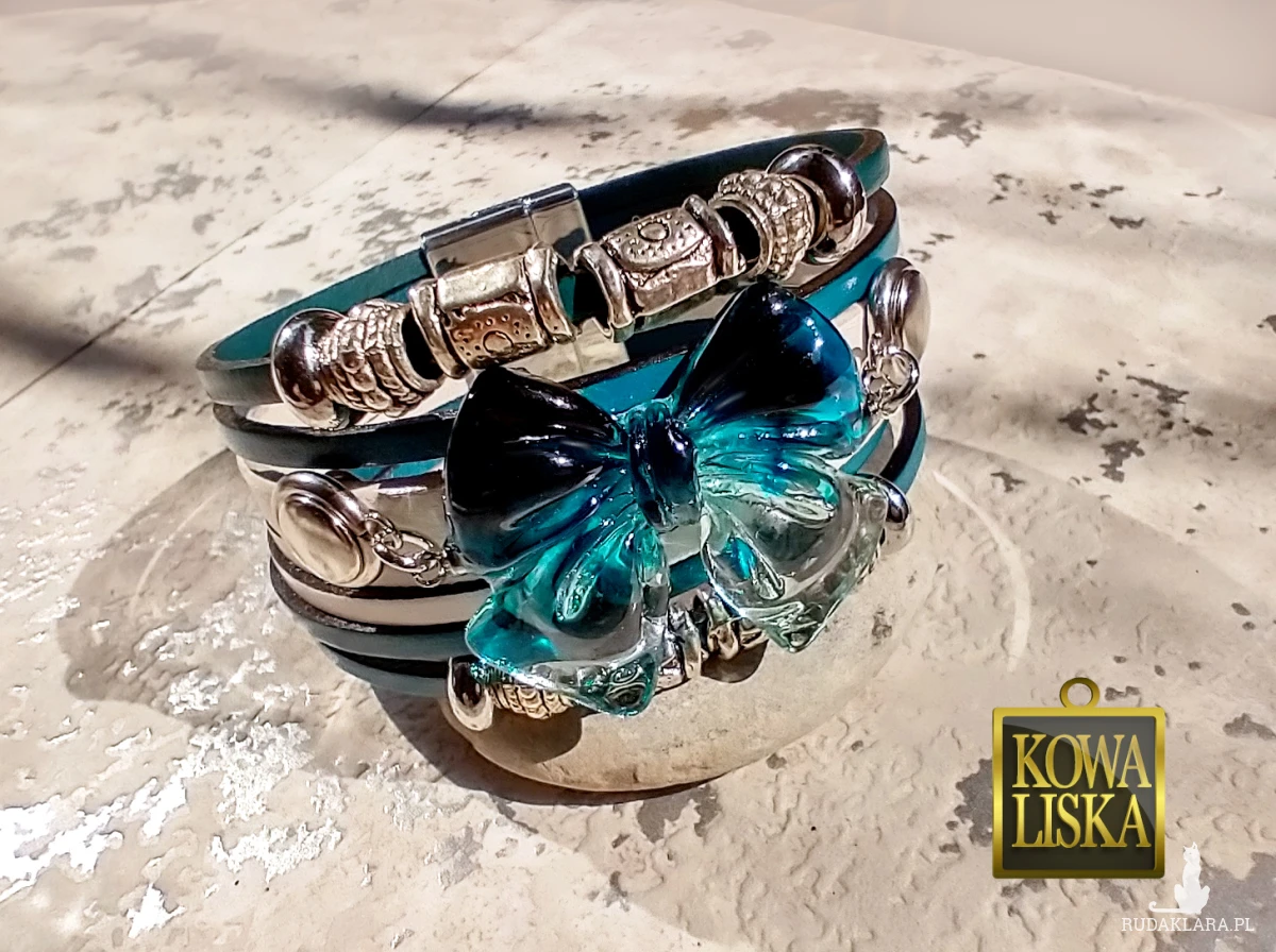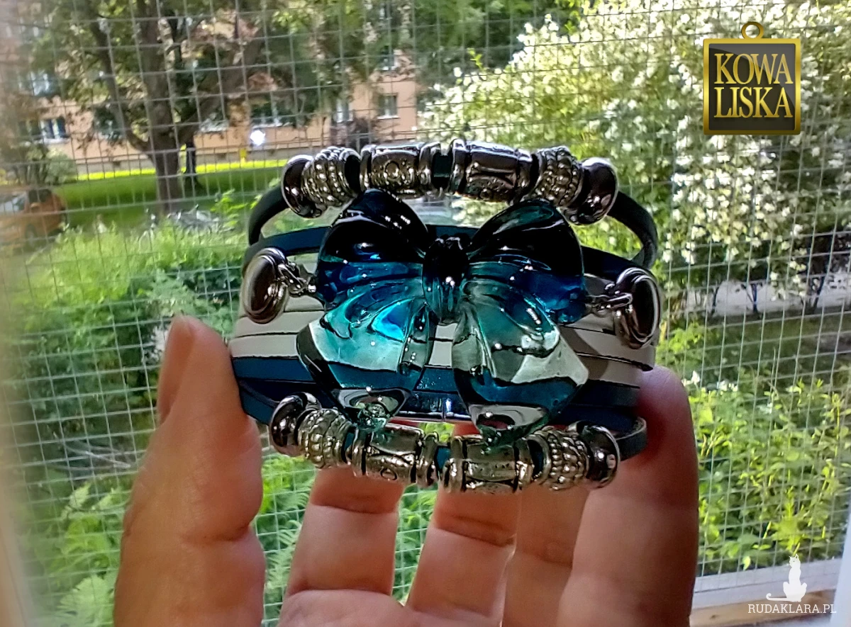 Piękna, żywiczna kokarda w przejrzystych odcieniach turkusu, zamontowana nitami na rzemiennych paskach, ozdobionych wyrazistymi, metalowymi przekładkami. Przekładki trzymają się w jednym miejscu dzięki stoperom, ale da się je dowolnie przesuwać.