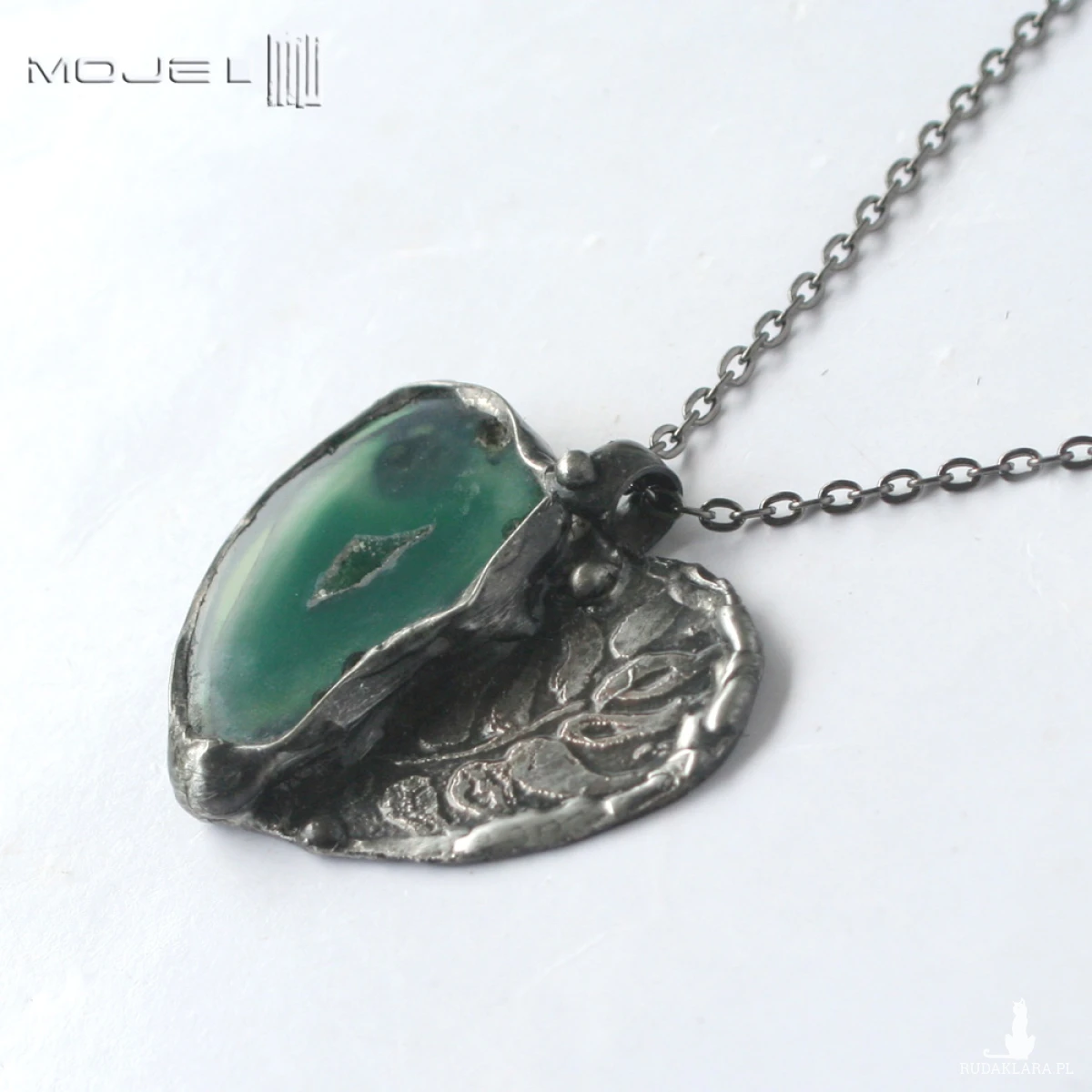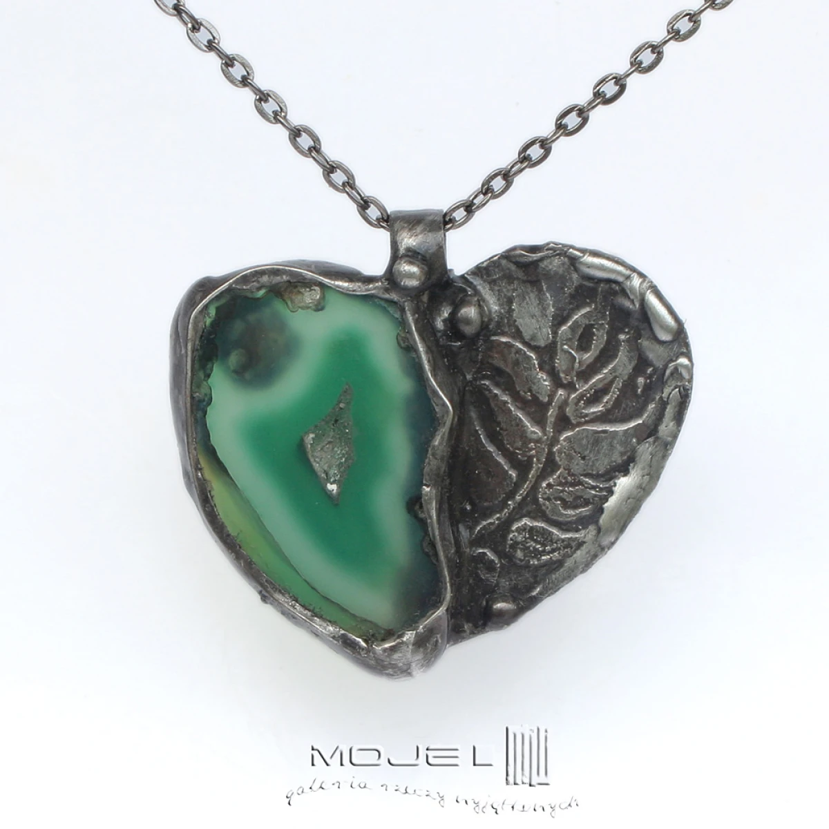 Wisior w kształcie serca uformowany z plastra agatu w pięknym zielonym kolorze i miedzi. Trawiony florystyczny wzór urozmaica powierzchnię metalu. Wisior zawieszony jest na łańcuszku w kolorze grafitowym. Zazwyczaj dodaję łańcuszek o długości ok. 60-70 cm, ale klient może podać długość, która go interesuje.