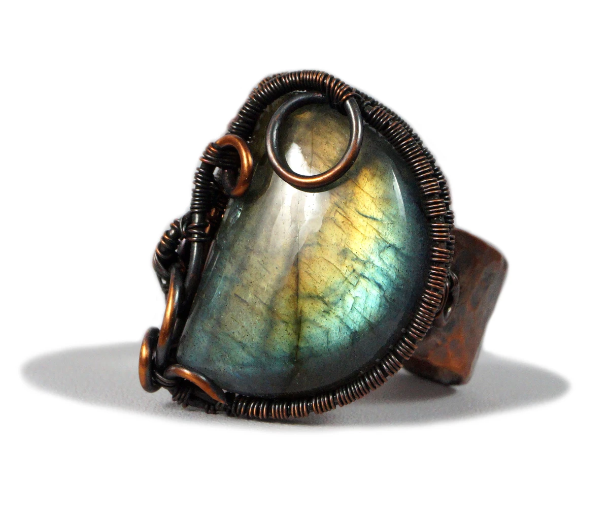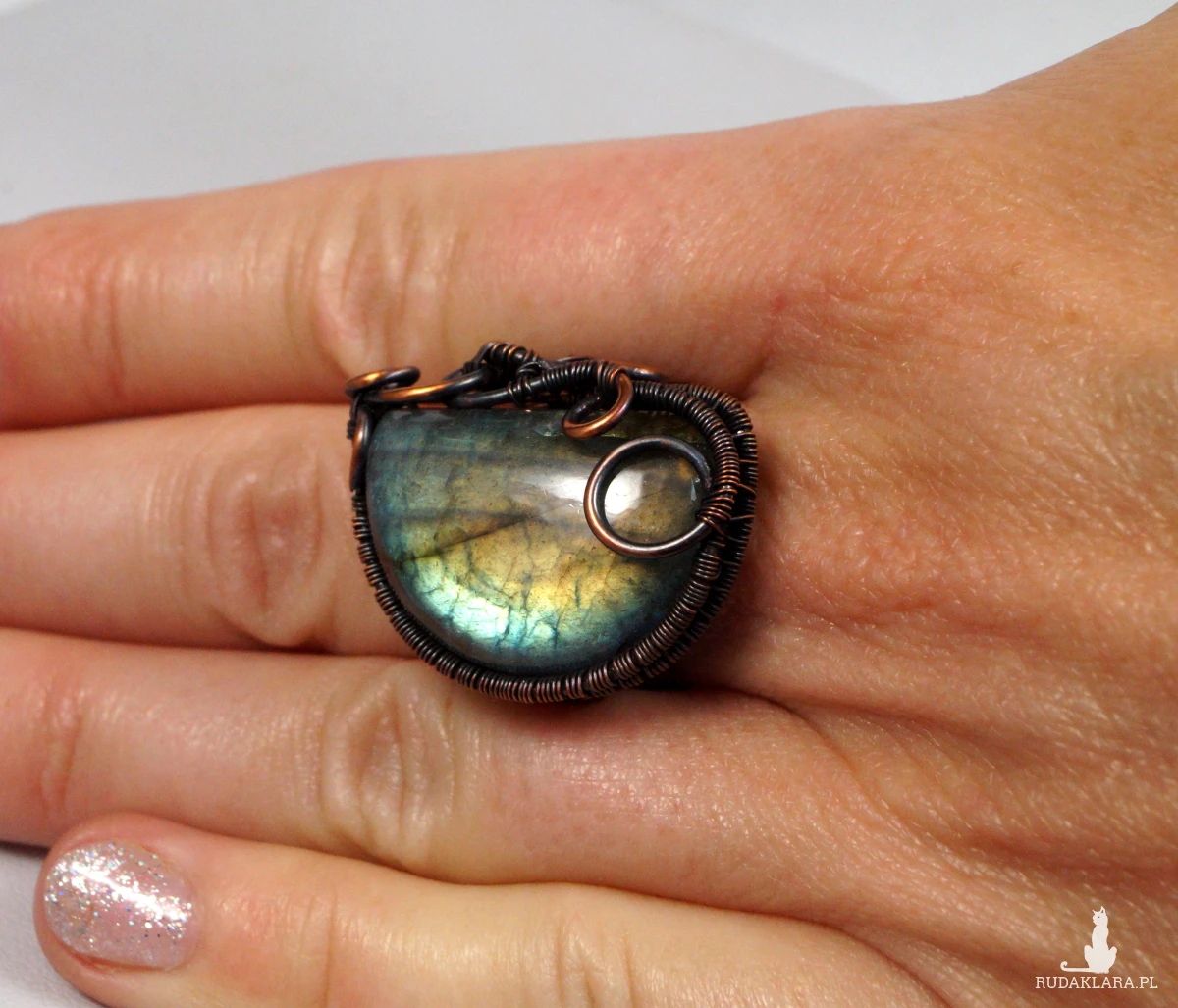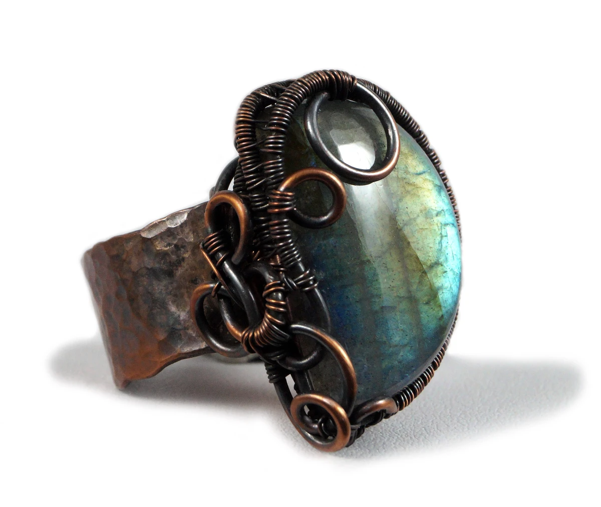Misternie wykonany pierścionek z niebiesko żółtym labradorytem. Obrączka wykonana z młotkowanej miedzi i z kaboszonem labradorytu osadzonego w technice wire wrapping.